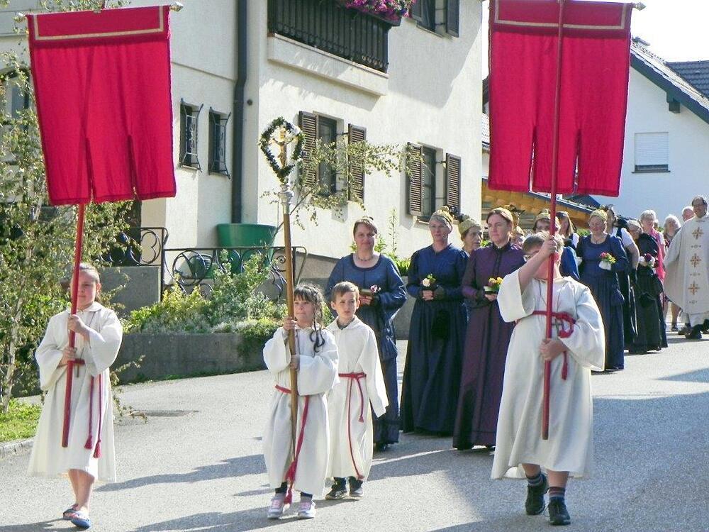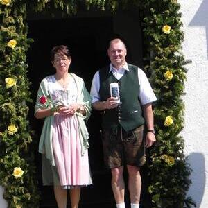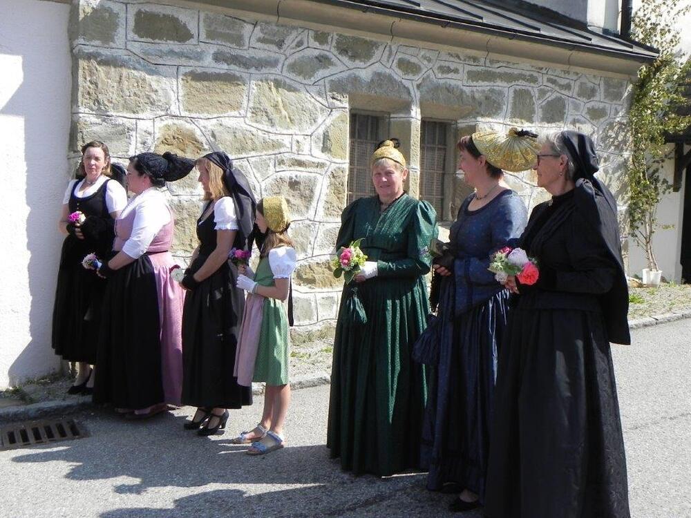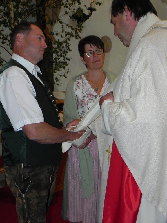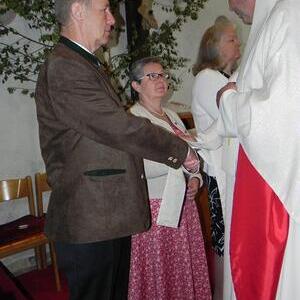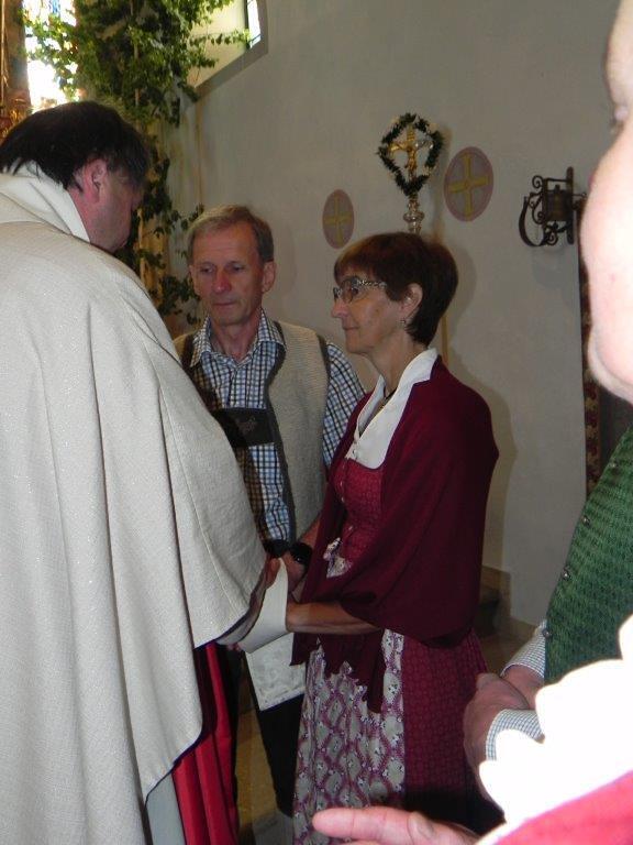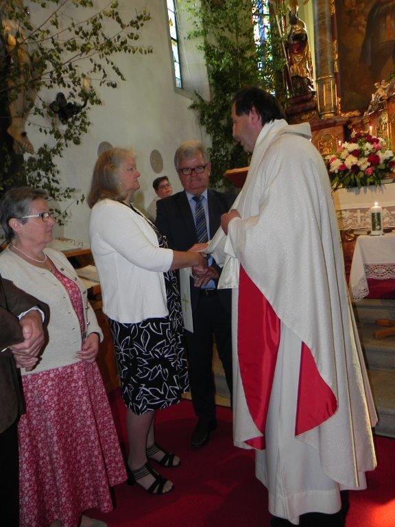 Gerne folgten 6 Paare der Einladung von Pfarre und Gemeinde zur gemeinsamen Feier der Ehejubilare am Sonntag. Ein goldenes, vier rubinene und ein silbernes Jubelpaar zogen mit einer großen Schar von Goldhauben- und Kopftuchfrauen mit den Ministranten bei strahlendem Sonnenschein unter den Klängen eines Bläserensembles in die schön geschmückte Kirche ein. Der Kirchenchor bereicherte mit seinen gefühlsvollen Liedern die Feier und trugen zur guten Stimmung bei. Bei der Jubeltrauung segnete P. Leopold jedes Paar für eine schöne, weitere gemeinsame Zukunft. Bürgermeister Schönberger dankte in seiner Ansprache den Jubilaren für ihr Wirken in der Familie, dem Beruf und den verschiedenen öffentlichen Bereichen. Von den Ministranten vorgetragene Gedichte rundeten die Feier ab. Zur Erinnerung an ihr Jubelfest erhielten die Jubelpaare von der KFB eine von Petra Mehlig verzierte Jubelkerze sowie ein Dankesblatt und eine rote Rose, damit die Liebe auch weiterhin blühe.