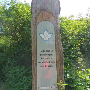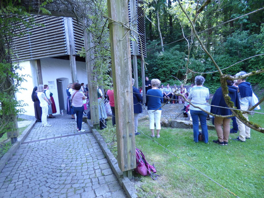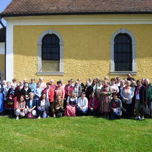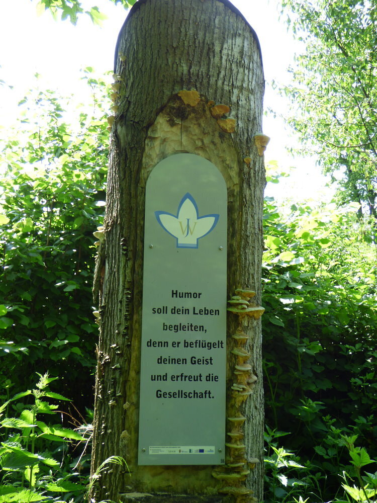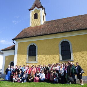 Kein berühmter Wallfahrtsort und kein pompöses Museum waren das Ziel der KFB-Wallfahrt am Pfingstsamstag, sondern das Machland im östlichen Oberösterreich am linken Ufer der Donau. In diese eher unbekannte Region fuhren fast fünfzig Frauen aus den Almtalpfarren St. Konrad, Grünau, Scharnstein und Viechtwang. Während der Fahrt in einem komfortablen Reisebus der Firma Fröch auf der A1 nach Mauthausen, über die Donaubrücke bis nach Naarn beteten wir im Bus den Rosenkranz, bereichert um gehaltvolle Texte und vertraute Marienlieder. Die hl. Messe feierten wir in Maria Laab, einer Wallfahrtskirche mit dem Gnadenbild, das die Krönung Mariens zeigt. Das Altarbild stammt aus dem 16. Jahrhundert, die Kirche selber wurde vor über 100 Jahren im Stil der Beuroner-Kunstschule ausgemalt. Die Kirche war für unsere Gruppe sehr gut geeignet, mit kräftigem Gesang wurde die Messe gefeiert. Anschließend fuhren wir zum nur zweihundert Meter entfernten „kleinen Johannesweg“, der sich in einem ebenen Wäldchen befindet. Der Rundgang im Wald, der durch Säulen mit Sinnsprüchen gestaltet ist, brachte manche zum Nachdenken, aber auch zum Schmunzeln (vgl Fotos). In Mitterkirchen, das vor zwanzig Jahren von dem verheerenden Donauhochwasser heimgesucht wurde, aßen wir zu Mittag, um anschließend Richtung Bad Zell aufzubrechen. Dort besuchten wir das Hedwigs-Gartl mit einer Vielfalt von Kräutern. Im Verkaufsraum konnte unter fachkundiger Führung manches Heilmittel erworben werden. Der nächste Programmpunkt war das Hedwigs-Bründl mit dem heilenden Wasser, der Ursprung des heutigen Kur- und Gesundheitshotels in Bad Zell. Dort hielten wir eine kurze Andacht.