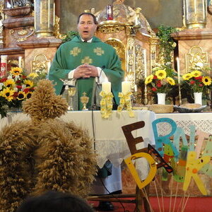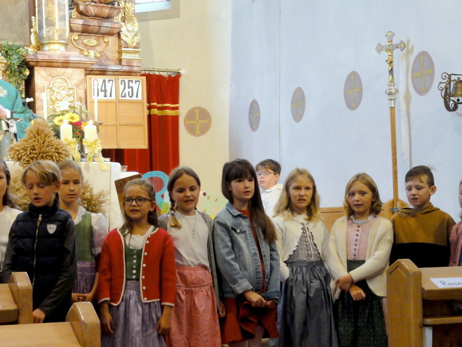 Gerade in der Zeit materiellen Überflusses ist das jährliche, im Herbst gefeierte Erntedankfest eine wertvolle Hilfe, zur Dankbarkeit zu finden und das Empfangen und Gelingen gemeinsam zu feiern. Schon einige Tage vor dem Erntedanksonntag, am 19. September, banden fleißige Hände die Erntekrone. Am Festtag trugen Firmlinge die Krone, begleitet von der Musikkapelle, den Goldhaubenfrauen, Schulkindern der 3. und 4. Klasse mit ihrer Religionslehrerin Bettina Lehner, in die Kirche. Der Kirchenchor und der kräftige und erfrischende Chor der Volksschüler umrahmten die Messe musikalisch. Mit einem Akrostichon erklärten die Volksschüler den Sinn des Erntedankfestes und brachten zu den Fürbitten die verschiedensten Brotsorten mit Nöten und Bedürfnissen der Menschen in Verbindung.