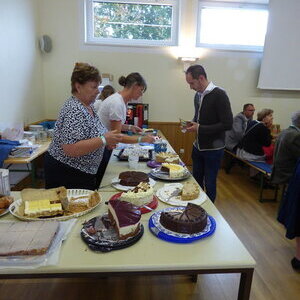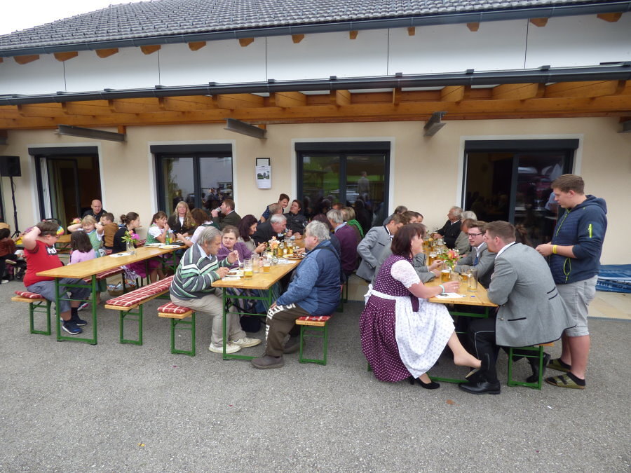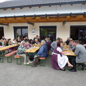 Nach der Feier boten die Goldhaubenfrauen Bauernkrapfen an. Anschließend fand das bei der BH-Gmunden angemeldete Pfarrfest im Pfarrheim statt. Für Speis und Trank war bestens gesorgt. Die Grillmeister Karl Gillesberger und Reinhard Leeb grillten Schopf und Käsekrainer in gewohnter Würzigkeit und Zartheit. Pommes begeisterten nicht nur junge Besucher. Die hervorragenden Torten und Kuchen fanden viele Abnehmer. Eine kleine Gruppe der Musikkapelle sorgte für die musikalische Unterhaltung und gute Stimmung. Bevor die Veranstaltung dem Ende zuging, wurden dem ehem. VS-Leiter Kurt Pesendorfer und seiner Gattin Lia zum fünfzigjährigen Heimatjubiläum von St. Konrad gratuliert. So ging das Pfarrfest heiter und beschwingt in den Nachmittagsstunden zu Ende. Vergelt's Gott den Mitgliedern des Pfarrgemeinderates und allen Helferinnen und Helfern.