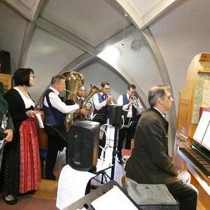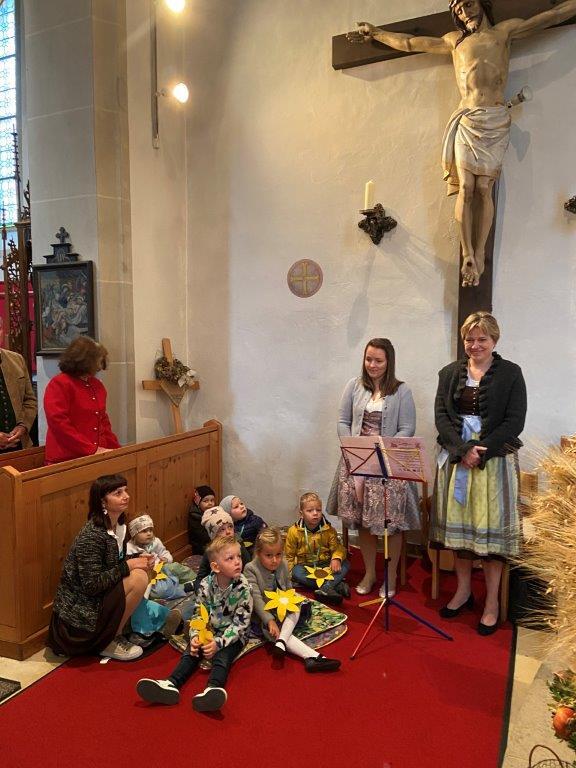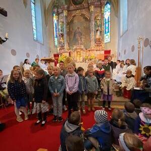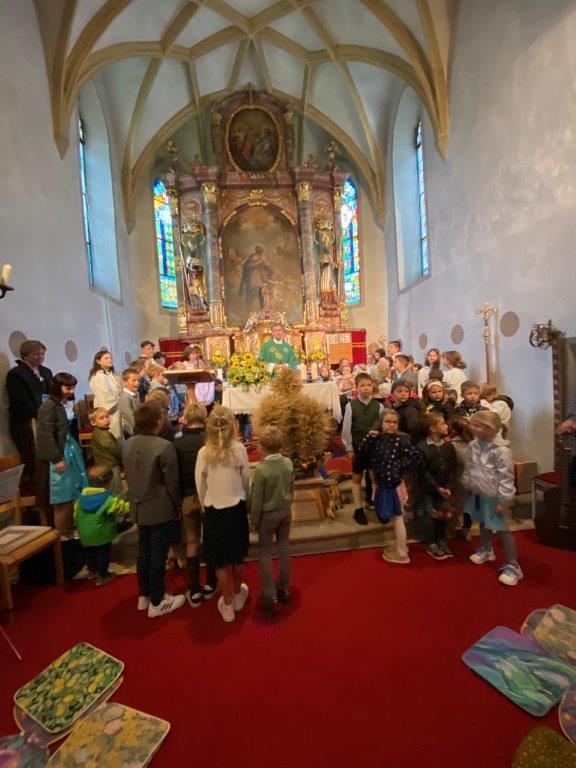 Mit der Musikkapelle St.Konrad zog die Schar von Kindergarten- und Schulkindern mit den Goldhauben, den Ministranten, den Firmlingen mit der Erntekrone sowie vielen Eltern und Großeltern in die Kirche ein, wo die Schar vom Kirchenchor begrüßt worden ist, der unterstützt von den Trompetern der Ortsmusik die Messe musikalisch begleitete.