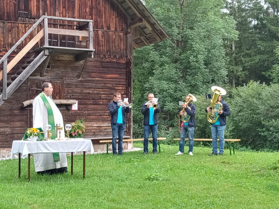 Seit über zwanzig Jahren ladet die Katholische Männerbewegung Sankt Konrad zur Sonntagsmesse in die Schrattenau ein. In den vergangenen Jahren leitete die Messe die Sommerferien ein, heuer das letzte Drittel, weil im Juli das regnerische Wetter die Feier verhinderte. So kamen wir am 22. August auf dem Gelände des alten königlichen Jagdschlosses Schratten zusammen. Leider hatte es am Morgen dieses Sonntages in einigen Teilen des Einzugsgebietes geregnet. Trotzdem kamen fast 90 Mitfeiernde aus Scharnstein, Viechtwang, St. Konrad, Grünau, Gschwandt, Kirchham und darüber hinaus zum Lobpreis des Schöpfers und Erlöser zusammen. Das Bläserquartett der Musikkapelle St. Konrad unter der Leitung von Christian Hummer gestaltete die Messe musikalisch. Nach der geistigen Nahrung konnten wir uns für den Abstieg mit Knacker und Semmeln stärken. Vergelt´s Gott den Vorstandsmitgliedern der Männerbewegung und ihren Helferinnen für den Transport der Bänke und für die Besorgung und Zurverfügungstellung des Verpflegungsproviantes.