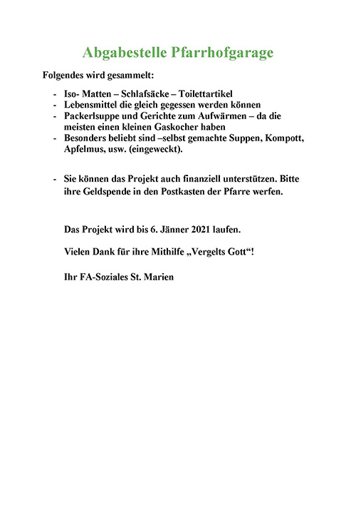 Es ist jedoch eine Sammlung organisiert. Gerne werden die benötigten Materialien laut der im Anhang befindlichen Liste in der Pfarrhofgarage gesammelt.