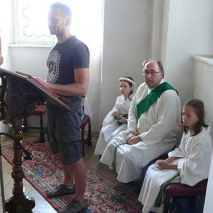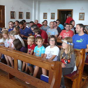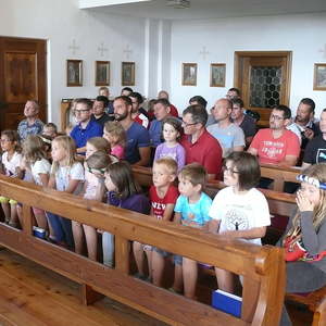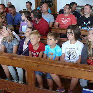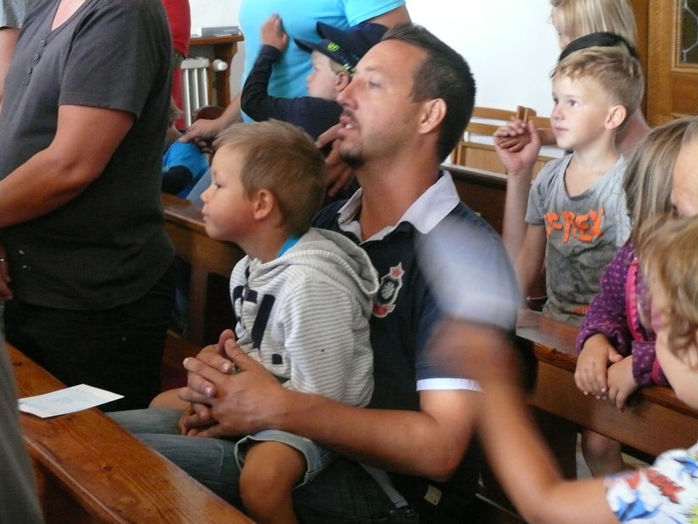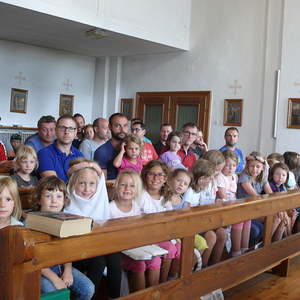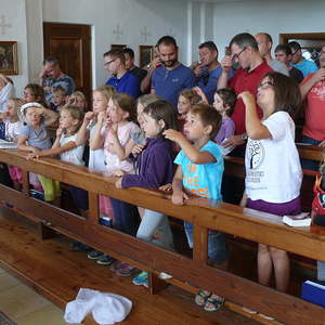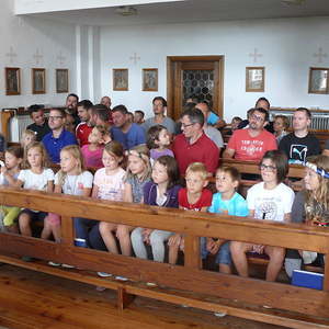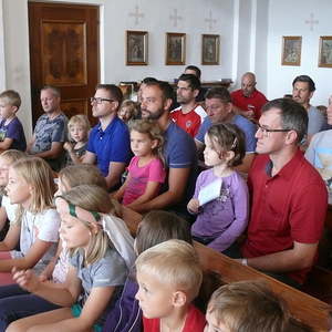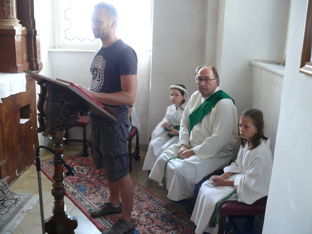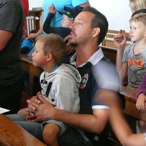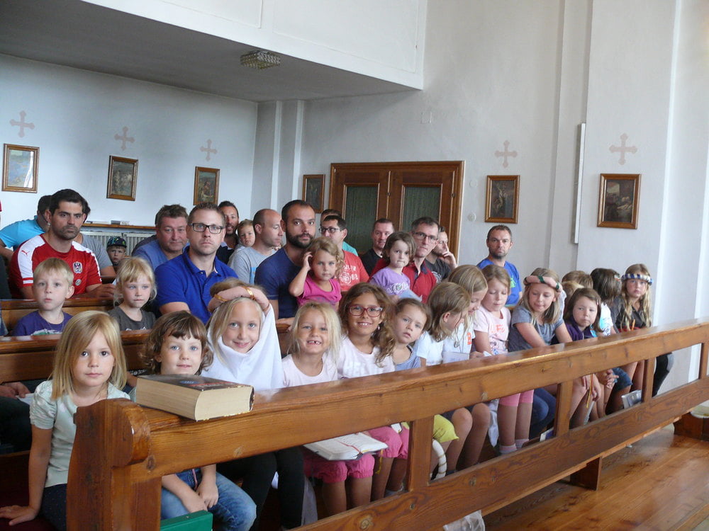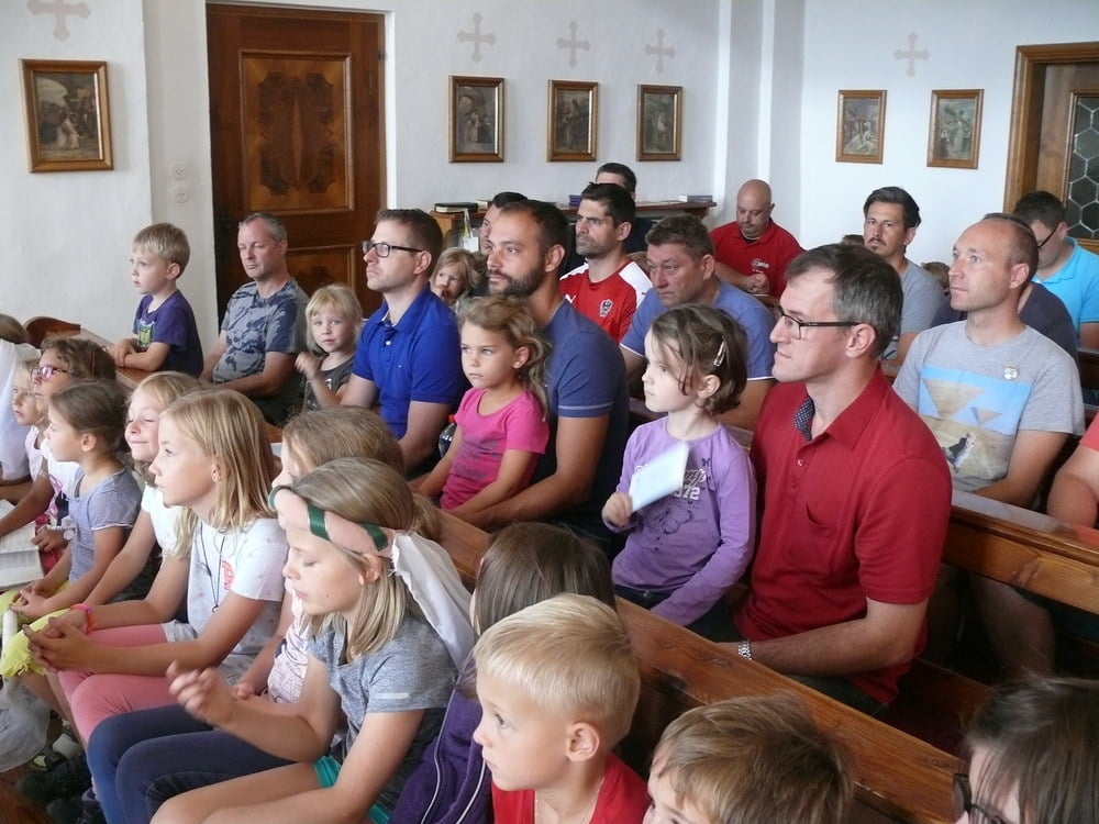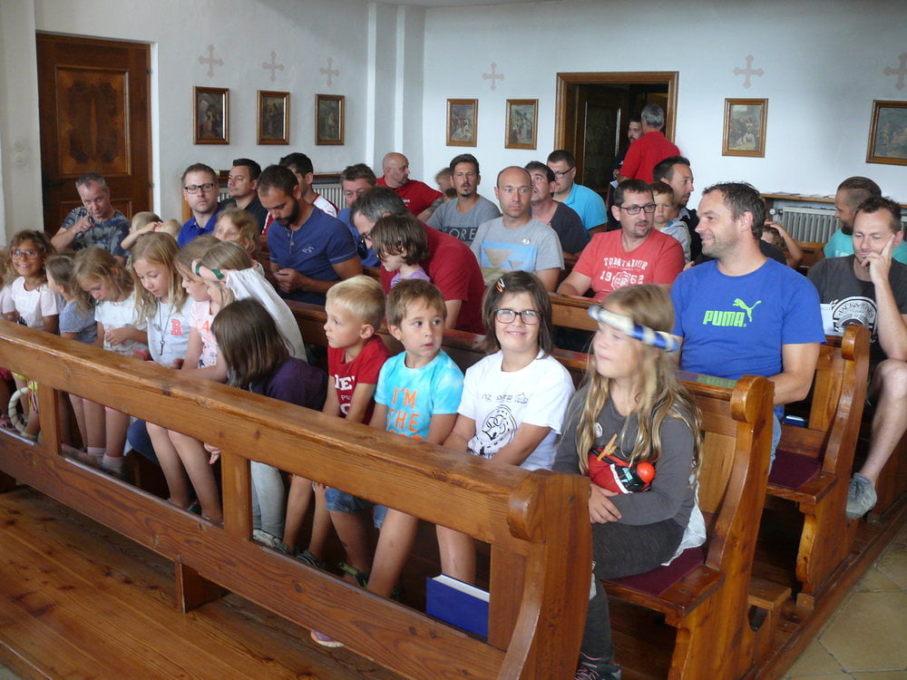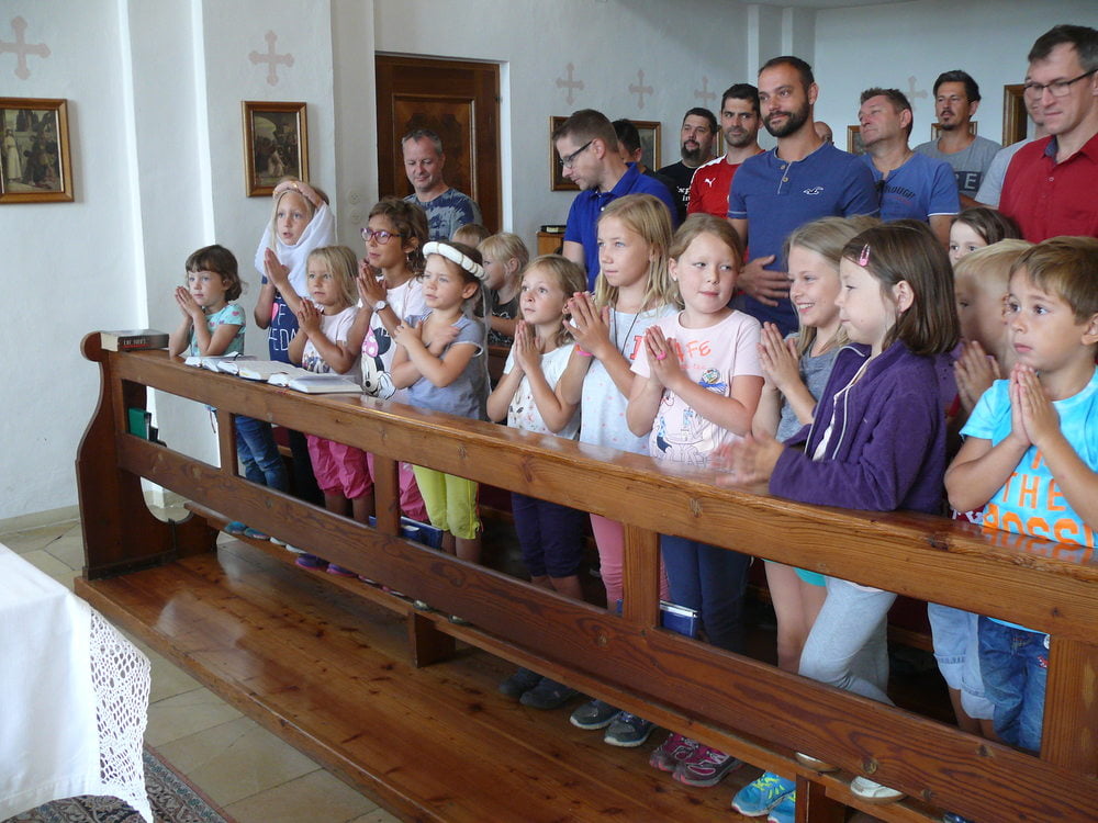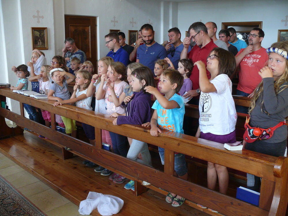 Abschluss eines tollen VaterKind-Wochenendes von 20 Vätern 11 Bubeun und 25 Mädchen war der Gottesdienst am Sonntag Vormittag in der Kapelle des Schlosses/Klosters Riedegg.