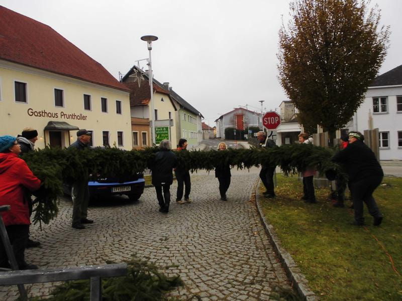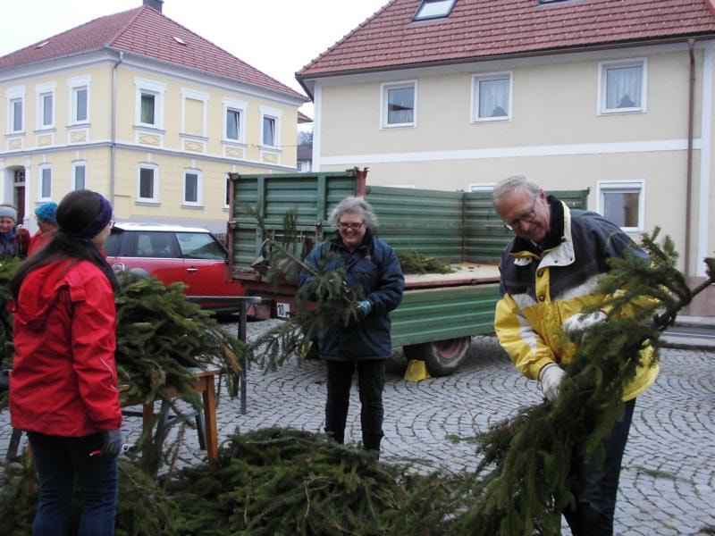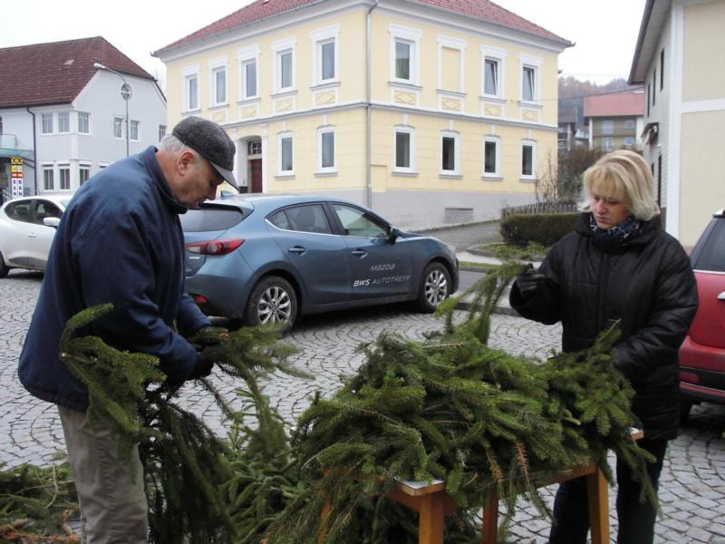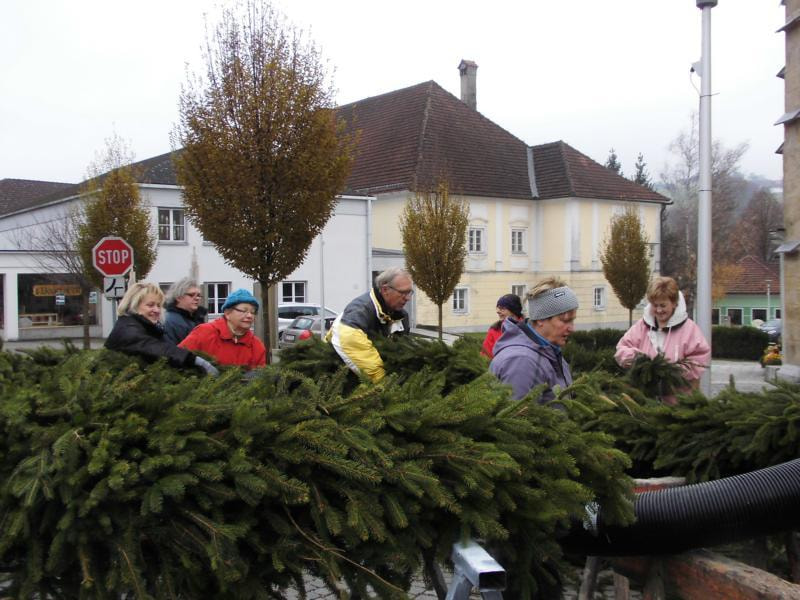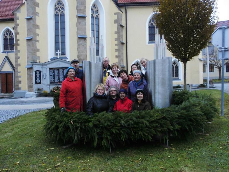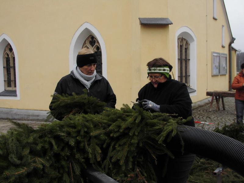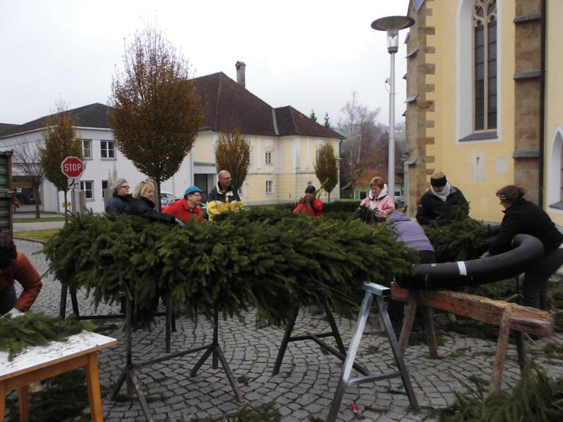 Alljährlich binden engagierte Pfarrmitglieder den großen Adventkranz vor der Kirche