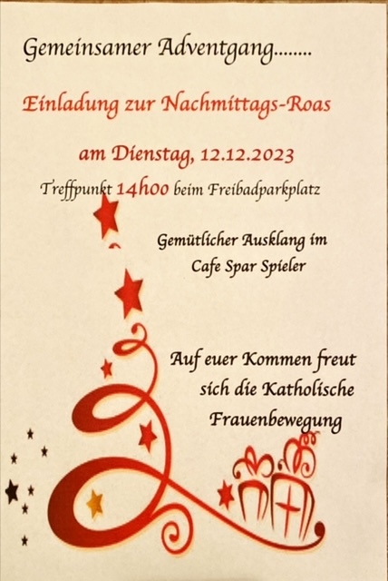 Bei guten Wetterbedingungen - kein Regen oder Wind - starteten wir mit 10 Frauen in die "Nachmittags - Roas im Advent". Beginnend beim Freibadparkplatz wurde folgende Route gewählt: Hackenbuch - Wintersack - Dietraching - Großwiesenhart - St.Marienkirchen - Dauer 2 Stunden. Mit dem Besuch im Cafe Spar Spieler und einer kleinen Stärkung endete dieser schöne Nachmittag.
