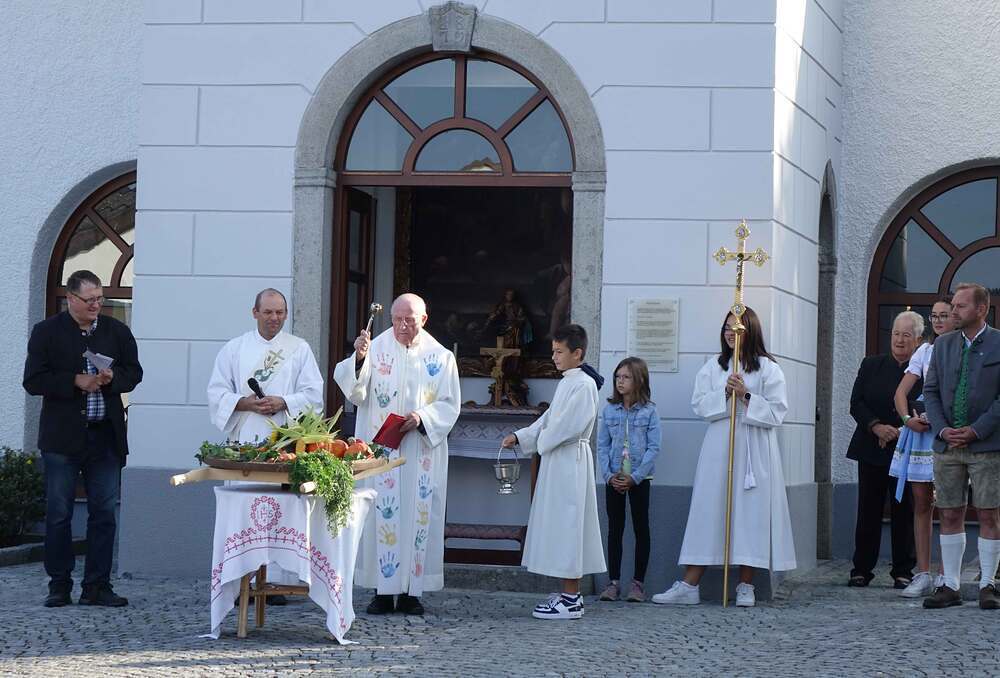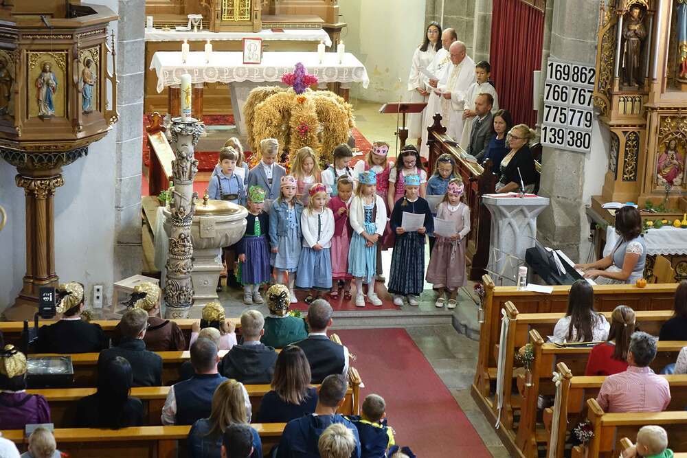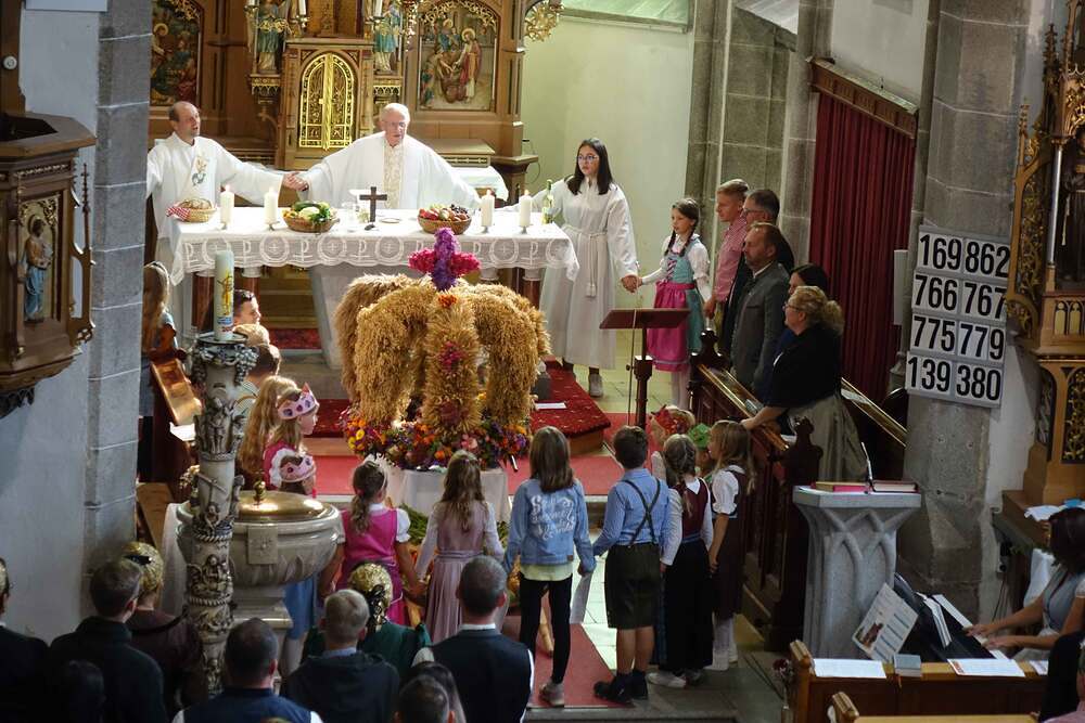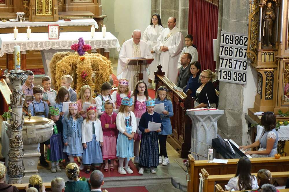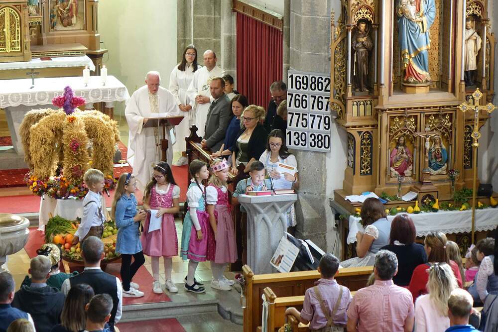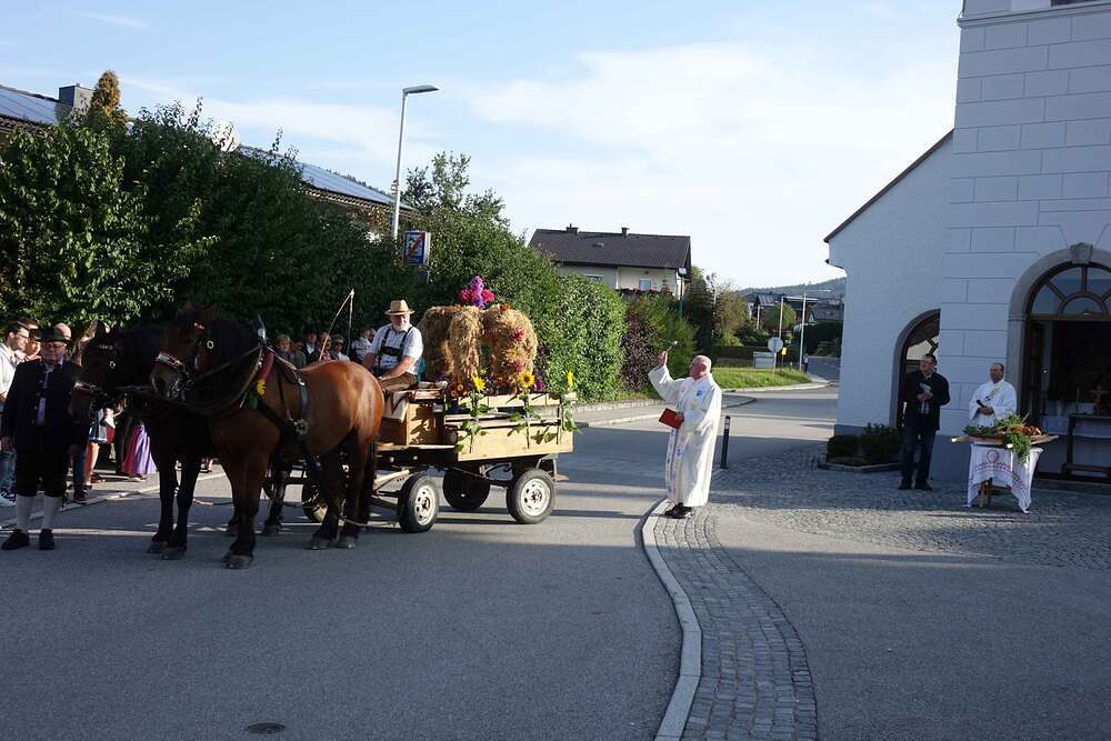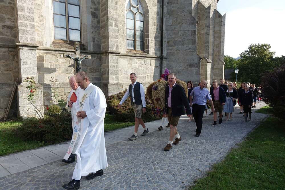 Begleitet von der Musikkapelle, den Goldhaubenfrauen und der Pfarrbevölkerung wurde die Erntekrone und die Erntegaben in einer Prozession zur Kirche gebracht. In der Kirche wartete bereits Edith Greindl mit dem Kindechor, die den Gottesdienst mitgestalteten. Nach dem Erntedankgottesdienst, wurde die Pfarrbevölkerung zum Pfarrfrühschoppen eingeladen. Es gab Weißwürste, Brezen und Bauernkrapfen. Auch an verschiedenen Getränken mangelte es nicht. So klang das Fest des Dankes aus.