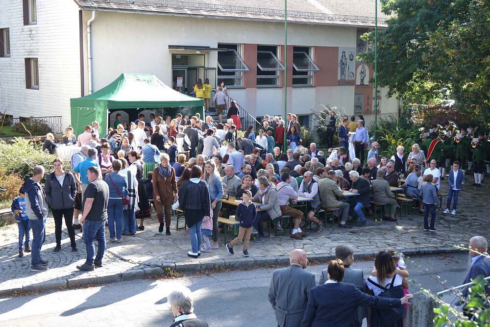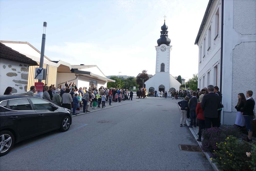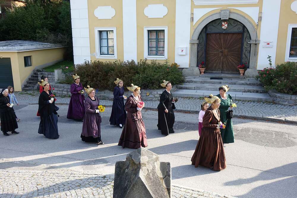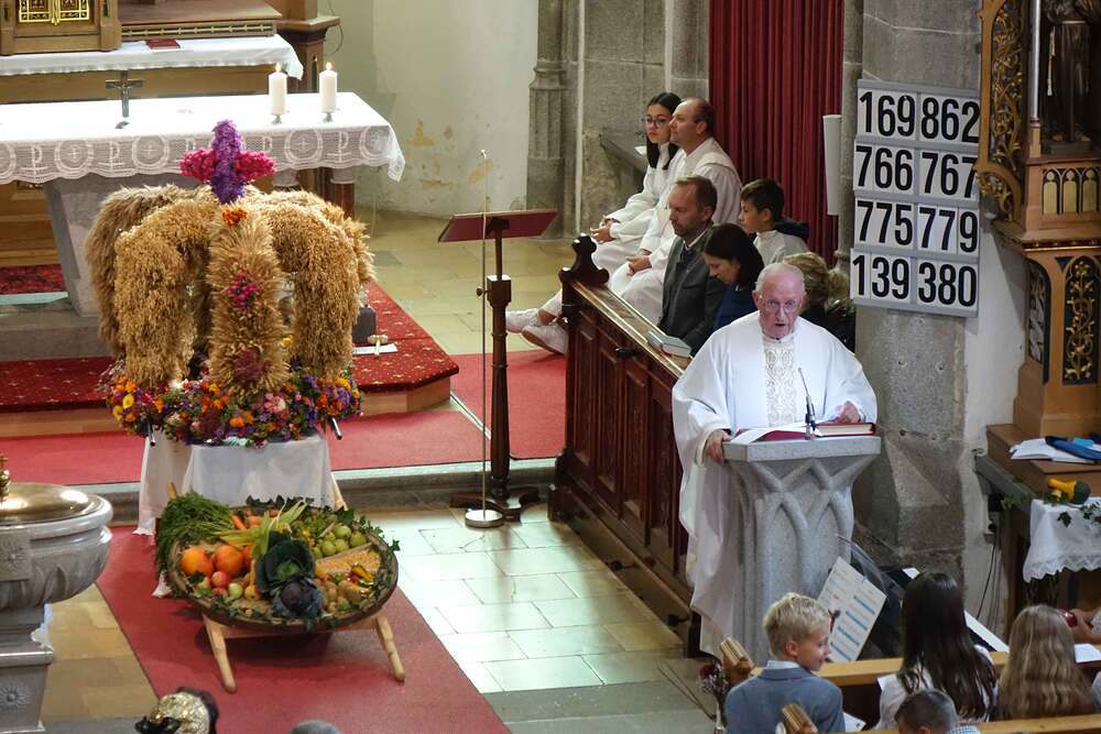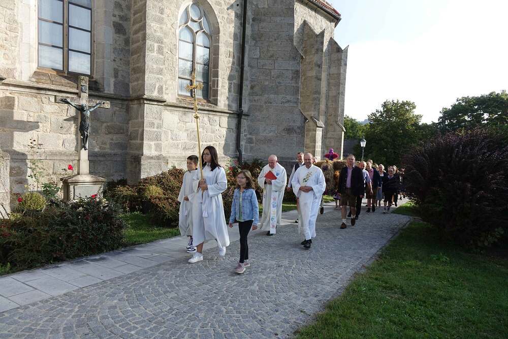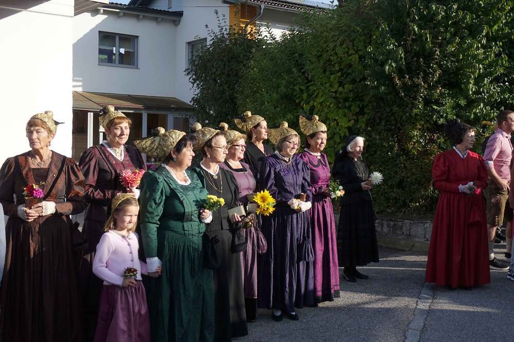 Begleitet von der Musikkapelle, den Goldhaubenfrauen und der Pfarrbevölkerung wurde die Erntekrone und die Erntegaben in einer Prozession zur Kirche gebracht. In der Kirche wartete bereits Edith Greindl mit dem Kindechor, die den Gottesdienst mitgestalteten. Nach dem Erntedankgottesdienst, wurde die Pfarrbevölkerung zum Pfarrfrühschoppen eingeladen. Es gab Weißwürste, Brezen und Bauernkrapfen. Auch an verschiedenen Getränken mangelte es nicht. So klang das Fest des Dankes aus.