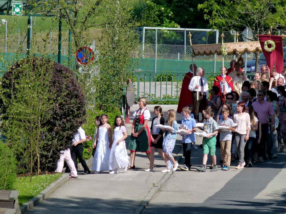 Am Fronleichnamstag war die ganze Pfarrbevölkerung zur Mitfeier des Festgottesdienstes und zur Prozession herzlich eingeladen. Wegen der Baustelle im Marktbereich, wurde bei der Prozession heuer eine andere Route gegangen.