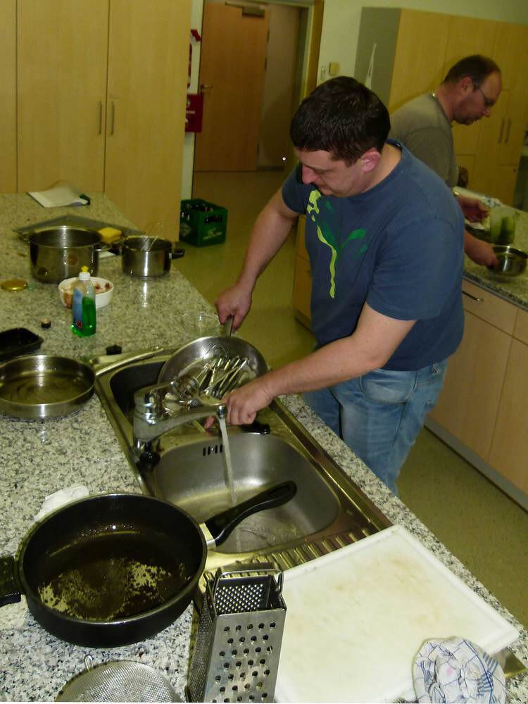 Die "Köche" wurden in 4 Gruppen aufgeteilt, wobei jede Gruppe einen Gang zubereitete. Die Speisen wurden jeweils nach der Zubereitung von den Teilnehmern verkostet und die einhellige Meinung war "... wir können´s doch!". Dass die Herrn auch beim Abwaschen, Zusammenräumen und Putzen ihren "Mann" stehen, zeigen einige Fotos.