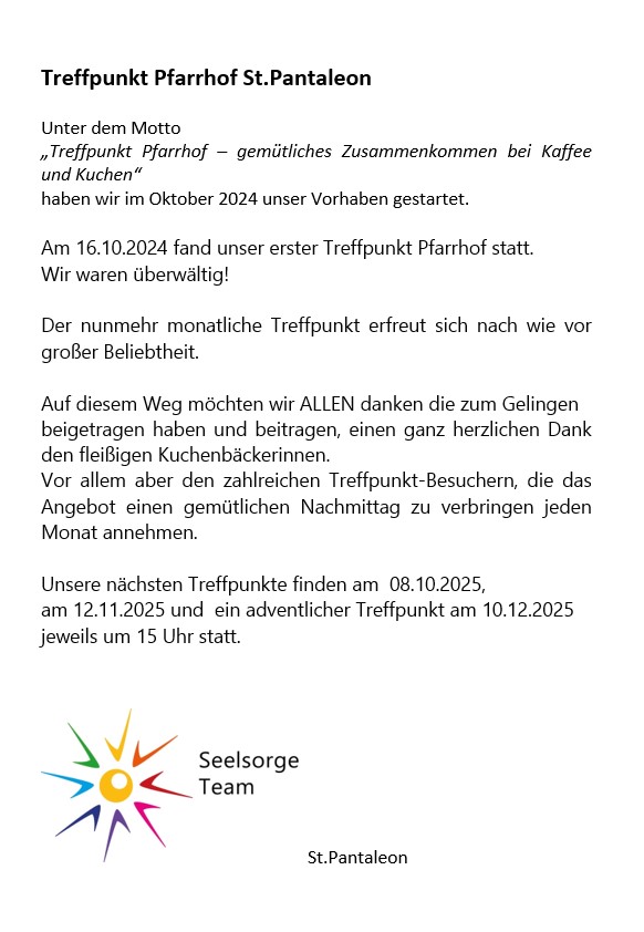 Adventmarkt 2025 Danke! Bei frostigen Temperaturen fand am Christkönigs-Sonntag der bereits traditionelle Adventmarkt der KFB St.Pantaleon statt. Danke an die KFB für die viele geleistete Arbeit, die es bereits im Vorfeld für so einen Markt benötigt! Durch eure gelebte Gemeinschaft und dem guten Miteinander wurde es für alle Besucher eine schöne und stimmungsvolle Veranstaltung. Ein großes *D A N K E* allen Mitgliedern der KFB fürs Mithelfen und für die Spenden jeder Art. Danke auch an alle Besucherinnen und Besucher für die zahlreiche Teilnahme! Ein gelungener Start in den Advent! mehr: Adventmarkt 2025