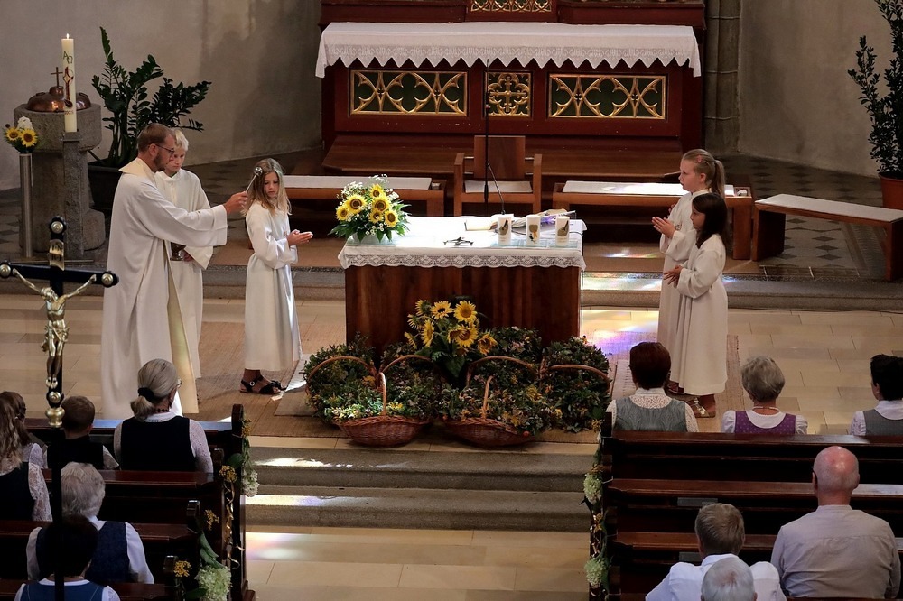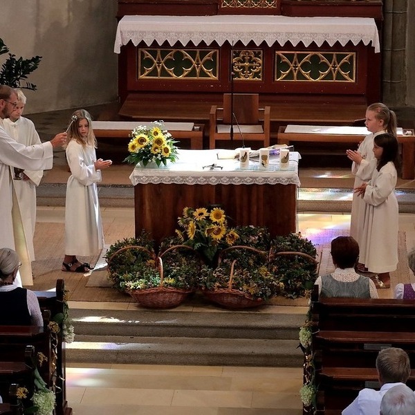Nach dem Gottesdienst wurden die Kräuterbüscherl an die Kirchenbesucher verteilt. Das Ergebnis der freiwilligen Spenden von 715 € wird wiederum für den Kirchenschmuck verwendet.