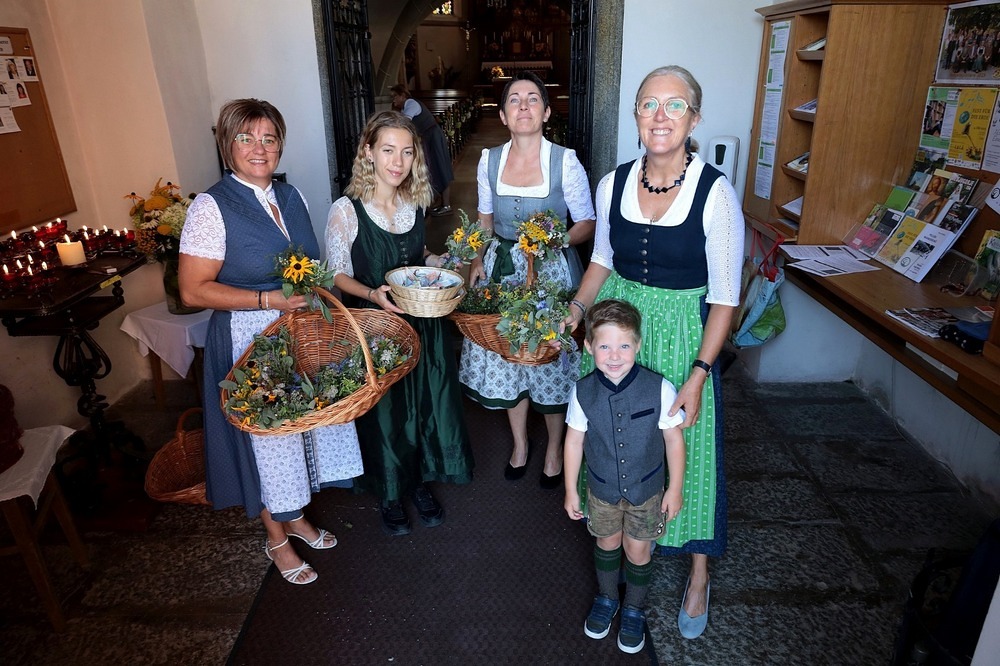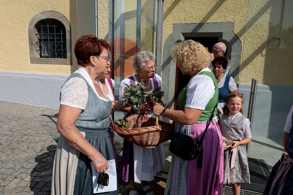 Am Vortag wurden wieder im Pfarrheim die vielen, von den Goldhaubenfrauen gesammelten Kräuter und Blüten zu Büscherln gebunden und in den Körben in der Kirche platziert.