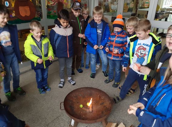 Frau Köpf, Frau Pichler und Frau Hainzl organisierten in der Aula der Schule ein Osterfrühstück mit Kakao, Muffins, Pizzaschnecken, Obst und Beichtbrezen als Stärkung für die Erstkommunionkinder, wofür wir uns noch einmal ganz herzlich bedanken. Im Anschluss an die Beichte durften die Kinder vor der Schule ihre „Beichtzettel“, auf denen sie sich Notizen für das Gespräch gemacht hatten, symbolisch in einem Feuer verbrennen.