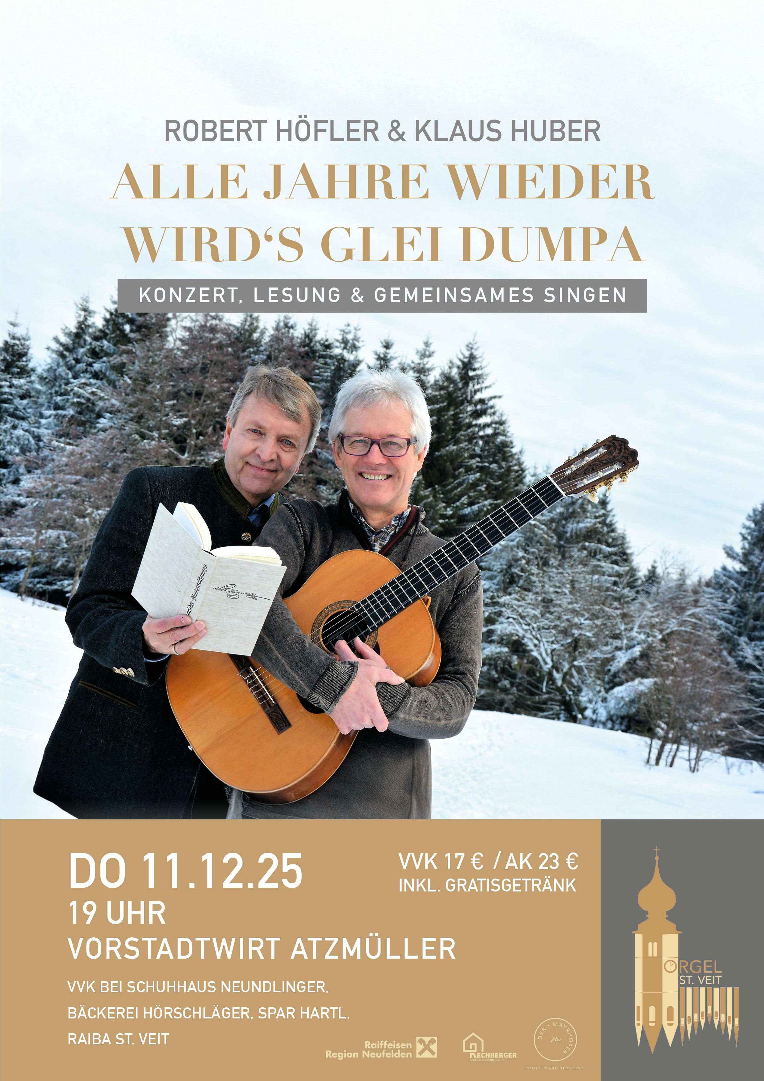 Am 11. Dezember 2025 ab 19 Uhr laden Klaus Huber und Robert Höfler zum vergnüglichen gemeinsamen Weihnachtsliedersingen unter dem Motto „Alle Jahre wieder wird’s dumpa“ zum Vorstadtwirt, der Reinerlös kommt dem Orgelprojekt zugute.