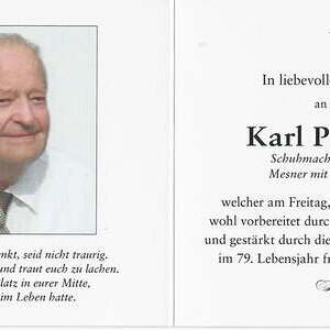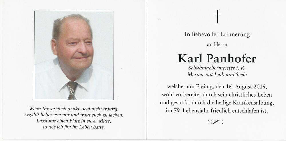Seit 1. April 1955 war Schuhmachermeister Karl Panhofer Mesner mit Leib und Seele. Knapp 15-jährig hatte er dieses Amt übernommen und mustergültig bis Ostern dieses Jahres ausgeübt. Die Familie mit 6 Kindern, sein Beruf und die Mesnerei sorgten für ein erfülltes Leben. Daneben war er auch in der Kath. Jungschar, Kath. Jugend und im PGR führend tätig. 46 Jahre (von 1973 - 2017) wirkte er aktiv bei vielen Entscheidungen im PGR mit. 4 Perioden stand er als Obmann an der Spitze dieses Gremium.