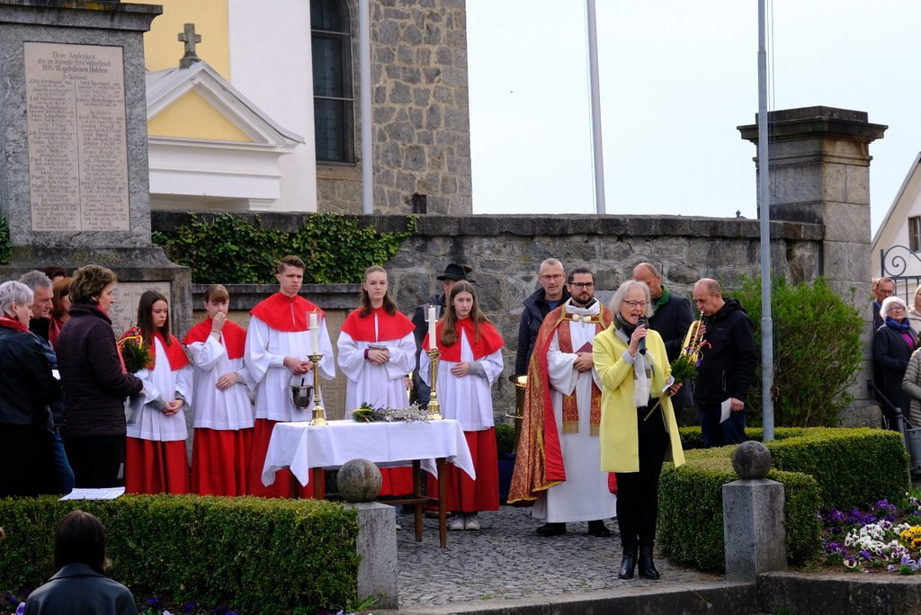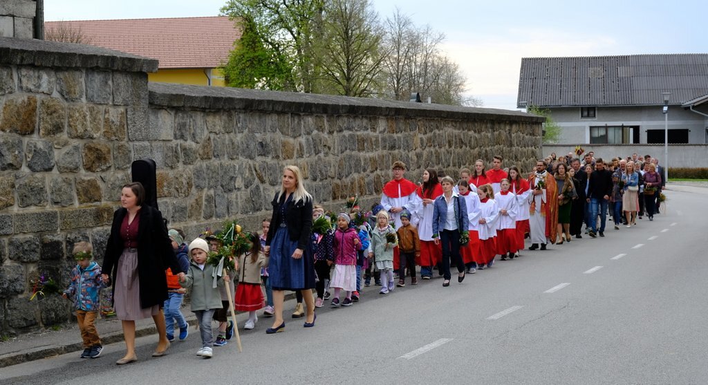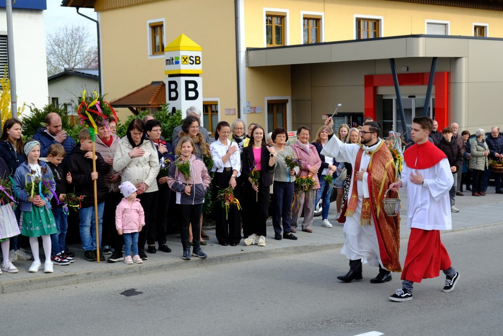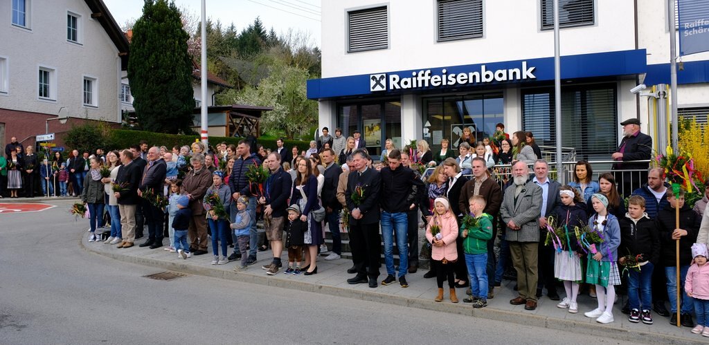 Nach der Palmweihe beim Kriegerdenkmal geht die Palmprozession in die Pfarrkirche zur Heiligen Messe. Angeführt wurde die Prozession von den Ministranten mit dem Kreuz, danach folgten die Kindergartenkinder und schließlich die ganze Pfarrbevölkerung.