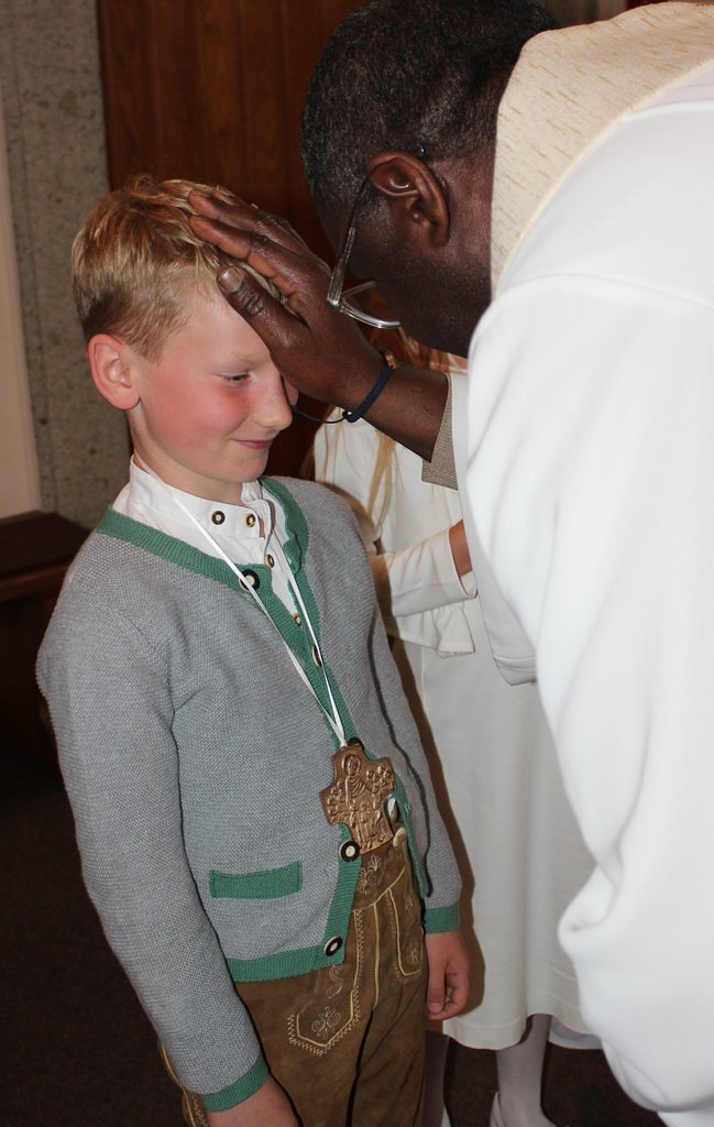 Am Ende der Dankandacht bekommt jedes Kind ein Kreuz von der Pfarre als Geschenk, als Erinnerung an die Heilige Erstkommunion und mit dem Einzelsegen von Kooperator Didacus Ilo, geht klingt dieser wunderschöne Tag schließlich aus.