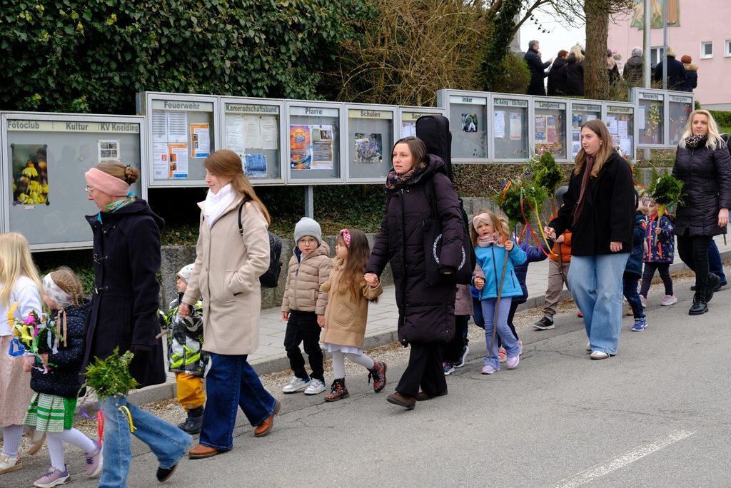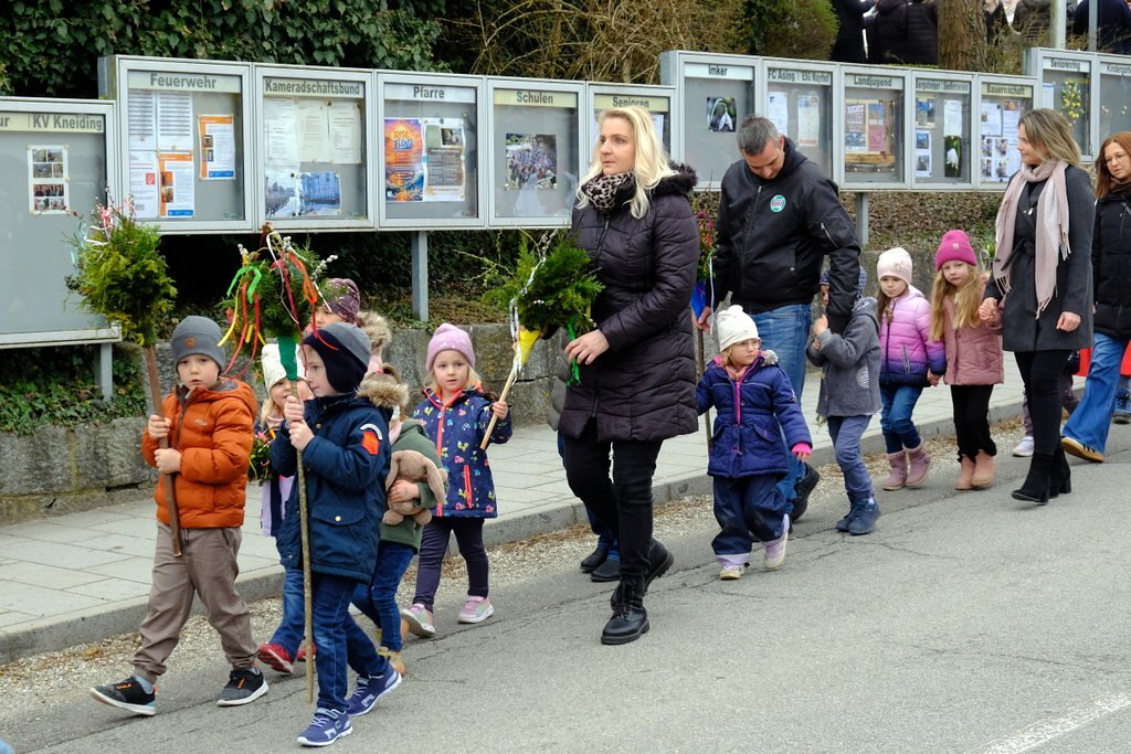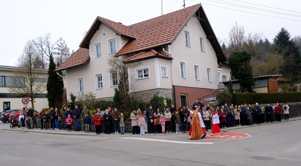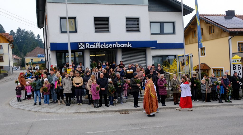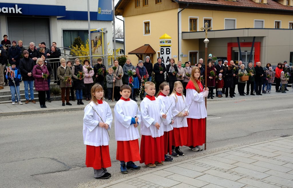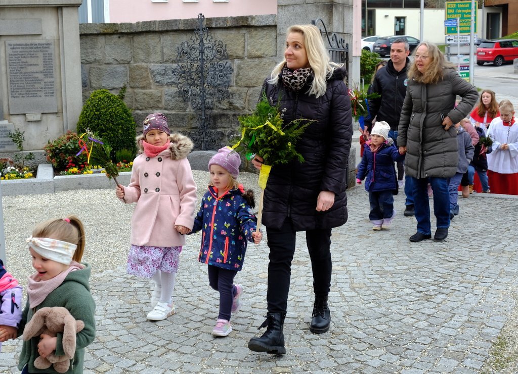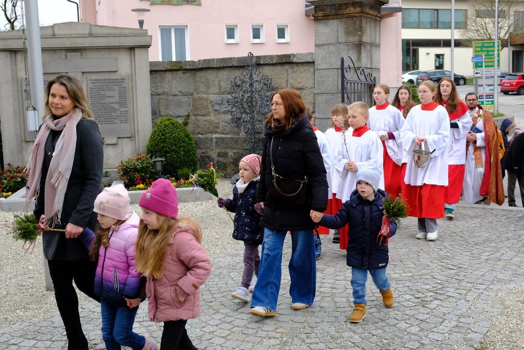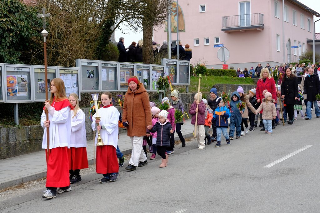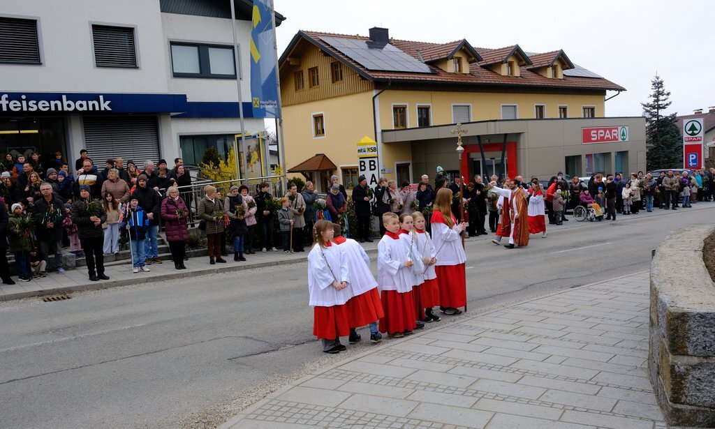 Nach der Palmweihe von P. Johannes Haas beim Kriegerdenkmal geht die Palmprozession in die Pfarrkirche zur Heiligen Messe. Angeführt wurde die Prozession von den Ministranten mit dem Kreuz, danach folgten die Kindergartenkinder und schließlich die ganze Pfarrbevölkerung.