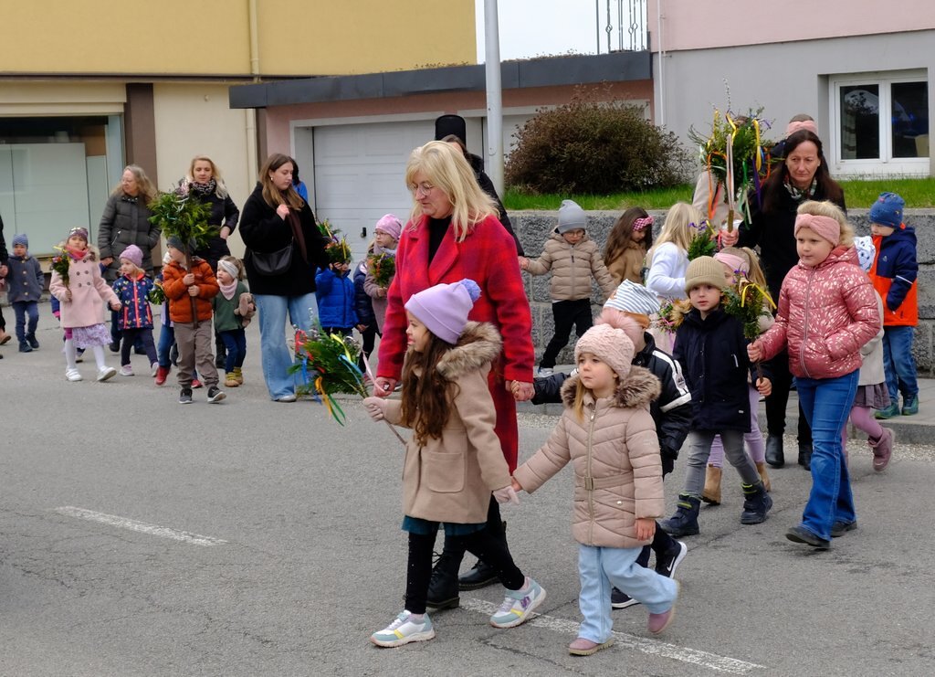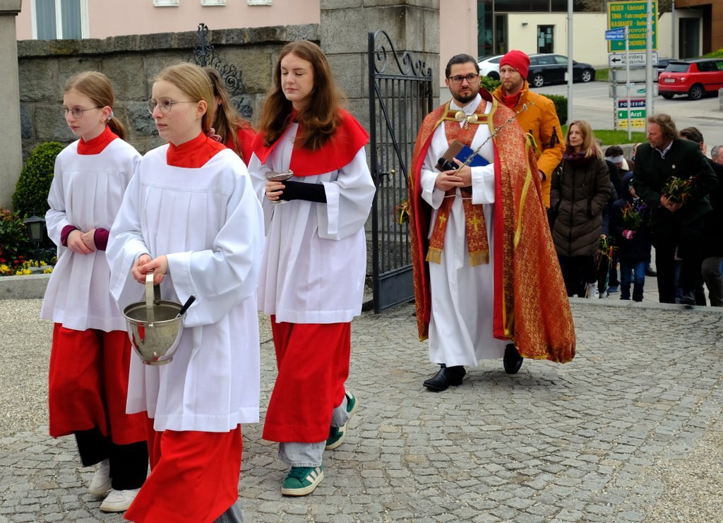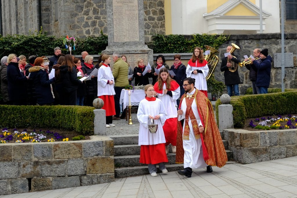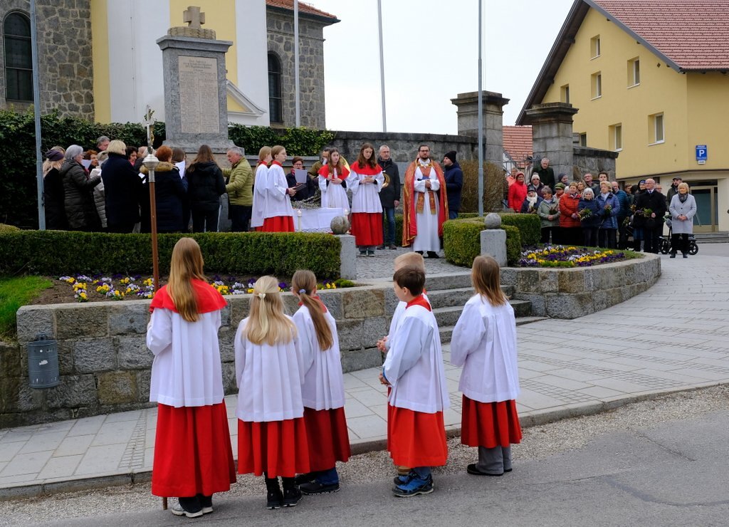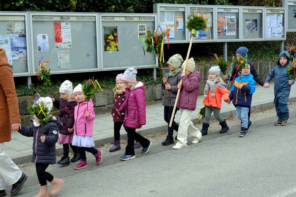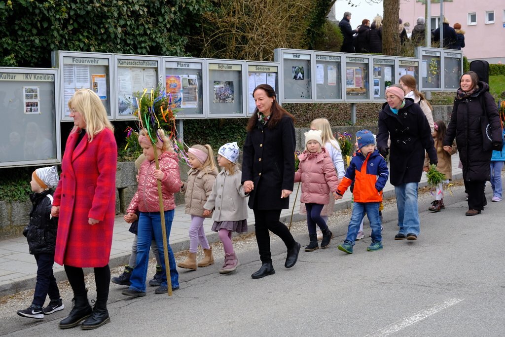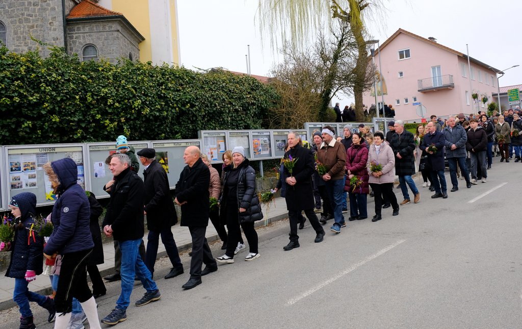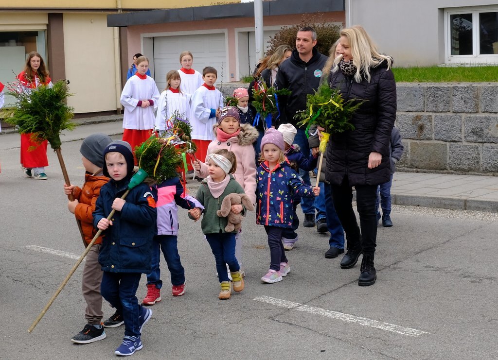 Nach der Palmweihe von P. Johannes Haas beim Kriegerdenkmal geht die Palmprozession in die Pfarrkirche zur Heiligen Messe. Angeführt wurde die Prozession von den Ministranten mit dem Kreuz, danach folgten die Kindergartenkinder und schließlich die ganze Pfarrbevölkerung.