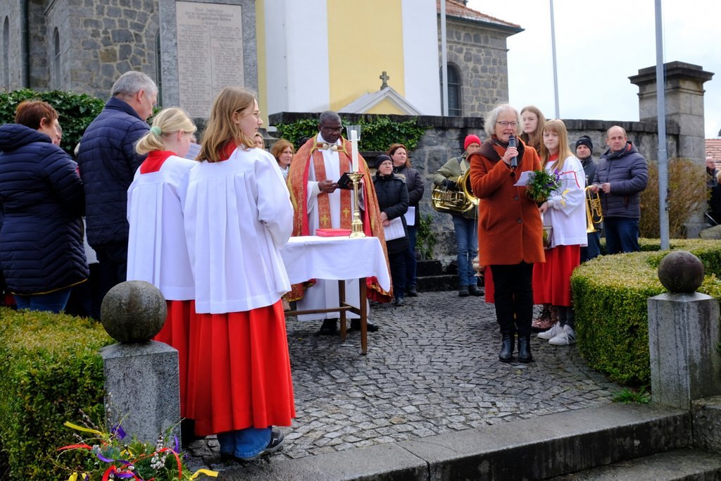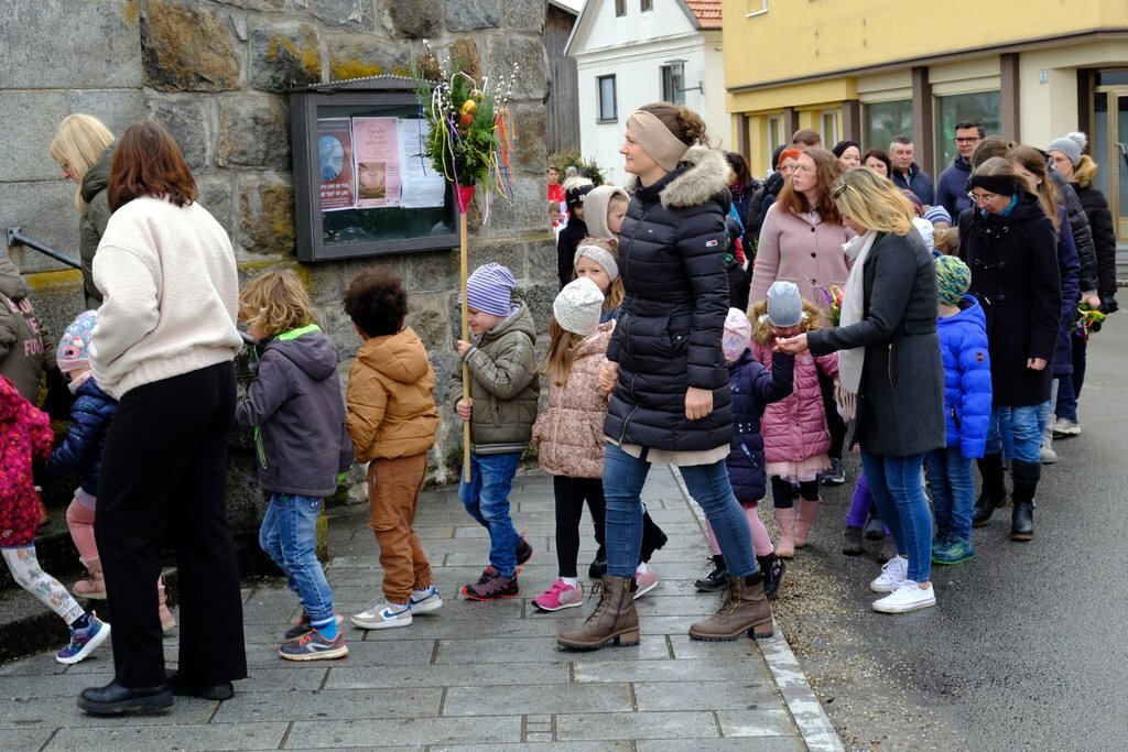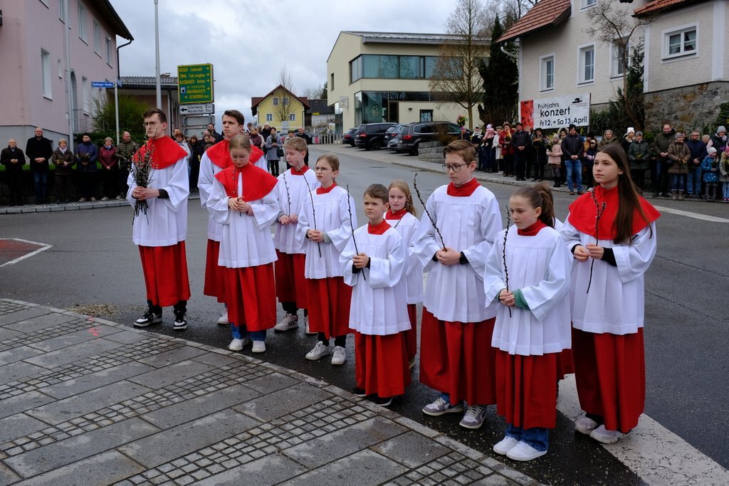 Nach der Palmweihe beim Kriegerdenkmal geht die Palmprozession in die Pfarrkirche. Angeführt wurde die Prozession vom Kreuz und den Ministranten, es folgten die Kindergartenkinder, die Erstkommunionkinder, die Firmlinge mit den Firmbegleitern und schließlich die ganze Pfarrbevölkerung.