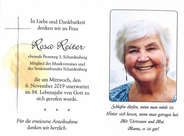 Rosa Reiter, gest. 06.11.2019 im 84. Lebensjahr