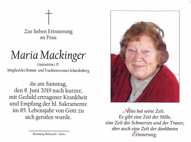 Maria Mackinger, gest. 08.06.2019 im 85. Lebensjahr