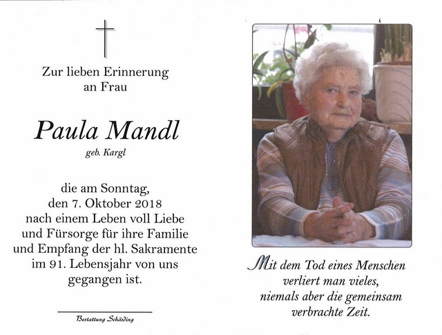 Paula Mandl, gest. 07.10.2018 im 91. Lebensjahr