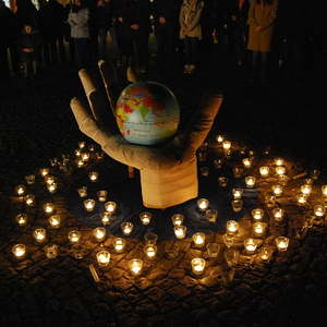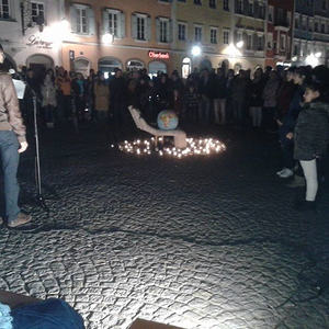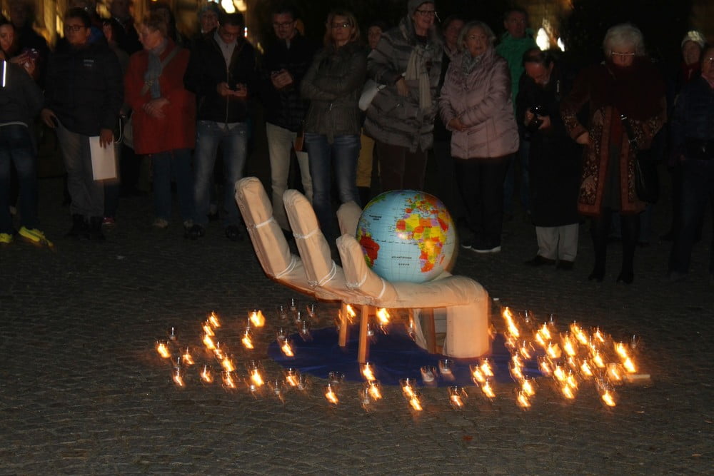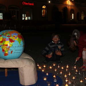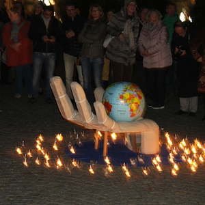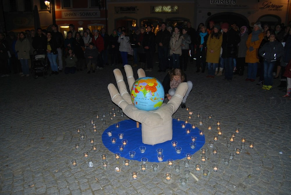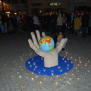 Ein starkes Zeichen setzten am 26. Oktober ca. 200 Menschen am Stadtplatz Schärding. Sie versammelten sich um eine offene Hand, in der die Erde ruht, als ein alle Gottesvorstellungen der Religionen übergreifendes Symbol. Sie nahmen teil am "Gemeinsamen Gebet um Menschlichkeit", zu dem die verschiedenen Glaubensgemeinschaften einluden.