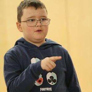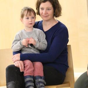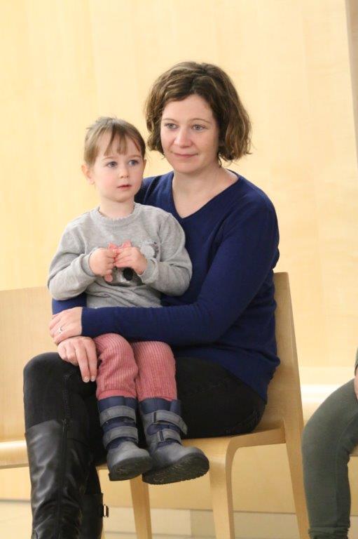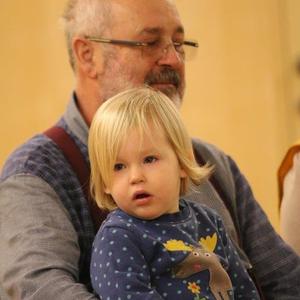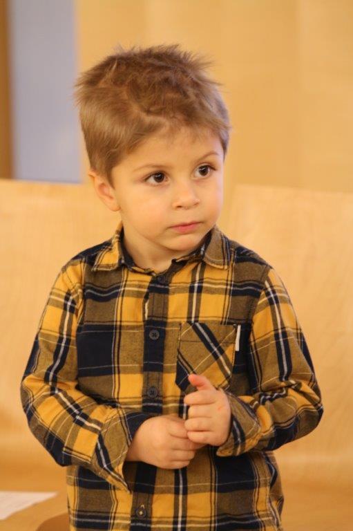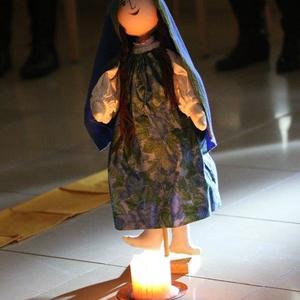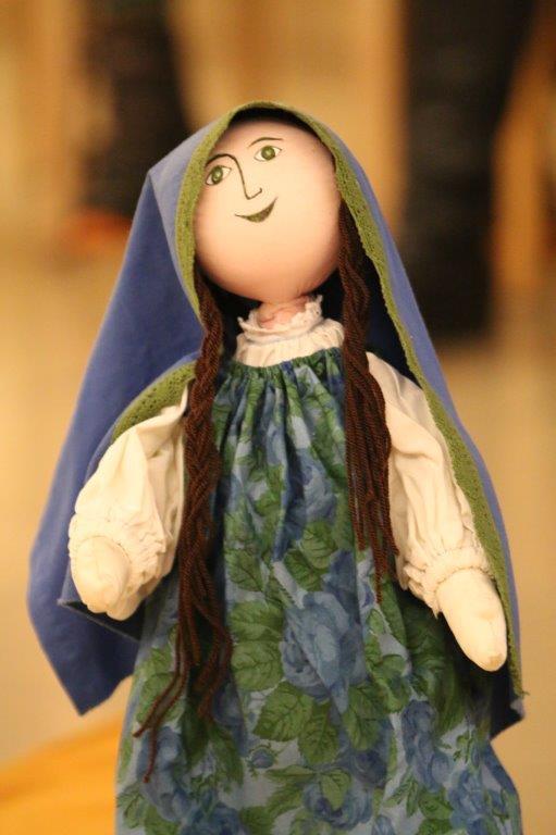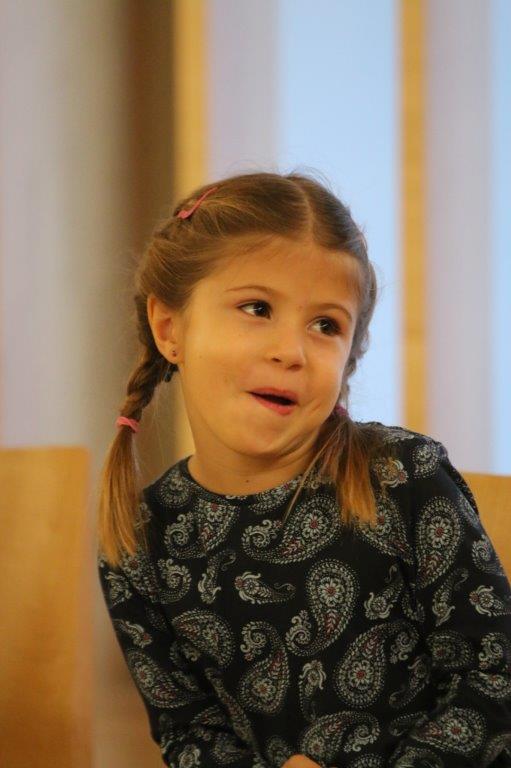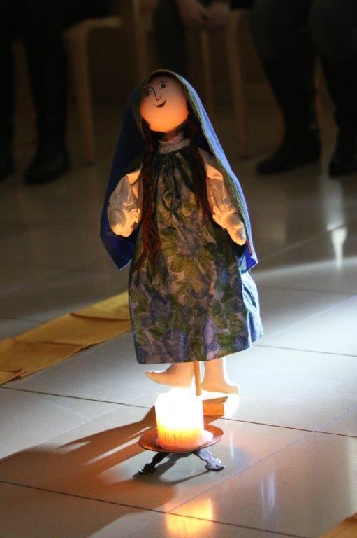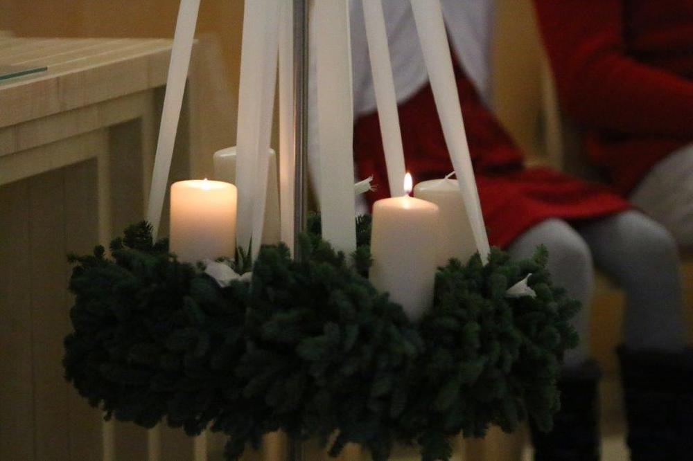 Adventfeier mit den Jungscharkindern. Der Nikolaus und der Weihnachtsmann unterhalten sich. Die Kinder haben Lebkuchennikoläuse verziert.