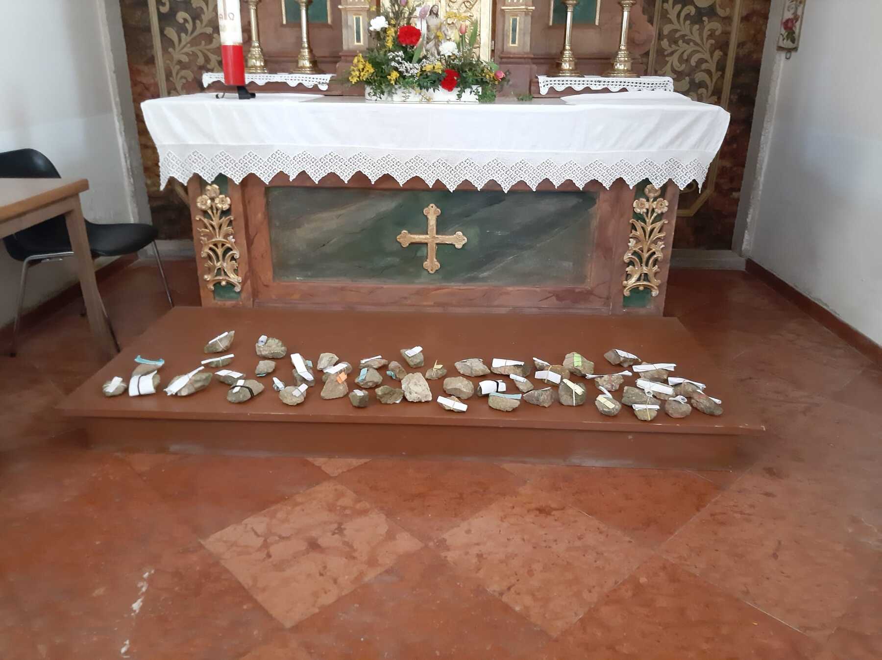 Als Symbol für ihre Sorgen wurden die Steine vor Jesus in der Kalvarienbergkirche hingelegt. Zum Abschuss der Emmauswanderung gab es den Segen von Pastoralassistentin Julia Matzinger vor der Pfarrkirche.