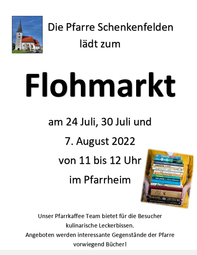Die Pfarre lädt zum Flohmarkt am 24 Juli, 30 Juli & 7. August 2022 von 11 bis 12 Uhr im Pfarrheim ein.