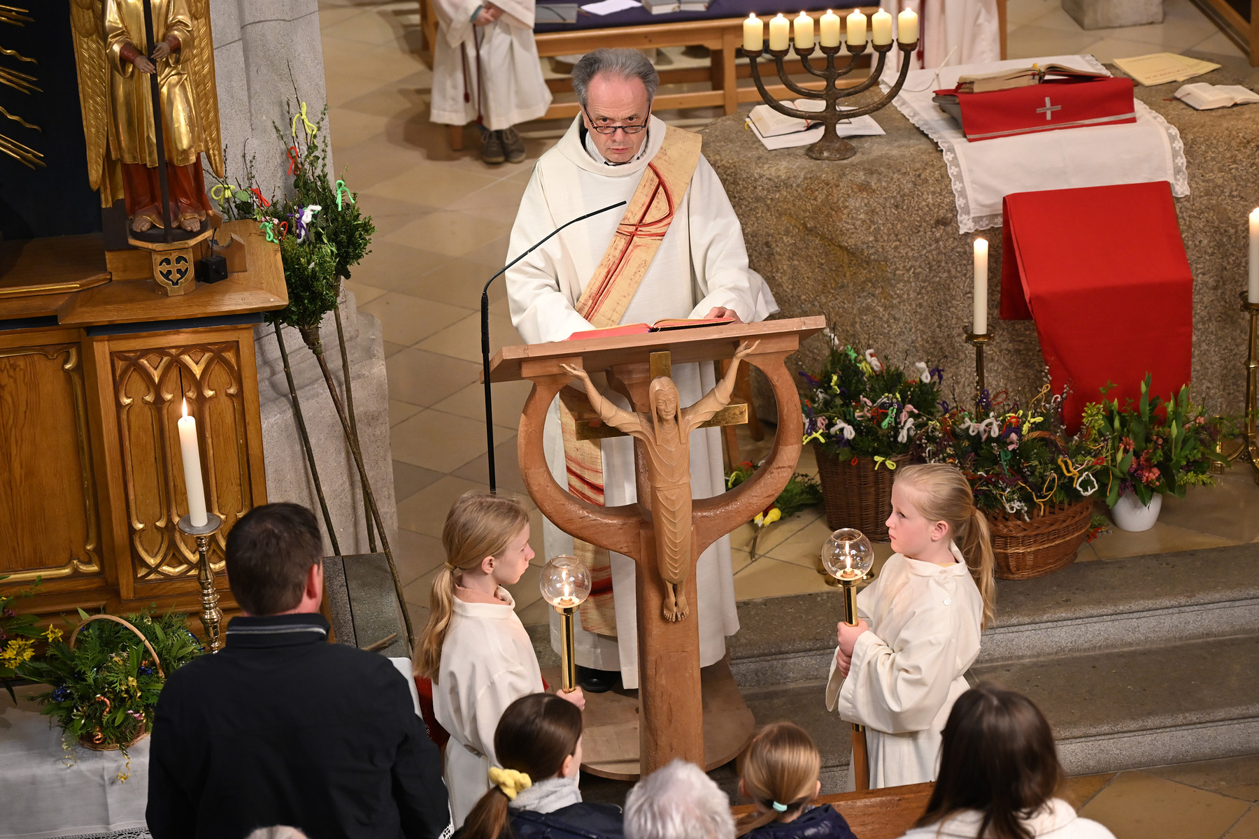 Nach der Segnung der Palmbuschen wurde in der von Kurat Anton-Joseph Ilk und Diakon Johann Hagn zelebrierten Eucharistiefeier der Spannungsbogen der Heiligen Woche eindrucksvoll zum Ausdruck gebracht – vom Jubel am Palmsonntag mit Palmbuschen bis hin zum Leid am Karfreitag mit dem Tod Jesu am Kreuz.
