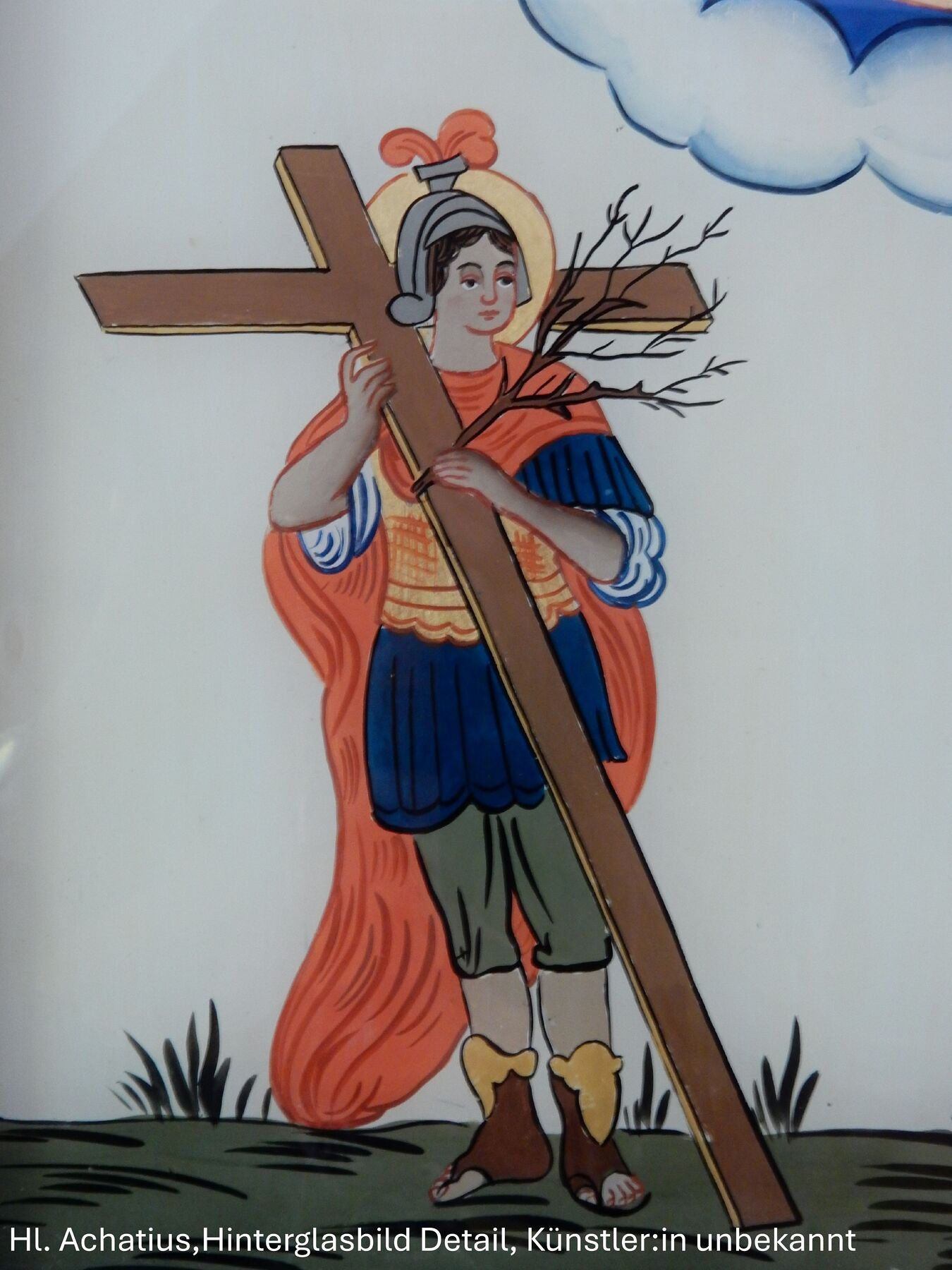 Das Altarbild stammt von dem Künstler Hans Keplinger aus Linz und zeigt die Szene der Hinrichtung des Hl. Sebastians. Der Altar wurde von dem Kunsttischler Josef Übleis aus Neumarkt-Kallham gestaltet und gefertigt. Dekoriert ist der Altar mit einer Intarsienarbeit, die drei Delfine im Kreis angeordnet darstellt. Im Christentum ist der Delfin das Symbol für Christus, den Seelenretter. Hier vermute ich die drei Delfine als Symbol für den dreifaltigen Gott. Auf einem Hinterglasbild an der Seitenwand ist der Hl. Achatius dargestellt. Der Ursprung des Kreuzes über dem Altar ist mir leider derzeit nicht bekannt.