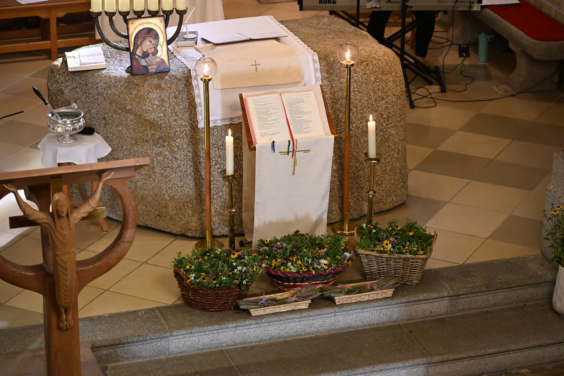 Allerlei Kräuter aus den Gärten, Wiesen und Feldern, wie Melisse, Pfefferminze, Rosmarin, Schafgarbe, Thymian, Ringelblume und vieles mehr wurden auch heuer wieder liebevoll von den Goldhaubenfrauen in die Büscherl eingebunden und zum Altar für die Segnung durch Waltraud Möstl, Leiterin der Wort-Gottes-Feier, bereit gestellt.