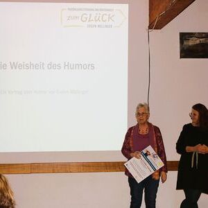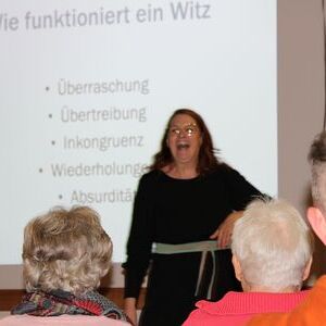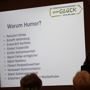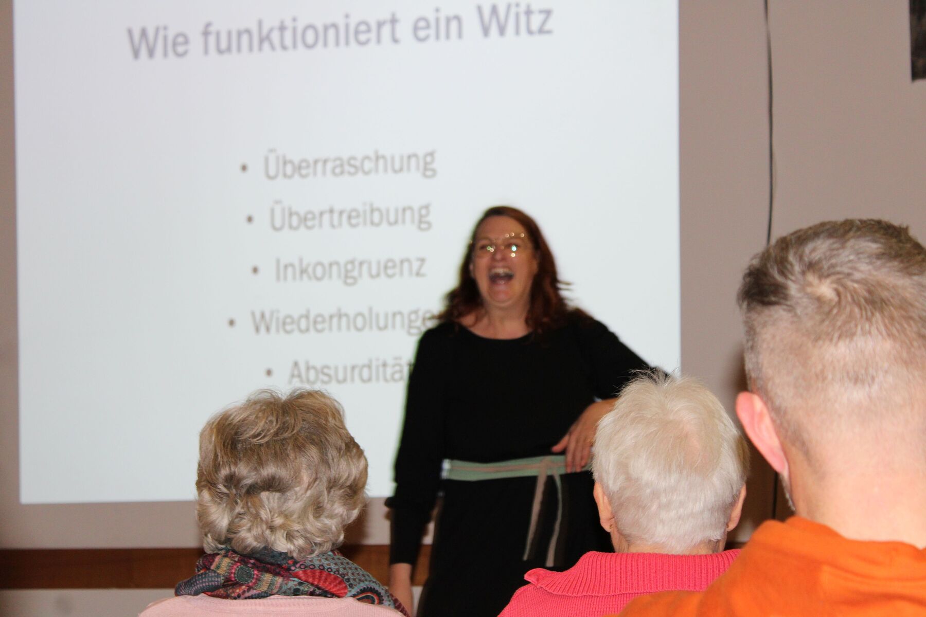 Im sehr kurzweiligen und lustigen Vortrag lernte das Publikum die fünf Stufen des Humors kennen und auch Werkzeuge, wie der eigene Humor trainiert werden kann. Gespickt mit Witzen und kleinen Übungen zwischendurch wurde schnell allen klar, dass ein humorvoller Blick auf das Leben viele schwierige Situationen oft leichter meistern lassen. Darüber hinaus kann Humor Konflikte entschärfen. Und nicht zuletzt ist Humor ein wirksames Mittel gegen Stress.