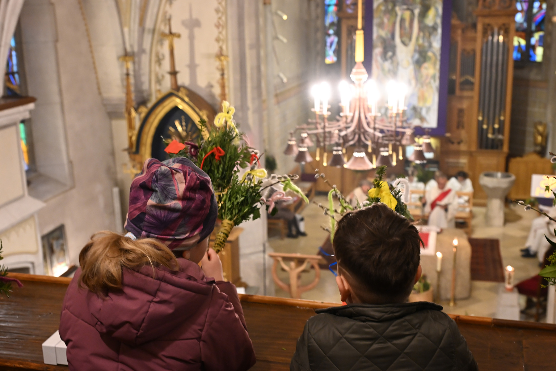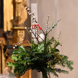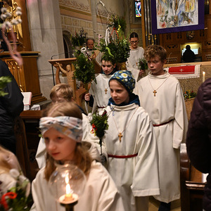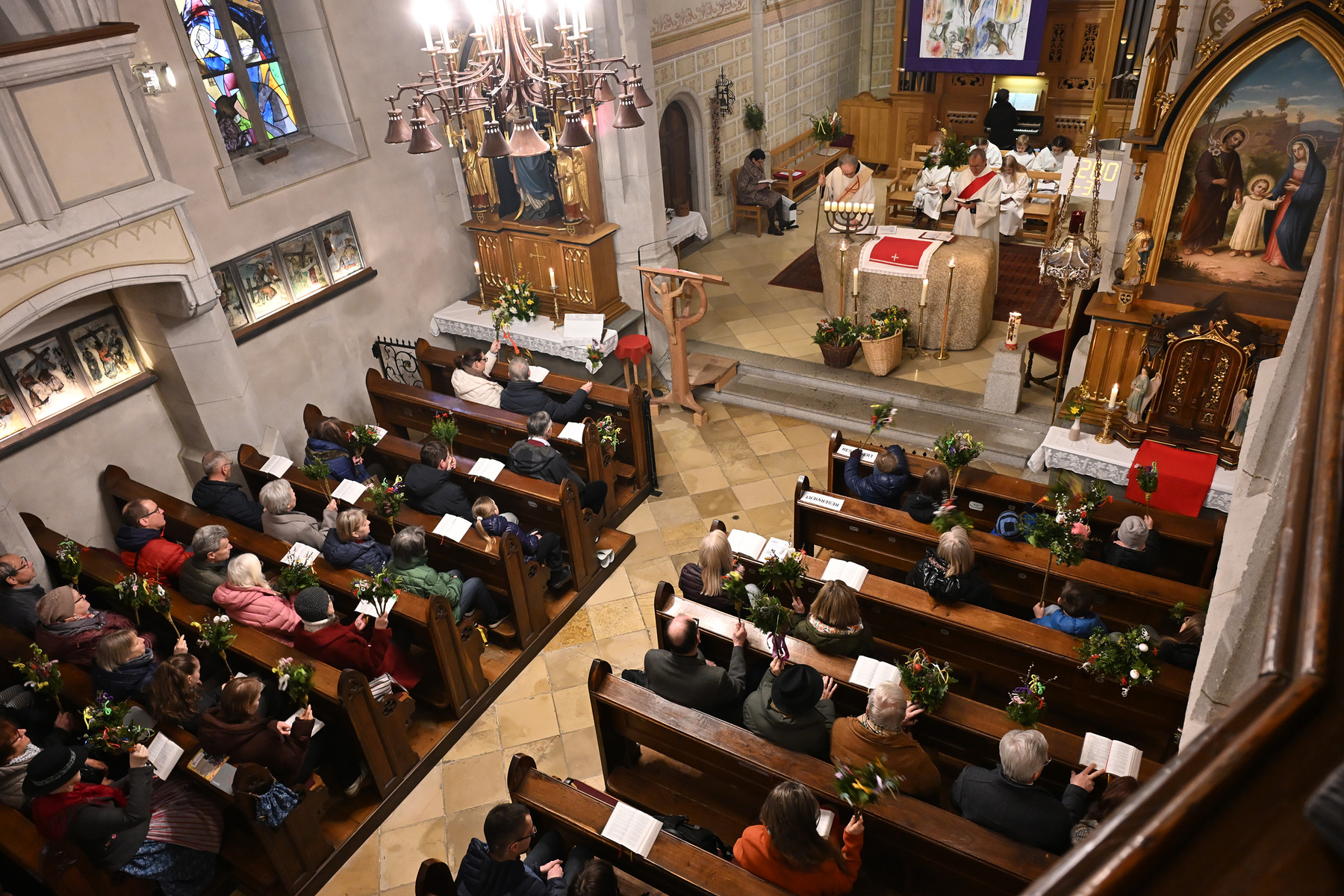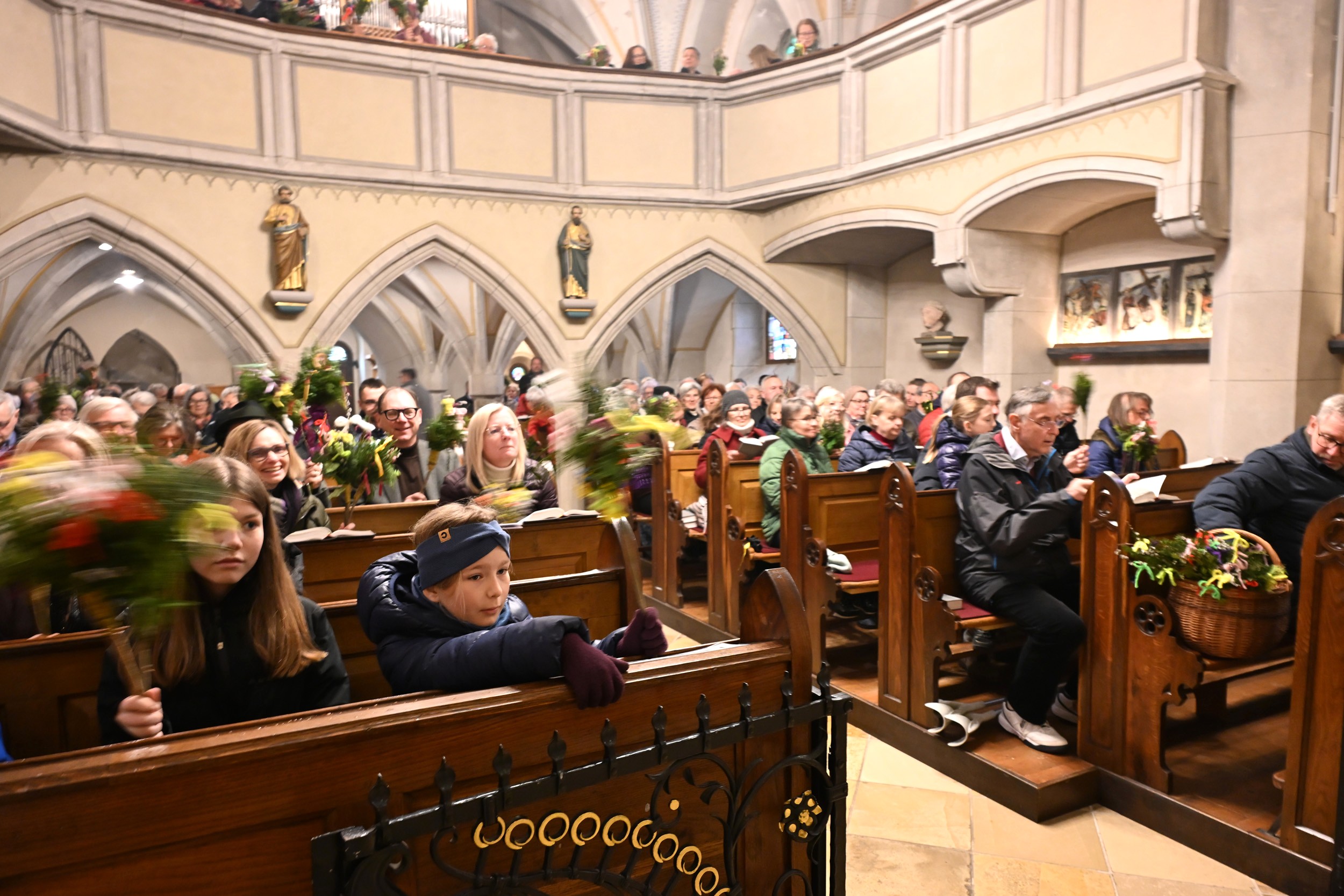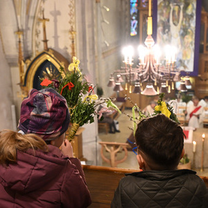 Nachdem die Liturgie witterungsbedingt nicht am neuen Friedhof beginnen konnte und damit auch die feierliche Palmprozession rund um die Kirche wegfiel, winkten und wedelten viele Kinder und Erwachsene mit ihrem Palmbuschen bei dem Lied "Singt dem König Freudenpsalmen“.