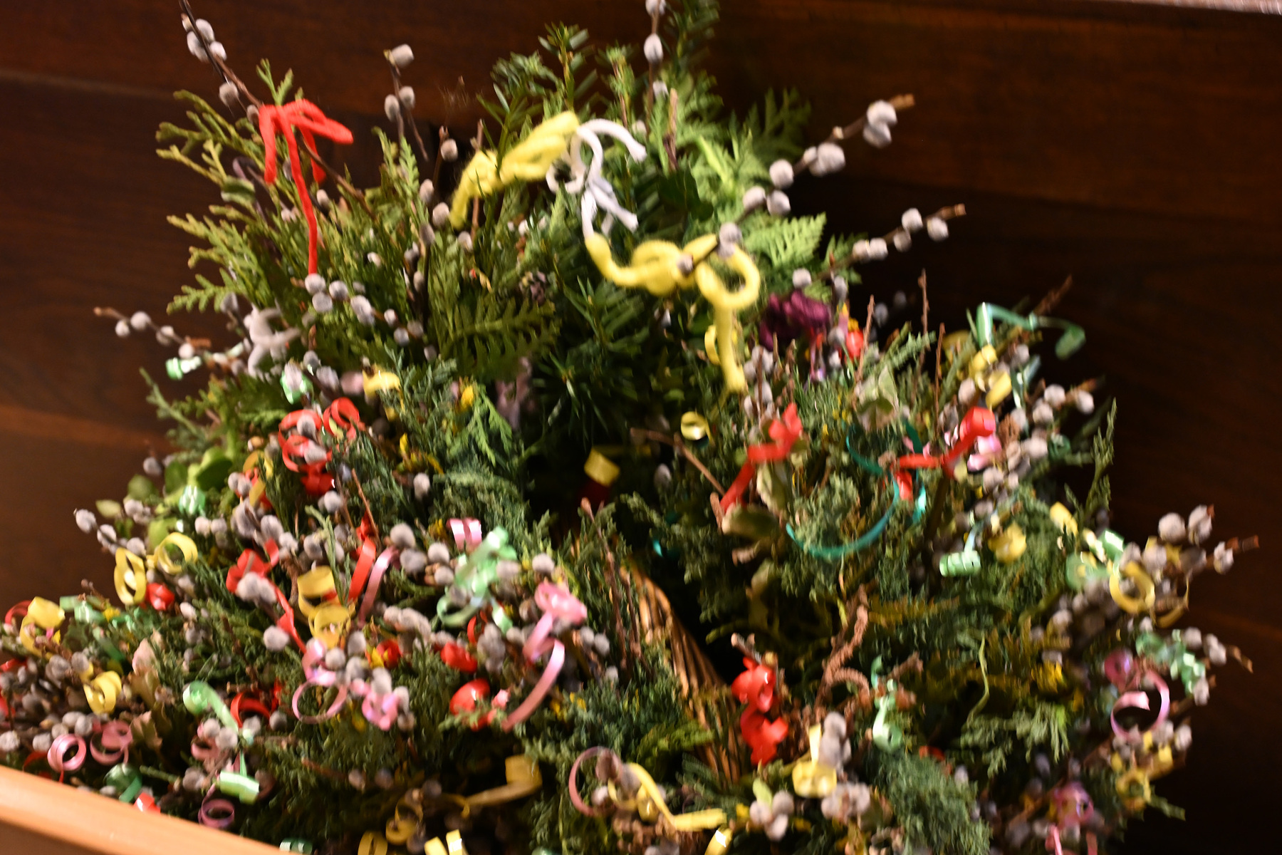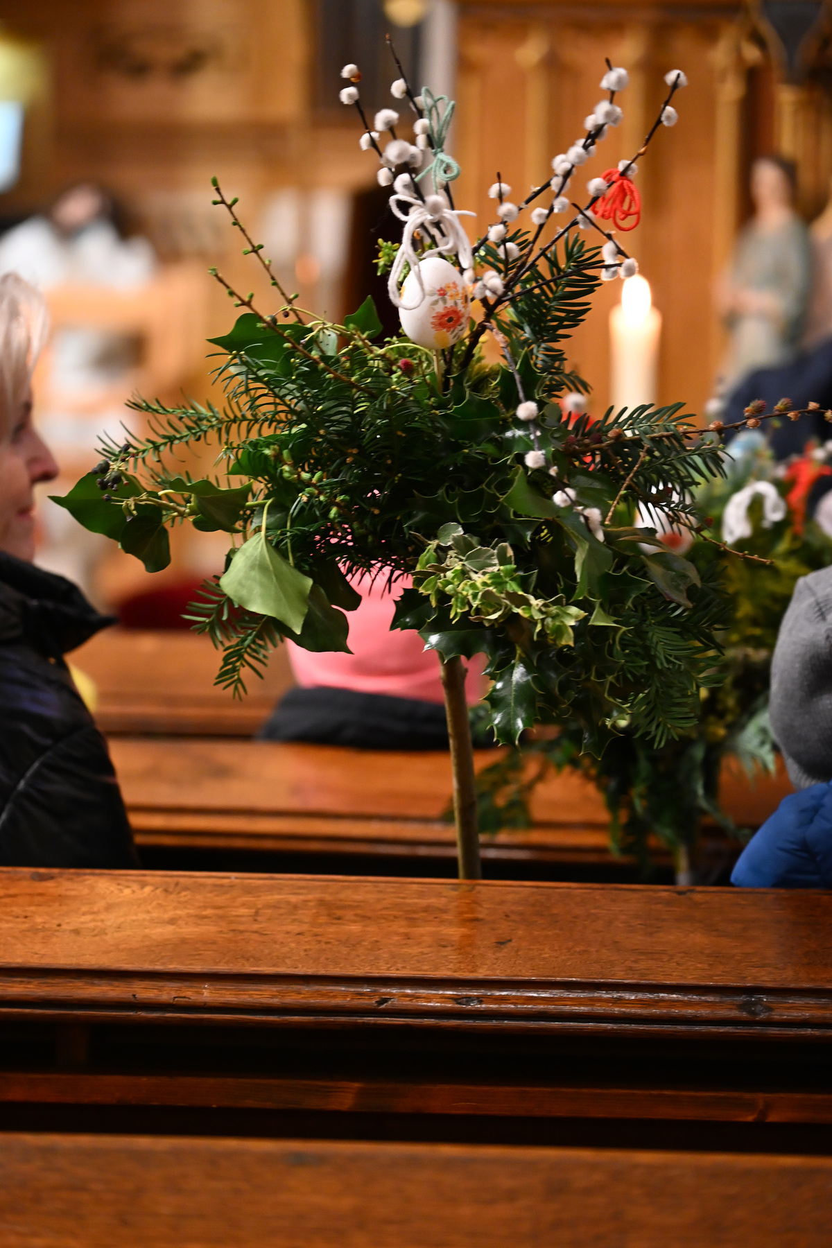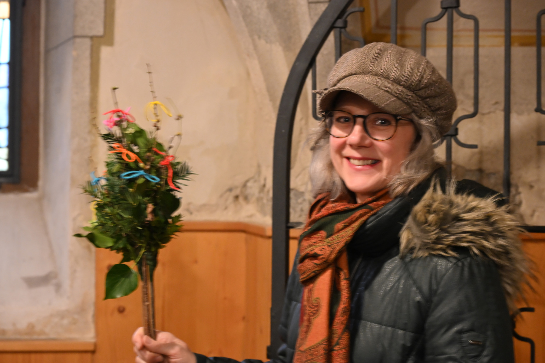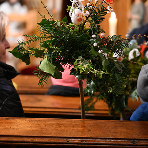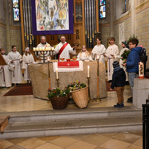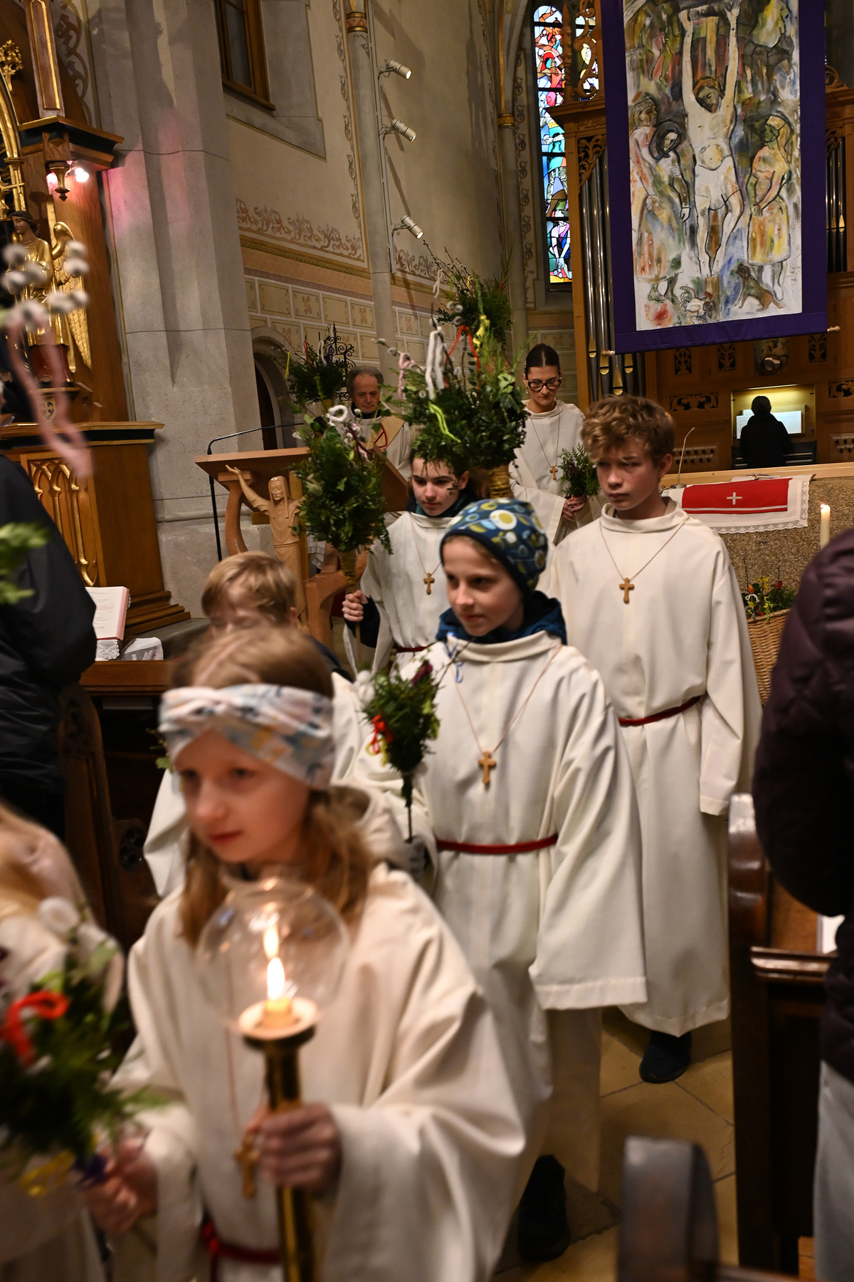Nachdem die Liturgie witterungsbedingt nicht am neuen Friedhof beginnen konnte und damit auch die feierliche Palmprozession rund um die Kirche wegfiel, winkten und wedelten viele Kinder und Erwachsene mit ihrem Palmbuschen bei dem Lied "Singt dem König Freudenpsalmen“.