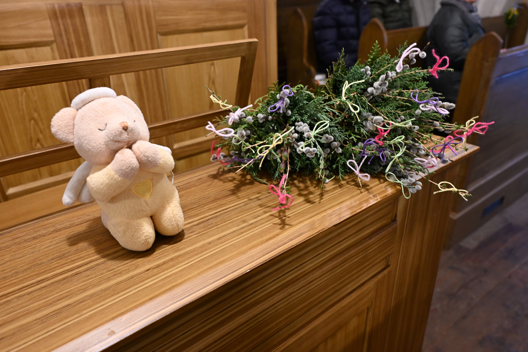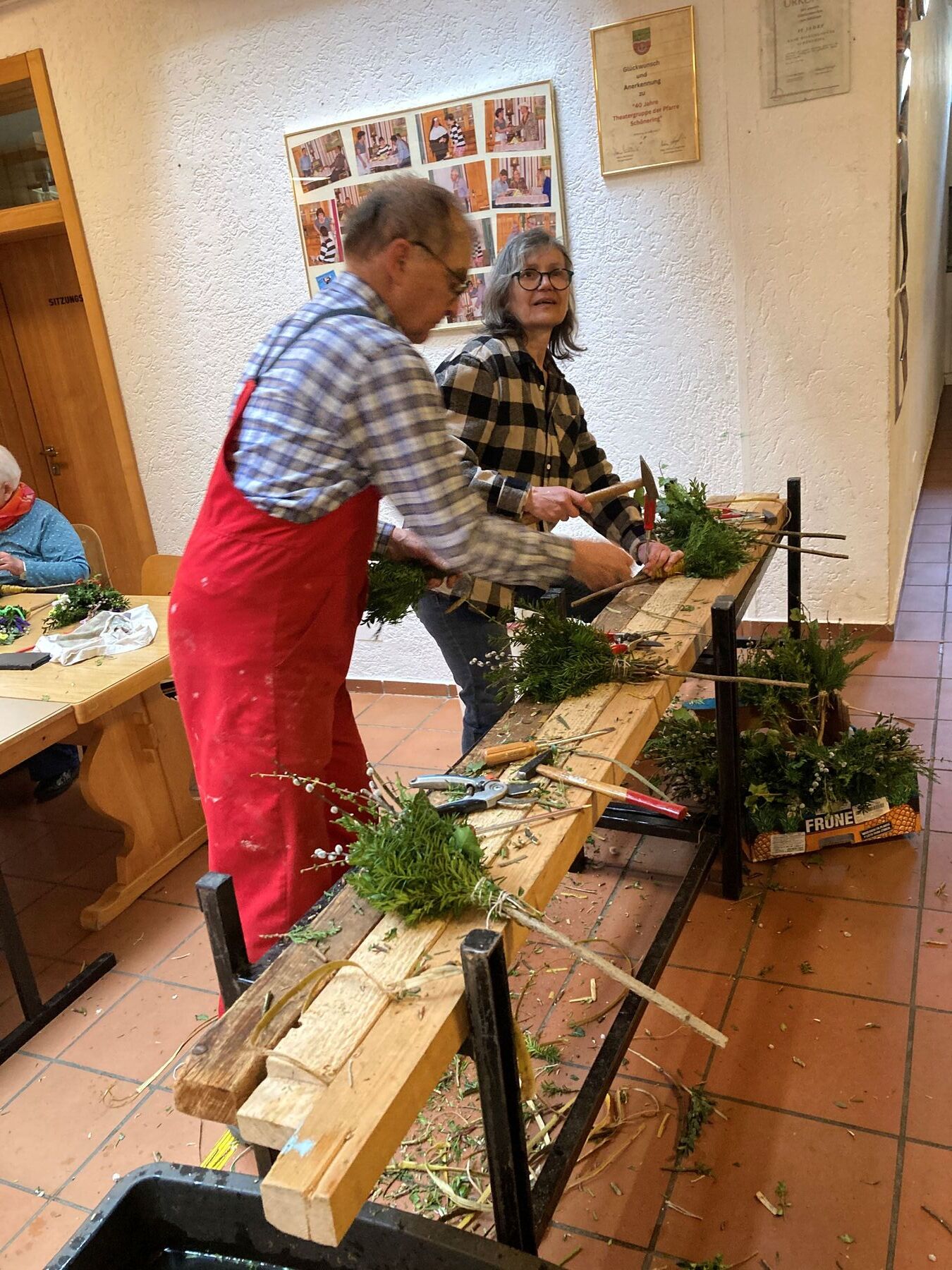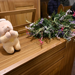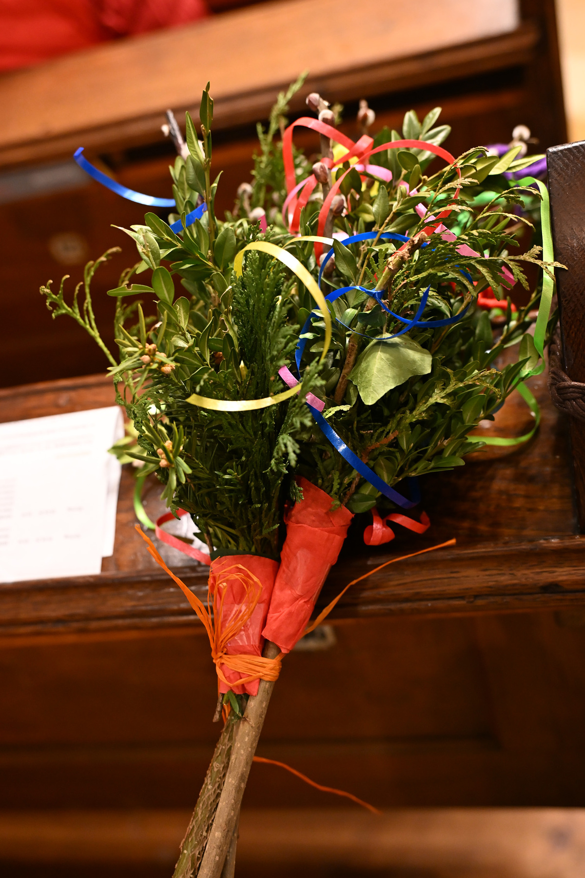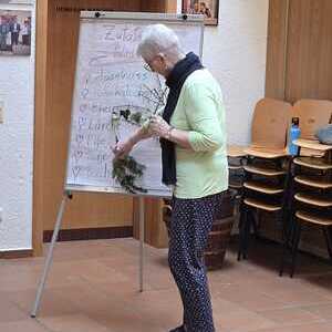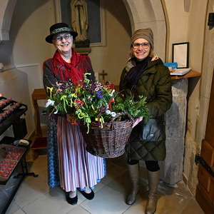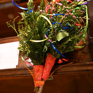 Als Zeichen, dass wir uns zu Jesus bekennen, wurden zu Beginn der Feier die Palmzweige von Wolfgang und Hans gesegnet: "Mit ihnen folgen wir Jesus, unseren Herrn und König des Friedens. Das frische Grün und die Buntheit der Palmbuschen sind ein Symbol der Hoffnung, dass am Ende alles gut werden wird."
