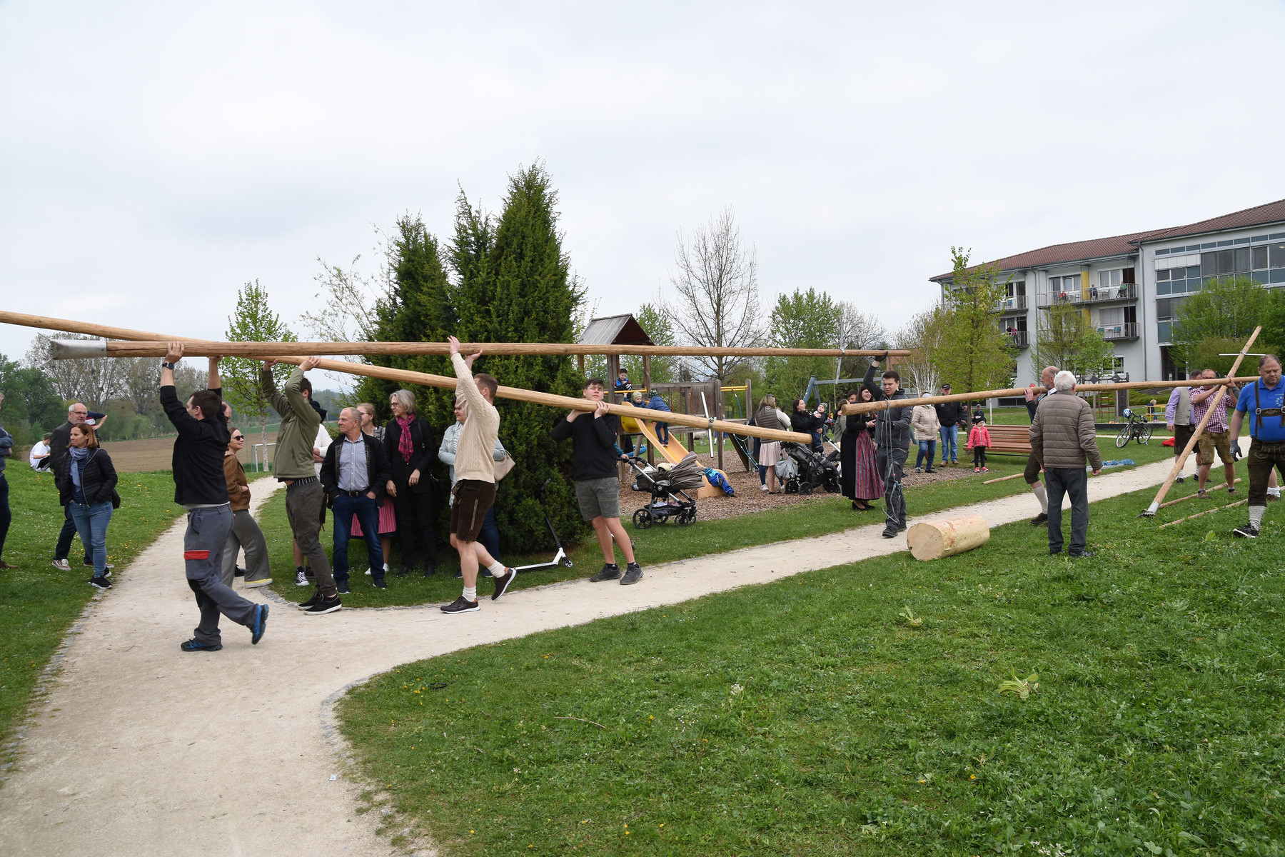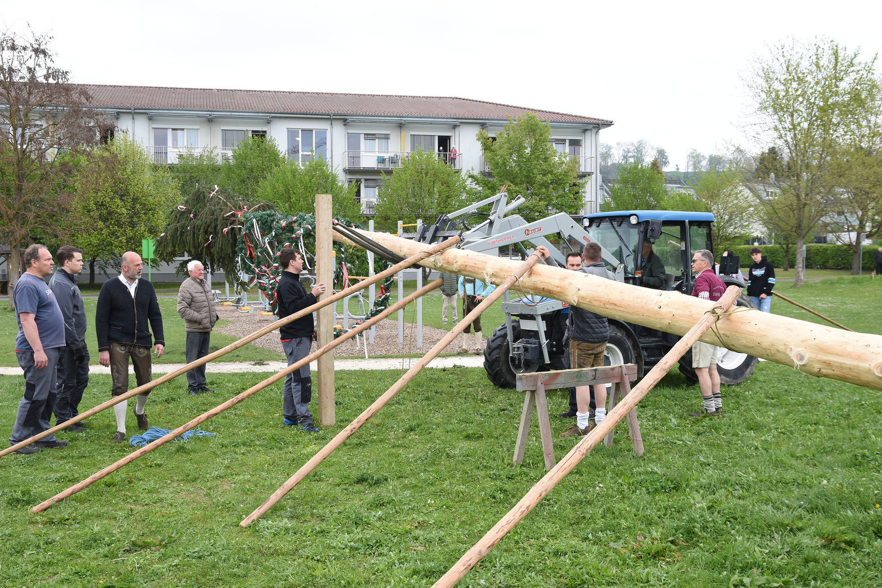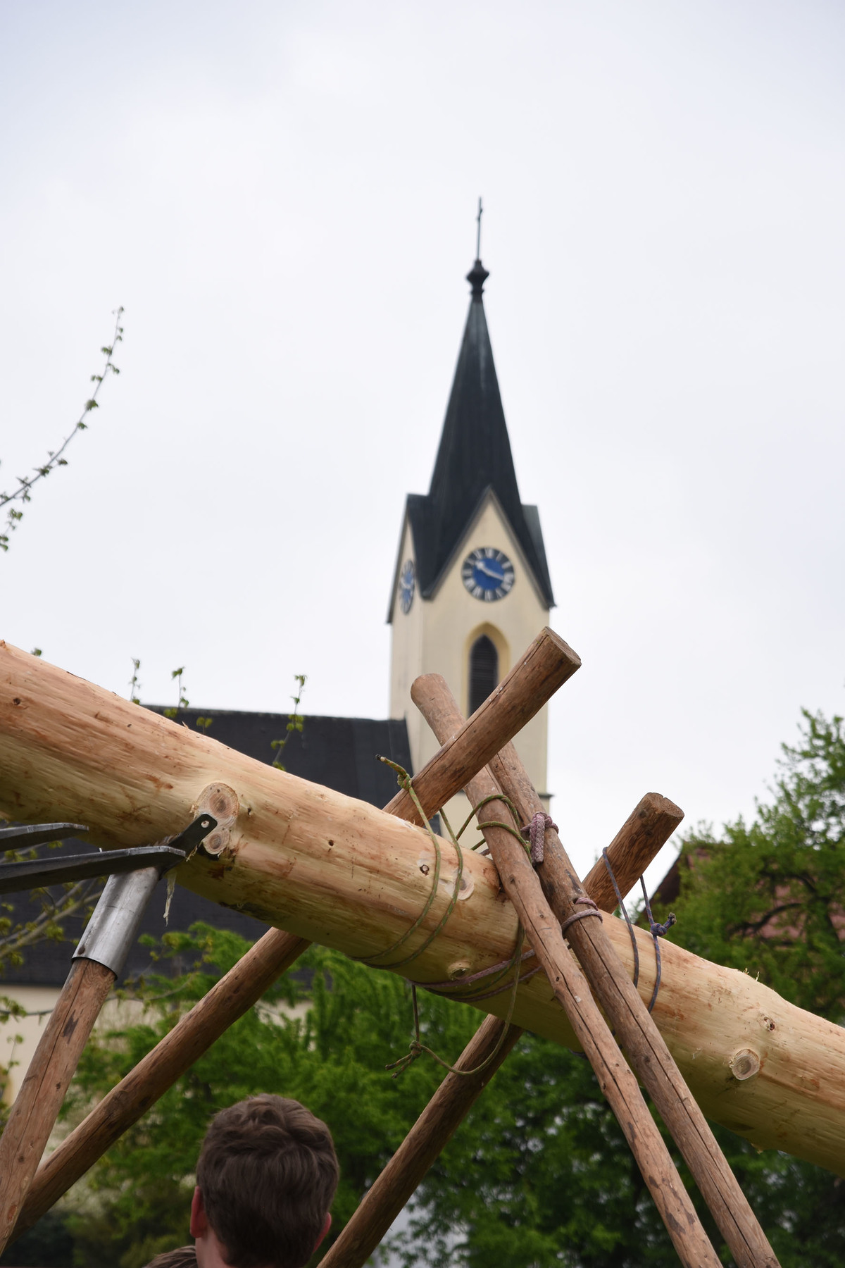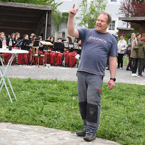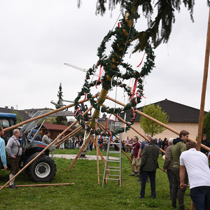 Nach dem Gottesdienst versammelten sich die Mitfeiernden am Dorfplatz und sahen zu, wie der Maibaum mit purer Muskelkraft und mit Seilen und Stützbalken aufgerichtet wurde - musikalisch begleitet vom Musikverein Schönering.