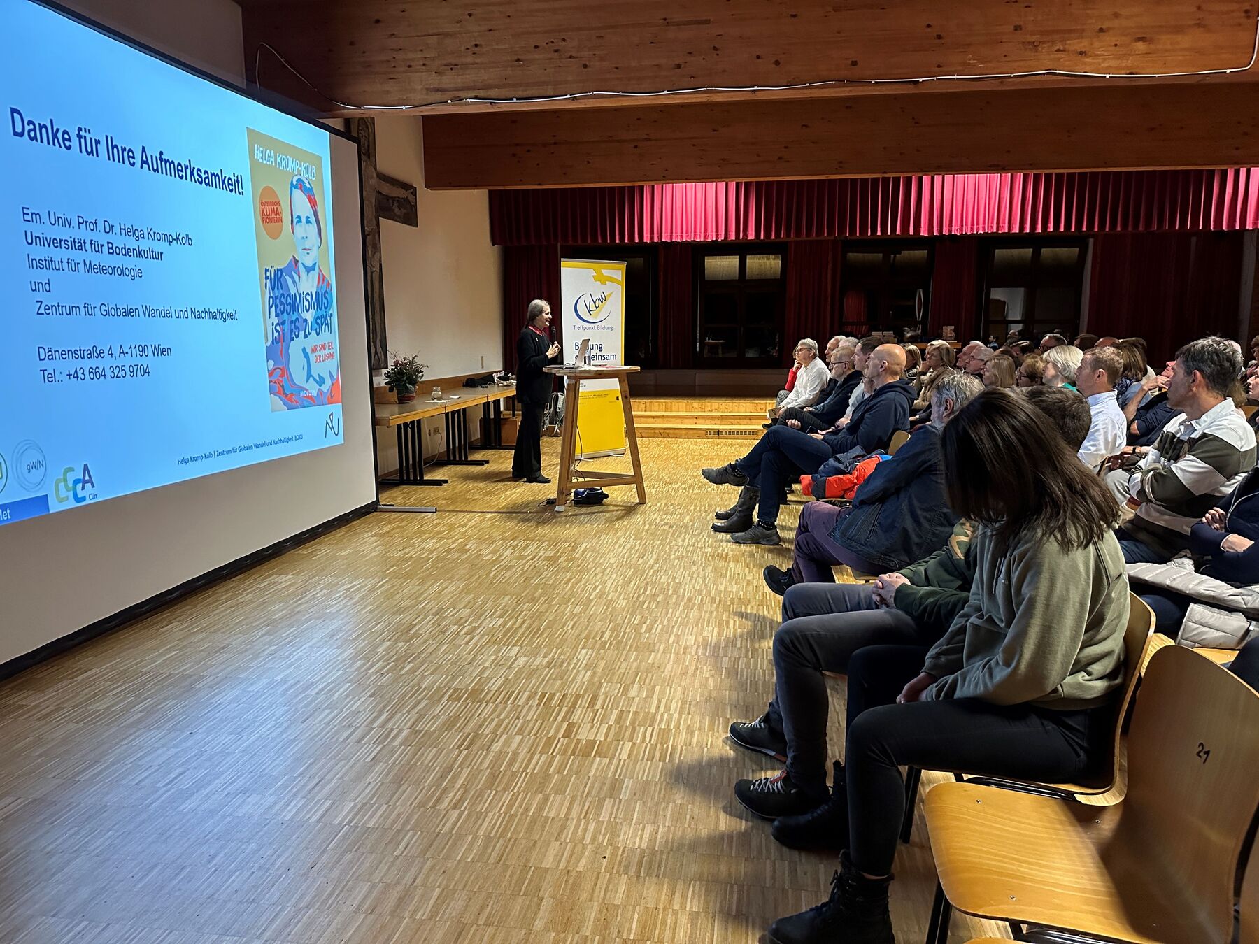 Der anschließende 1 ½-stündige Vortrag und die präsentierten wissenschaftlichen Studien zum Klimawandel fesselten sichtlich die vielen Zuhörerinnen und Zuhörer. Frau Kromp-Kolb spannte in ihren Ausführungen einen Bogen über den geschichtlichen Verlauf der Klimaveränderung von vor 11 Millionen Jahren bis heute. Im Gegensatz zu früher ist die klimatische Erwärmung nahezu gänzlich menschengemacht und erfolgt in einem atemberaubenden Tempo. Die Folgen dieser Veränderungen sind unübersehbar und auch spürbar. Wir sind die Generation, die den Klimawandel in erster Linie zu verantworten hat und die gleichzeitig die ersten Auswirkungen zu spüren bekommt. Wenn nicht diese Generation schon Gegenmaßnahmen ergreift, wie sieht erst dann die Zukunft der uns nachfolgenden Generation aus und darüber hinaus?