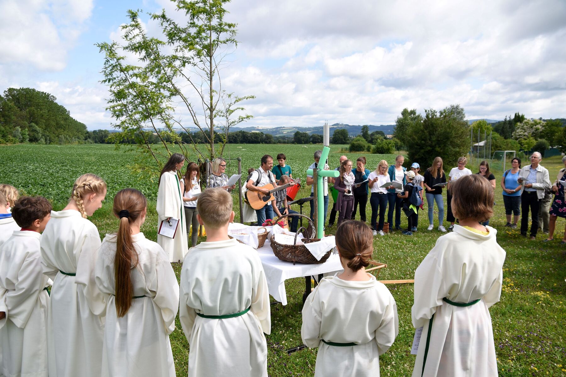 Mit diesen Denkanstößen im Gepäck und einem Leiterwagen samt dem Symbol für Glauben schlechthin, einem Kreuz gebastelt von den Jungscharkindern aus Schwimmnudeln, machten wir uns, unterstützt durch zahlreiche fröhliche Ministrantinnen und Ministranten, singend und uns austauschend, woran wir glauben, was unsere Glaubenssätze sind, woran wir uns jeweils festhalten, auf zur nächsten Station auf der Dorfwiese. Auf dem Weg hatten wir die Gelegenheit, auf Plakaten unsere Gedanken festzuhalten.