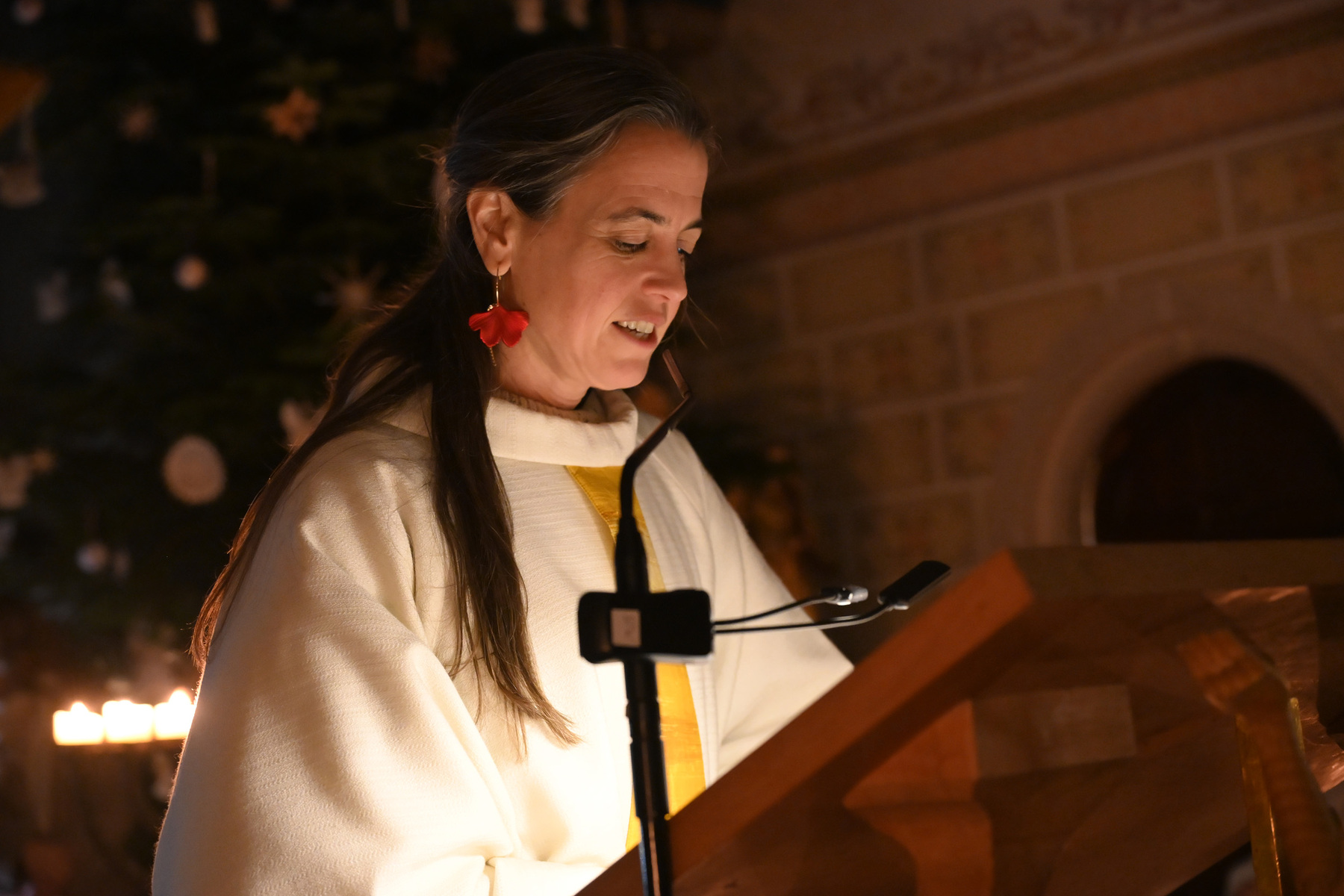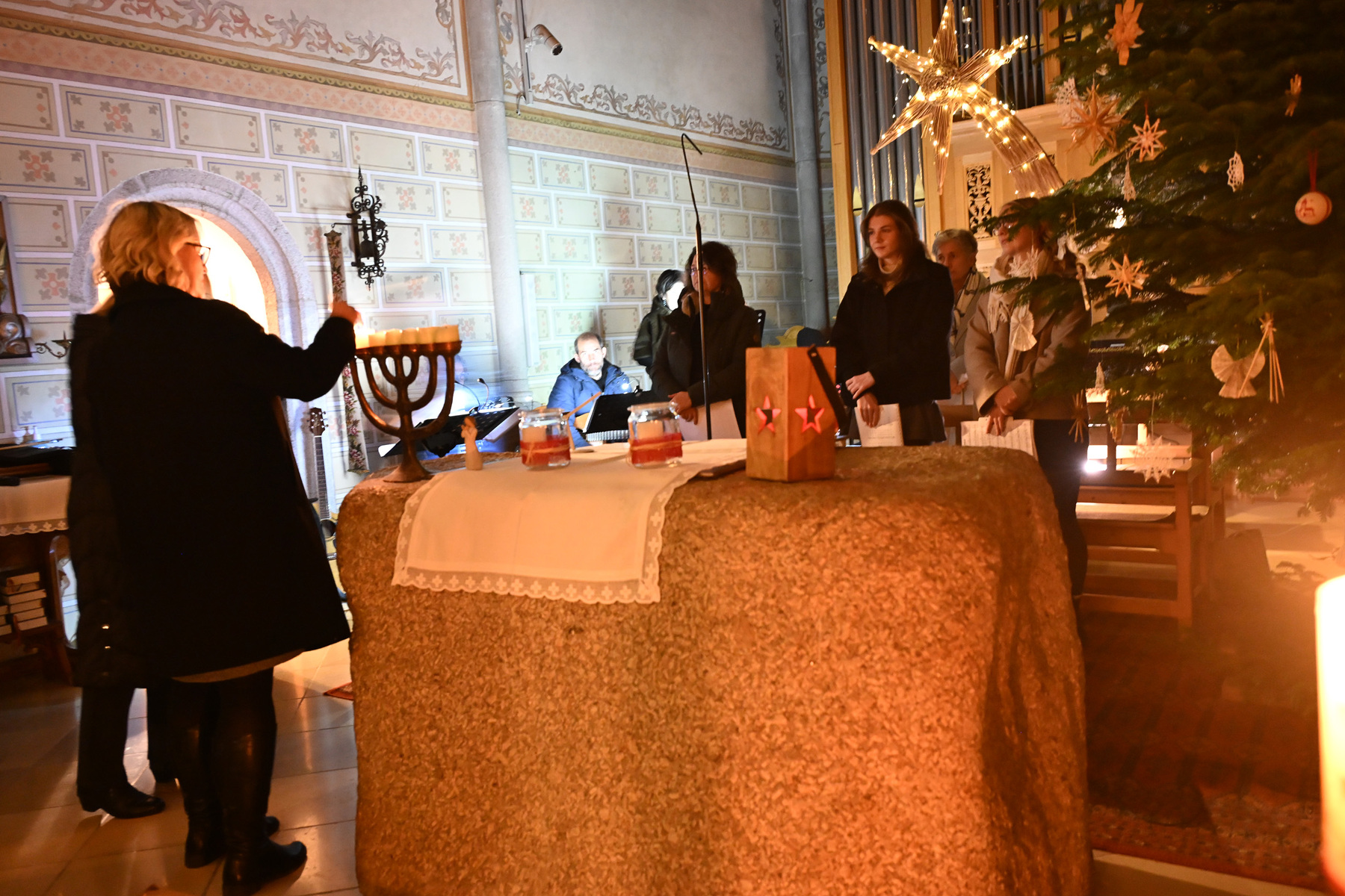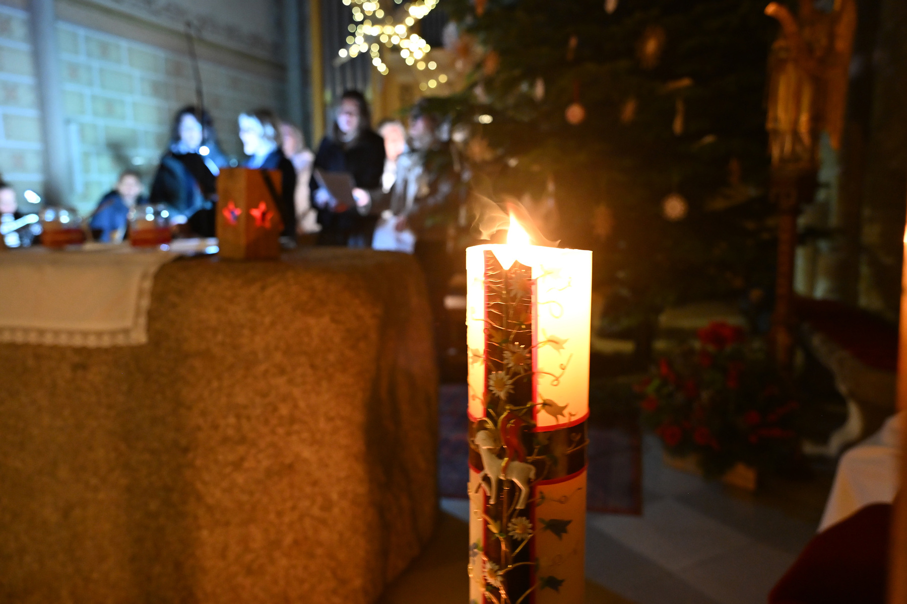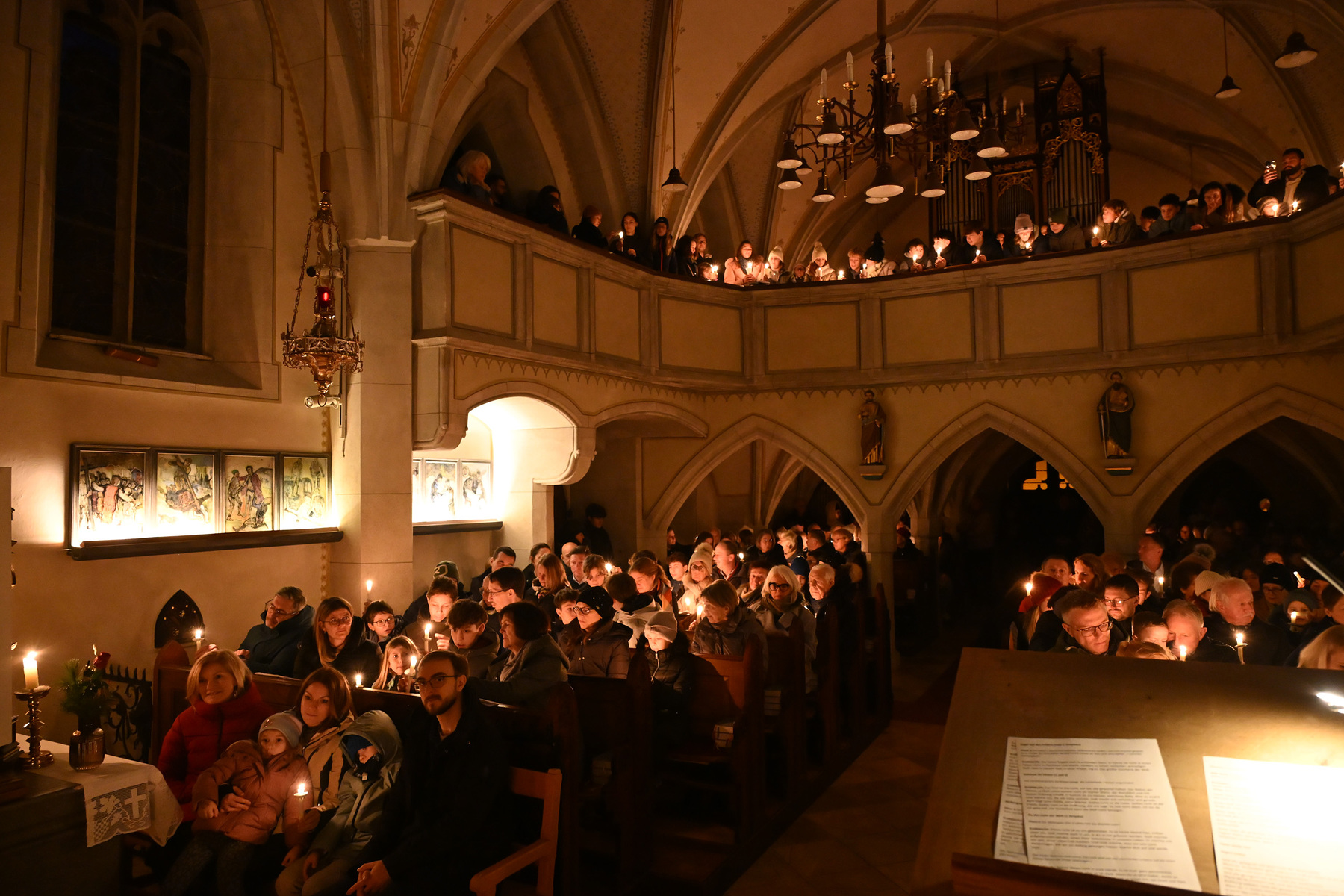 Aus der Dunkelheit wurde die Sehnsucht nach Licht. Ein Stern ging auf als erstes Zeichen. Die Geburt eines Kindes brachte warmes Leuchten. Diese Lichter wurden dann weitergegeben zu einem stimmungsvollen Lichtermeer, das die ganze Kirche erfüllte. Es war die wie alljährlich die „Kulisse“ für das Stille-Nacht-Lied.
