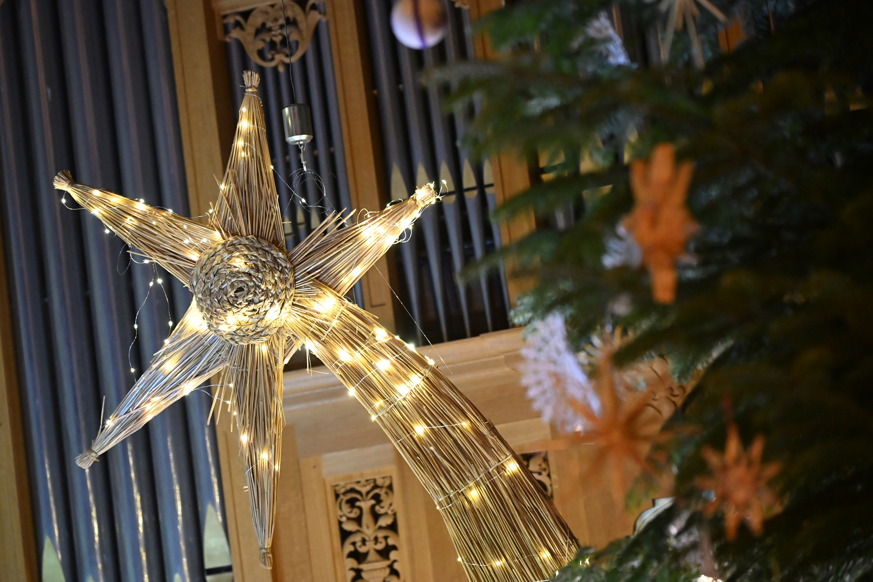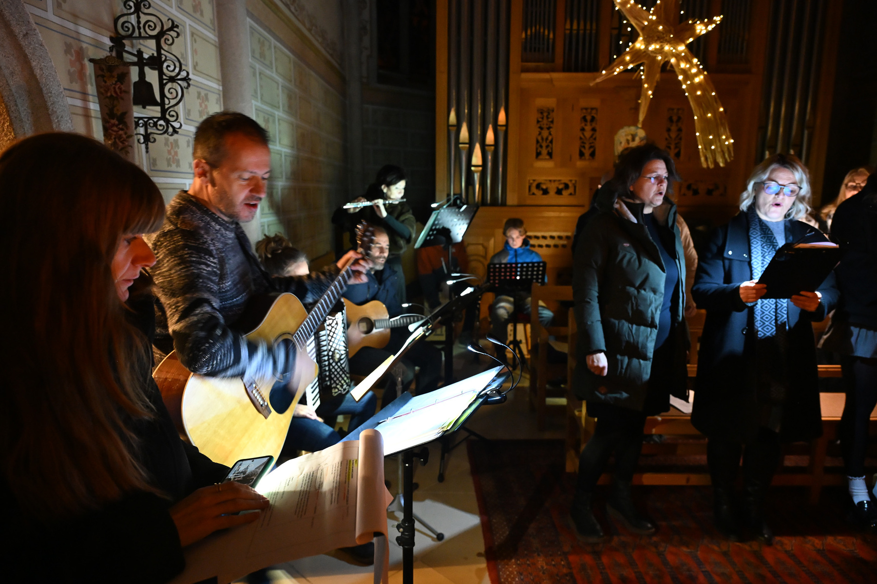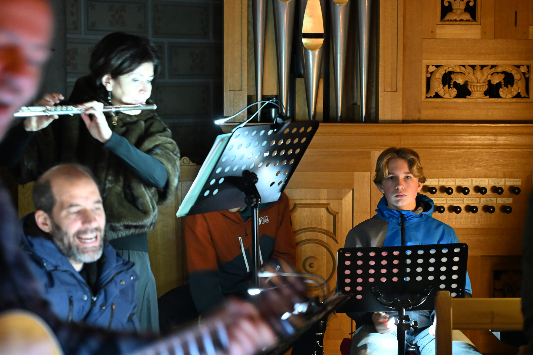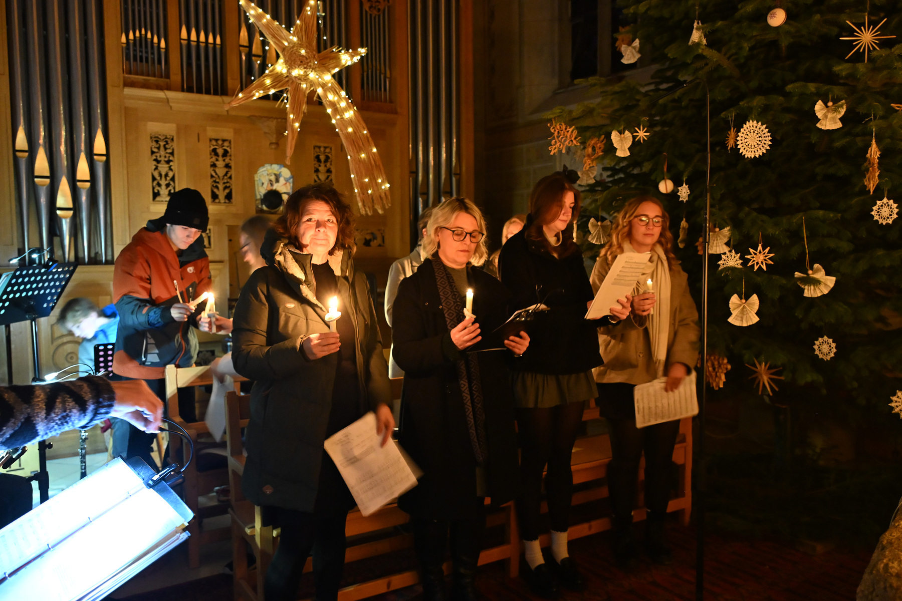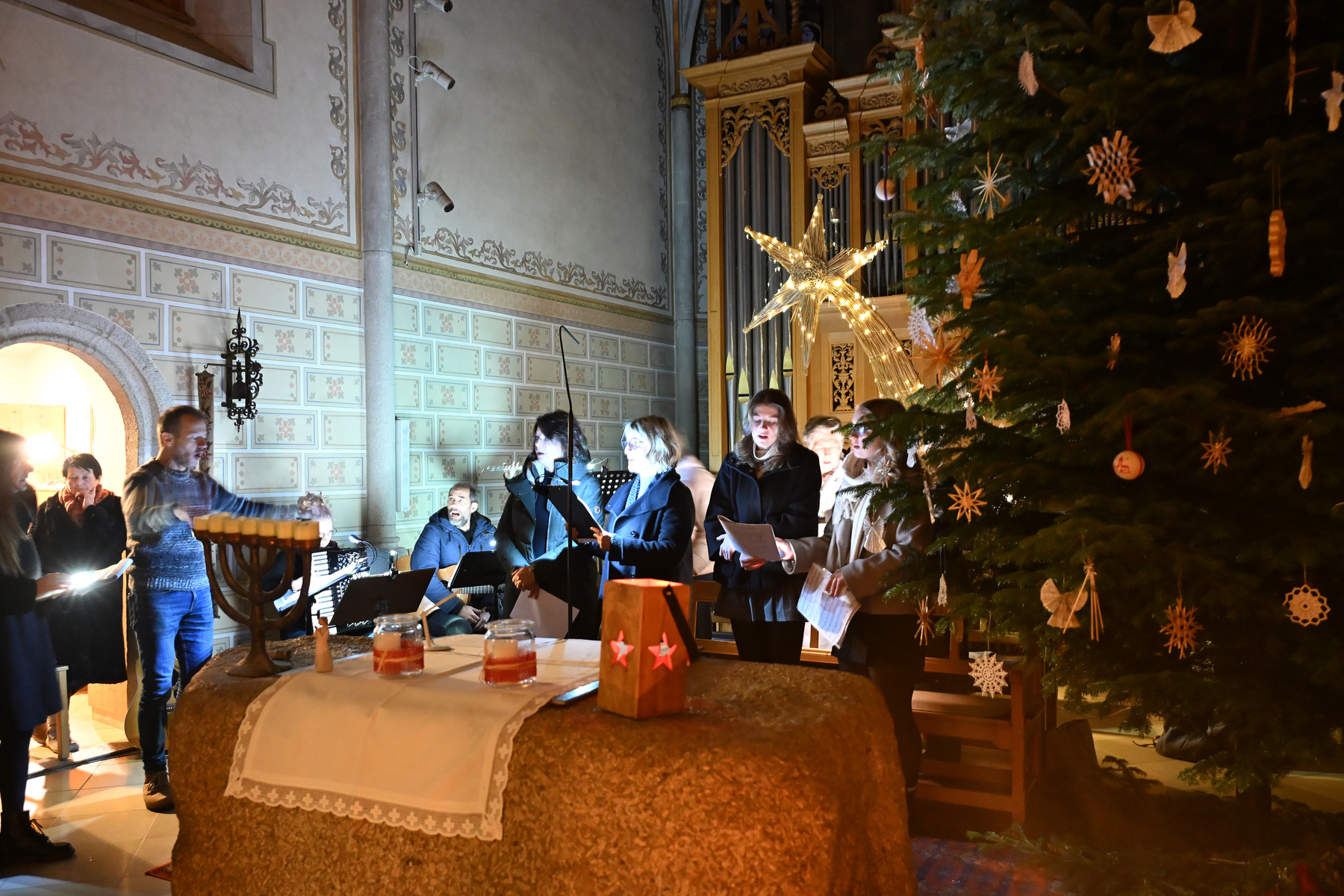 Aus der Dunkelheit wurde die Sehnsucht nach Licht. Ein Stern ging auf als erstes Zeichen. Die Geburt eines Kindes brachte warmes Leuchten. Diese Lichter wurden dann weitergegeben zu einem stimmungsvollen Lichtermeer, das die ganze Kirche erfüllte. Es war die wie alljährlich die „Kulisse“ für das Stille-Nacht-Lied.