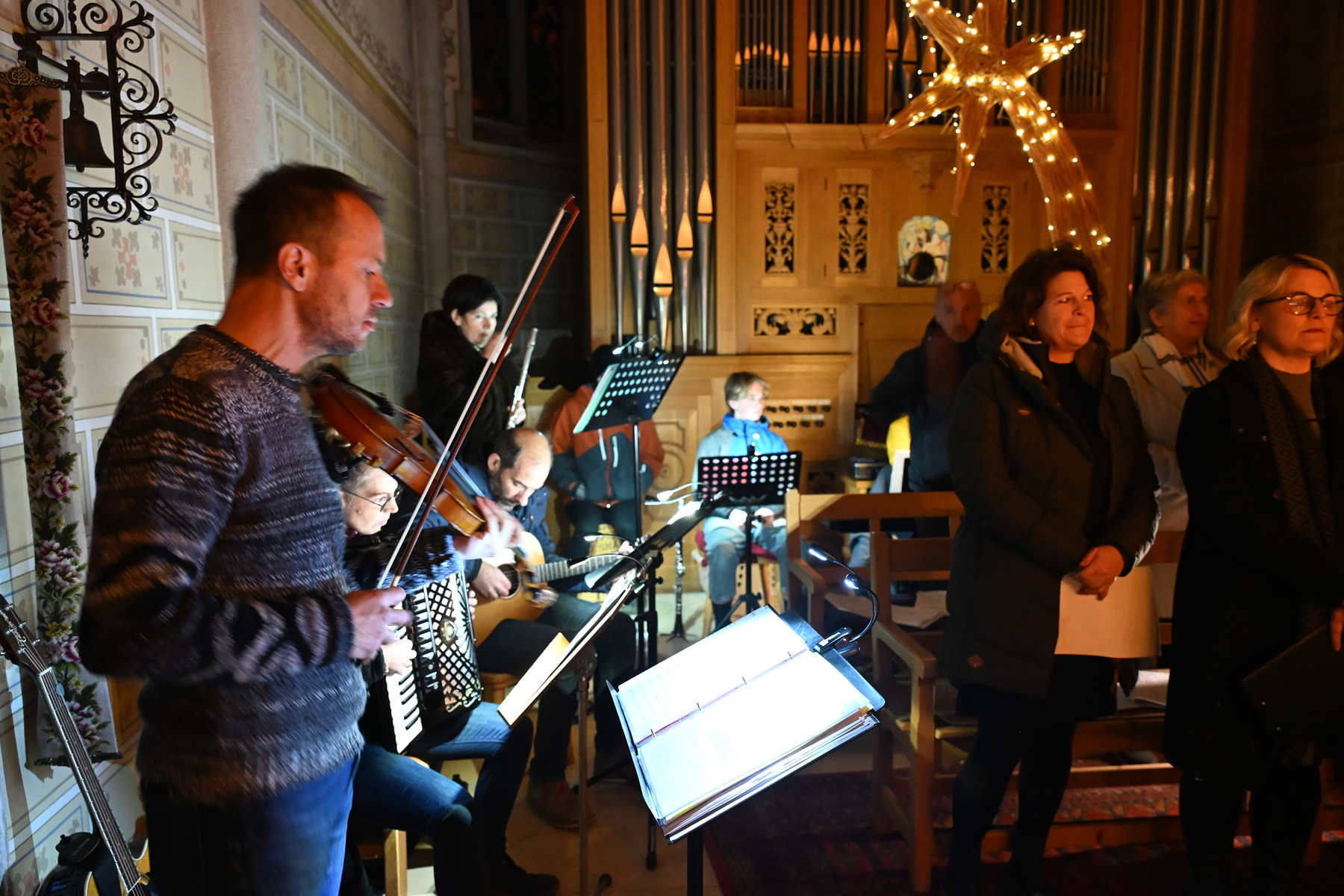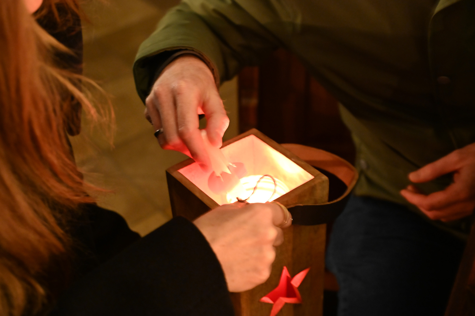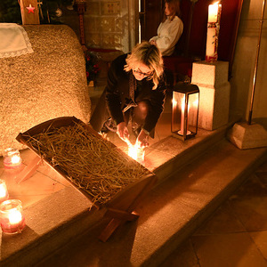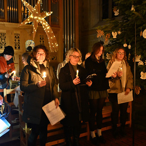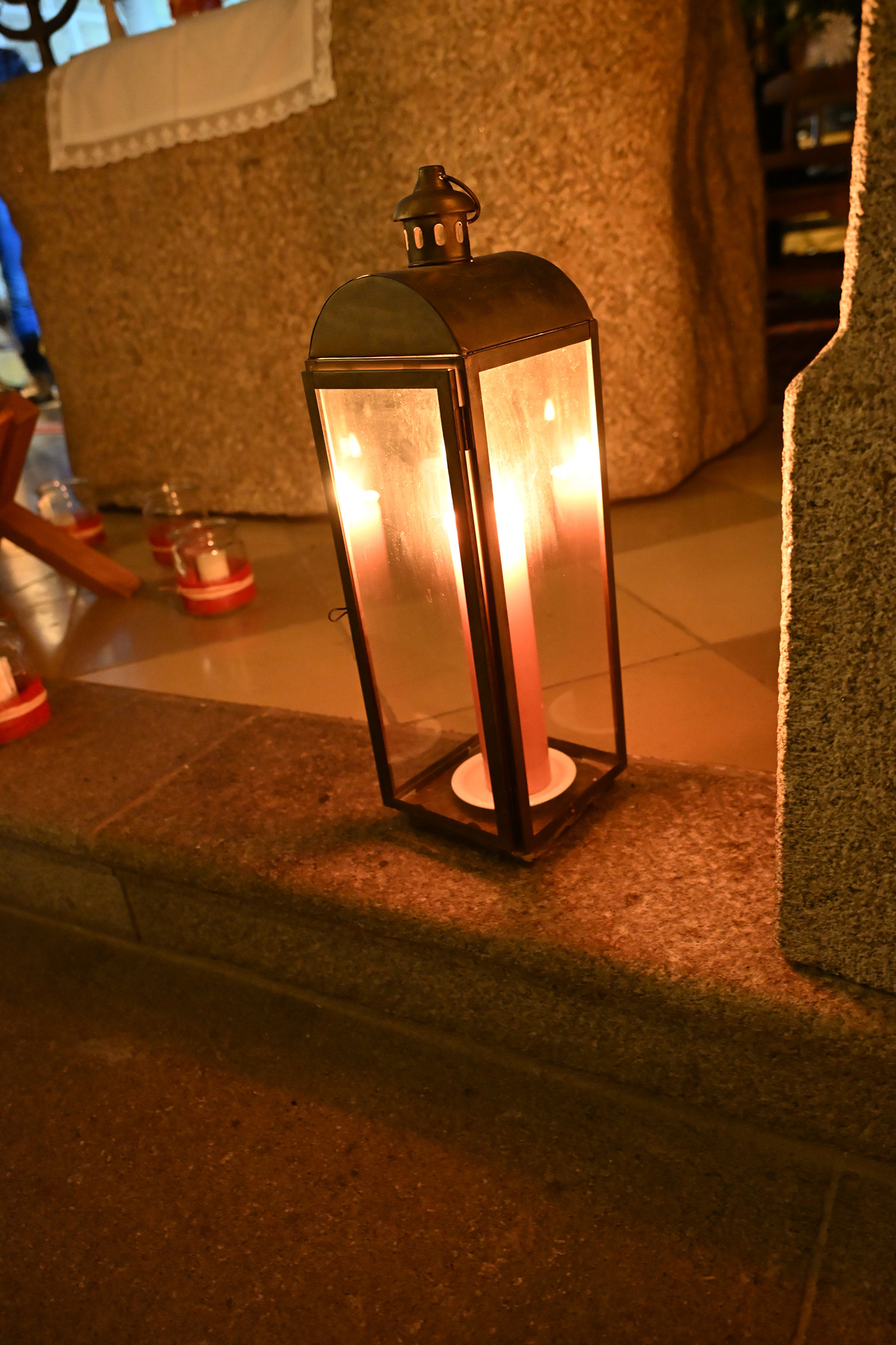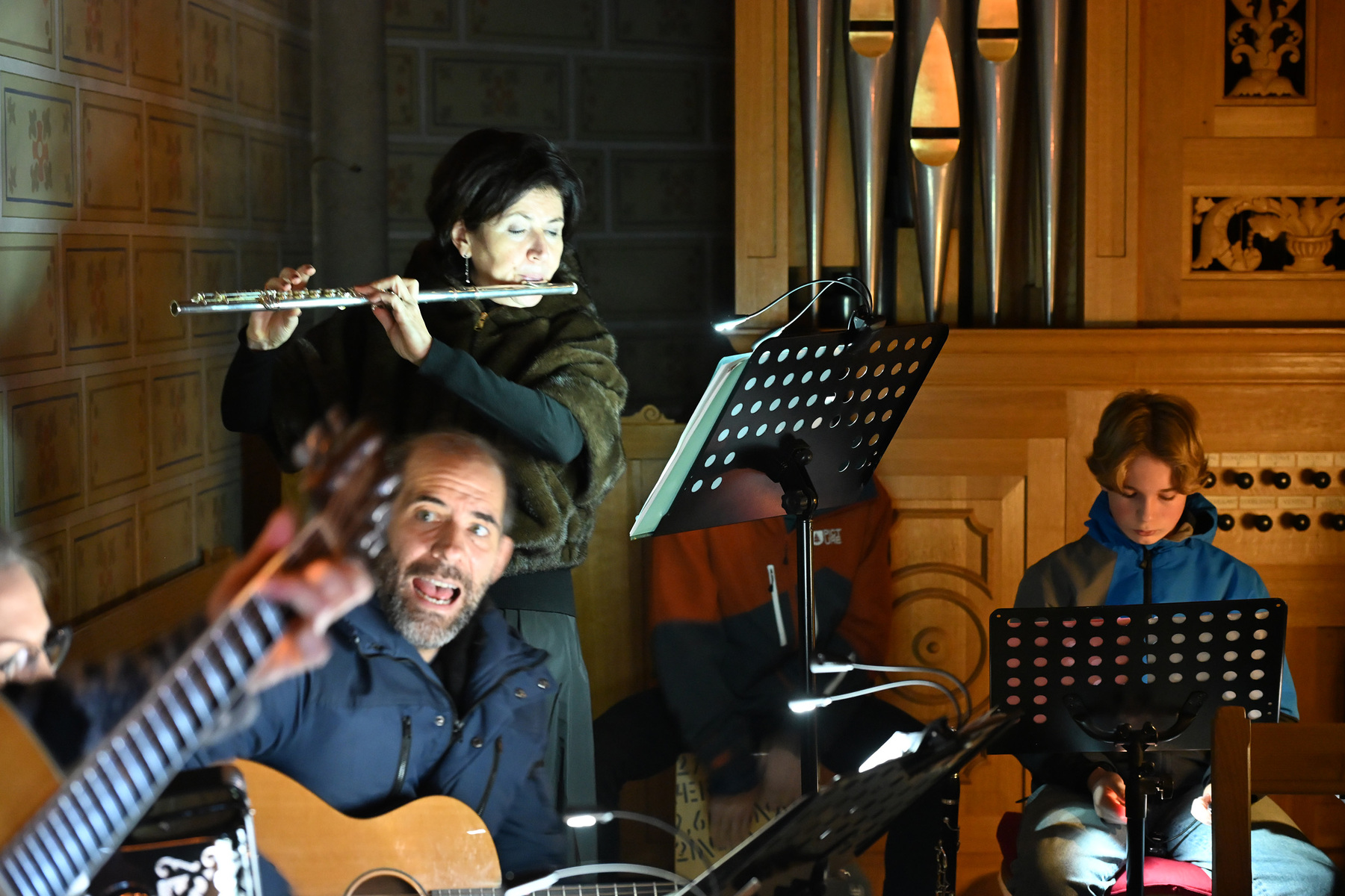 Aus der Dunkelheit wurde die Sehnsucht nach Licht. Ein Stern ging auf als erstes Zeichen. Die Geburt eines Kindes brachte warmes Leuchten. Diese Lichter wurden dann weitergegeben zu einem stimmungsvollen Lichtermeer, das die ganze Kirche erfüllte. Es war die wie alljährlich die „Kulisse“ für das Stille-Nacht-Lied.