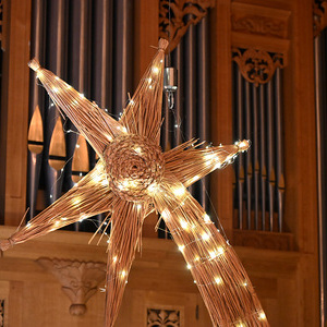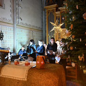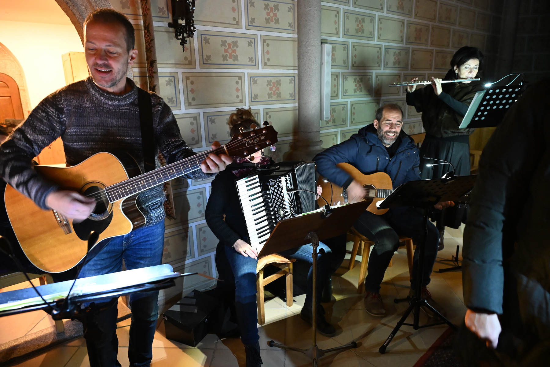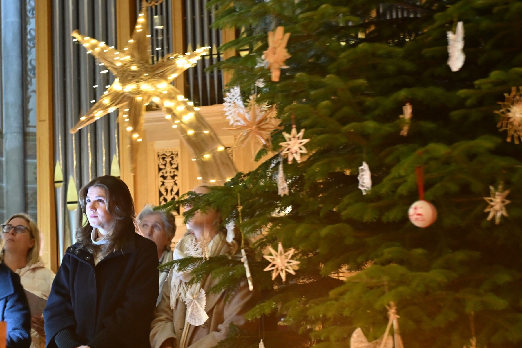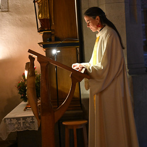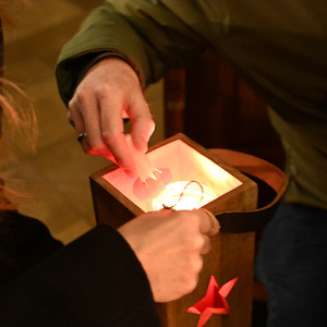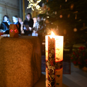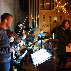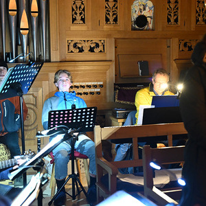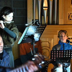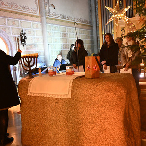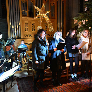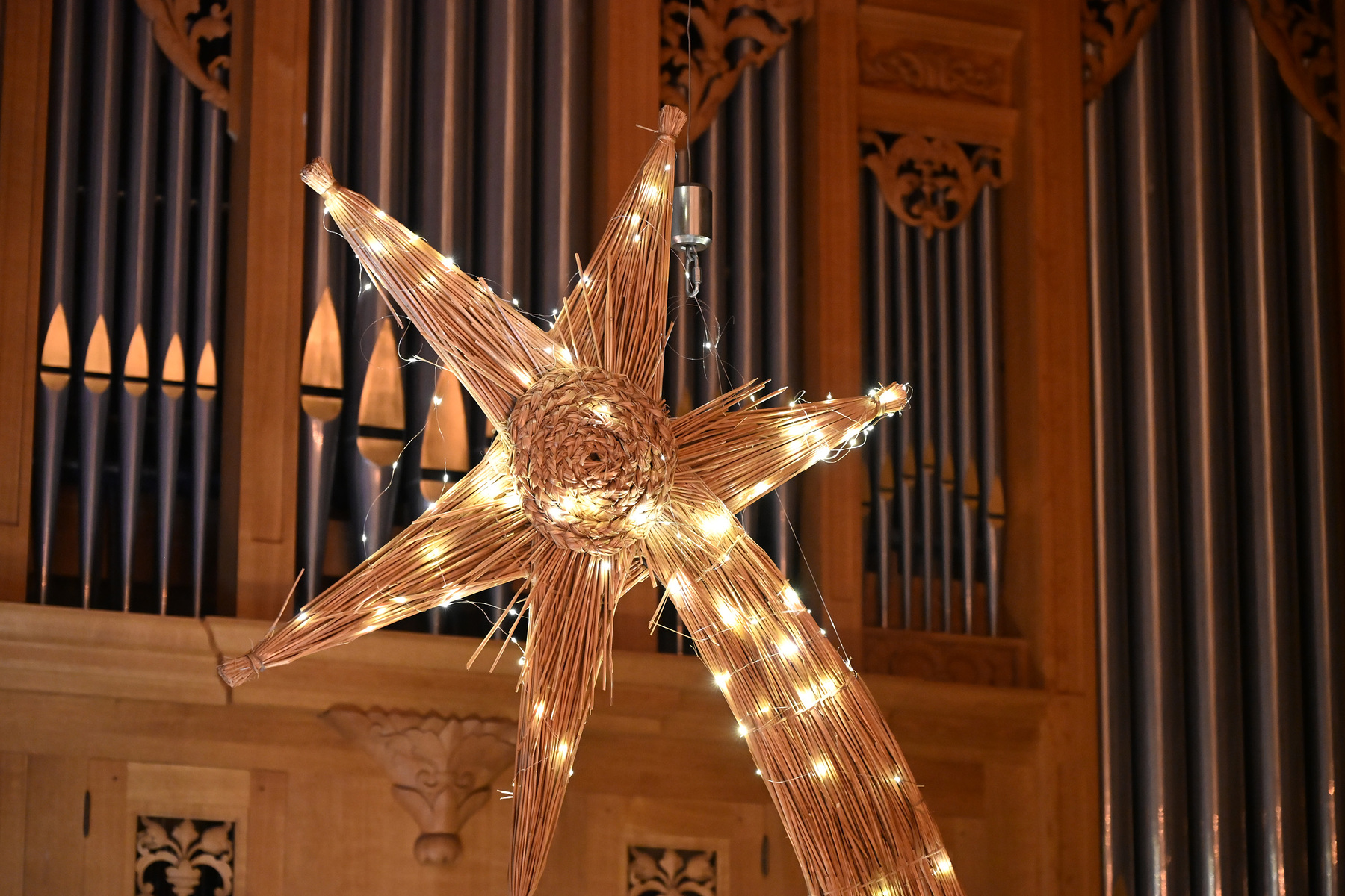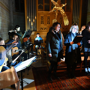 Aus der Dunkelheit wurde die Sehnsucht nach Licht. Ein Stern ging auf als erstes Zeichen. Die Geburt eines Kindes brachte warmes Leuchten. Diese Lichter wurden dann weitergegeben zu einem stimmungsvollen Lichtermeer, das die ganze Kirche erfüllte. Es war die wie alljährlich die „Kulisse“ für das Stille-Nacht-Lied.
