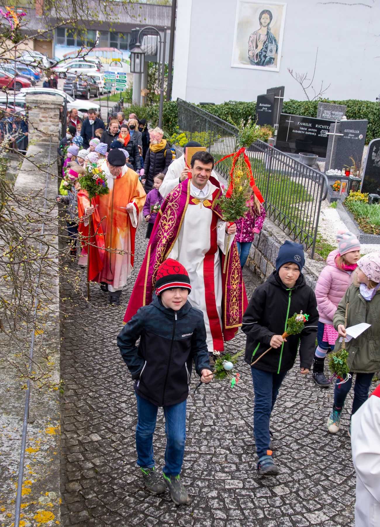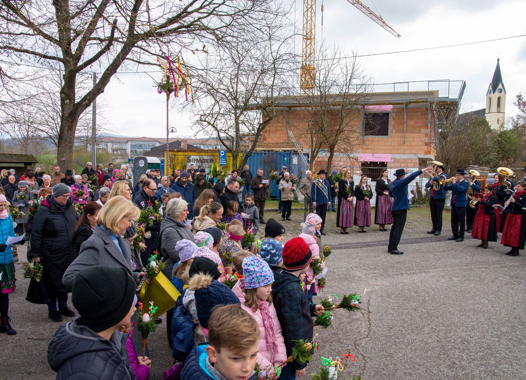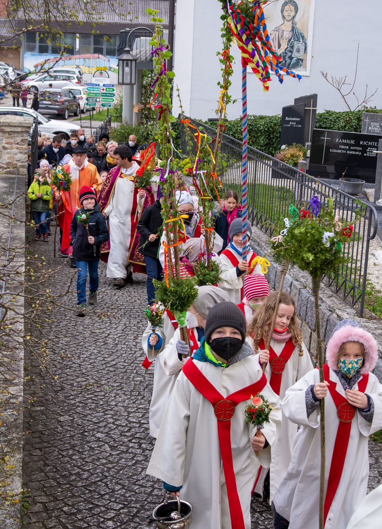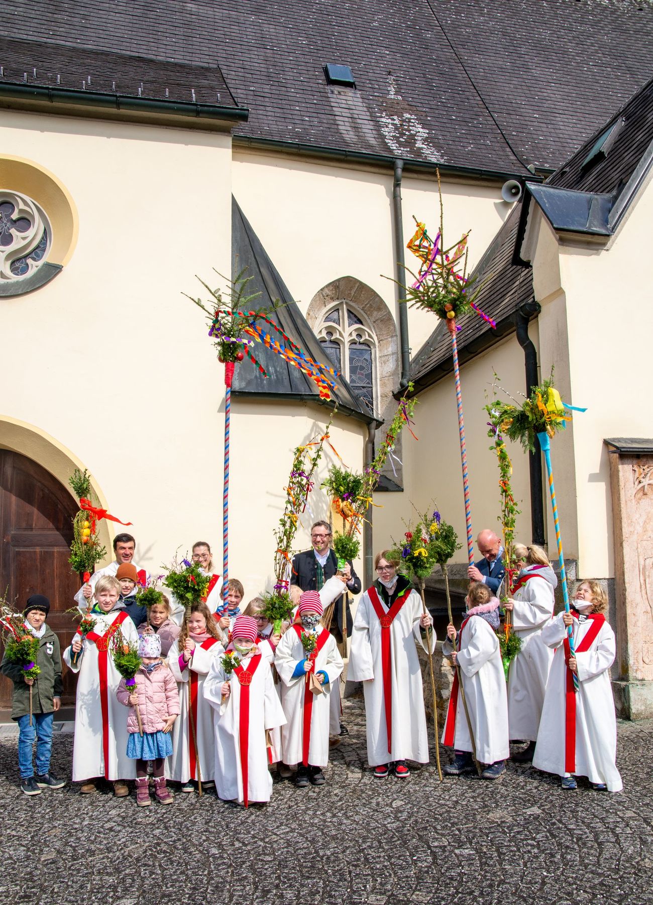 Eine Vielfalt an nach heimatlicher Tradition gebundener Palmbuschen und -stangen schmückten am 10. April 2022 die schöne Feier des Palmsonntags am Pfarrplatz und in der Pfarrkirche Schönering.