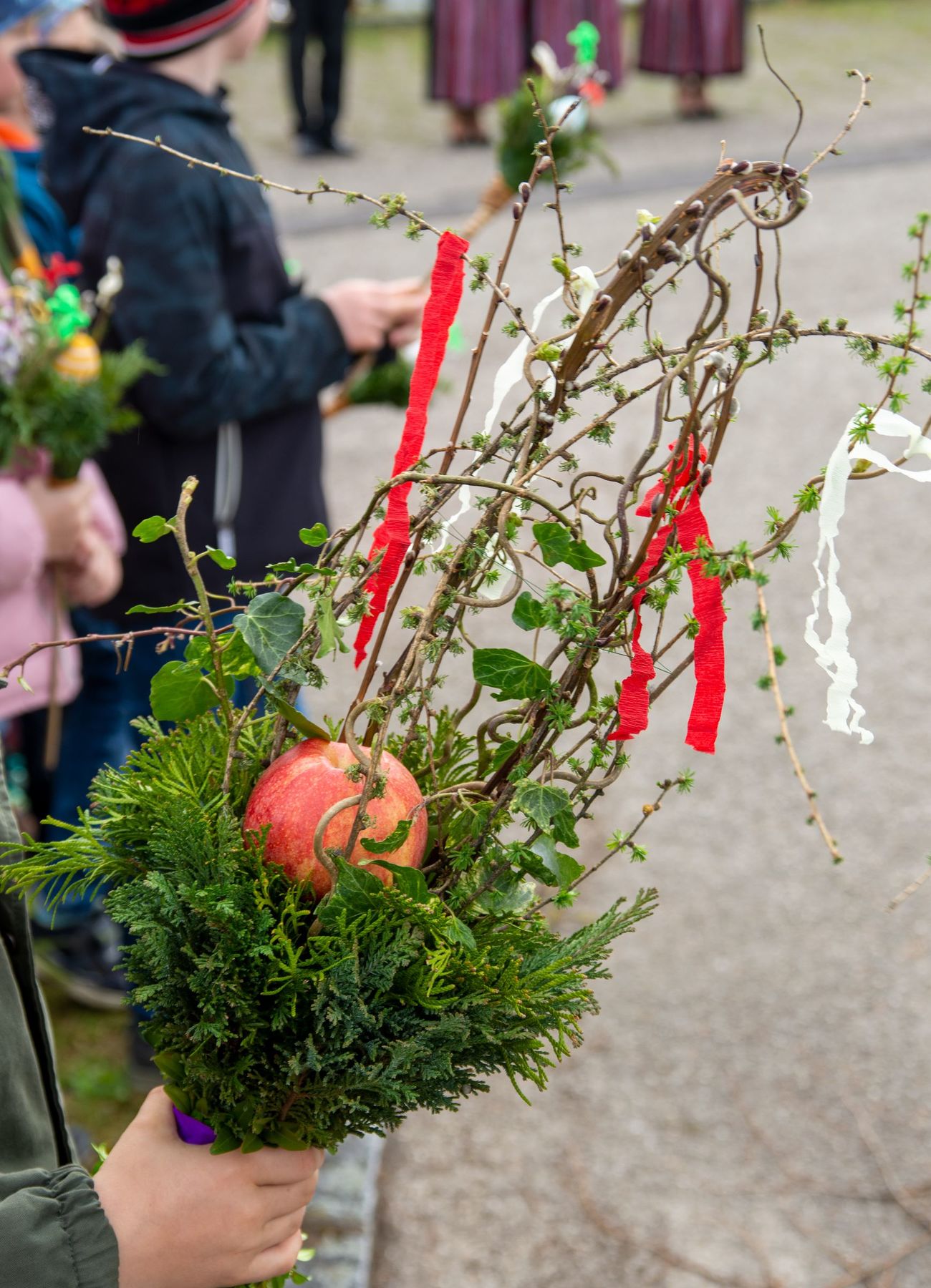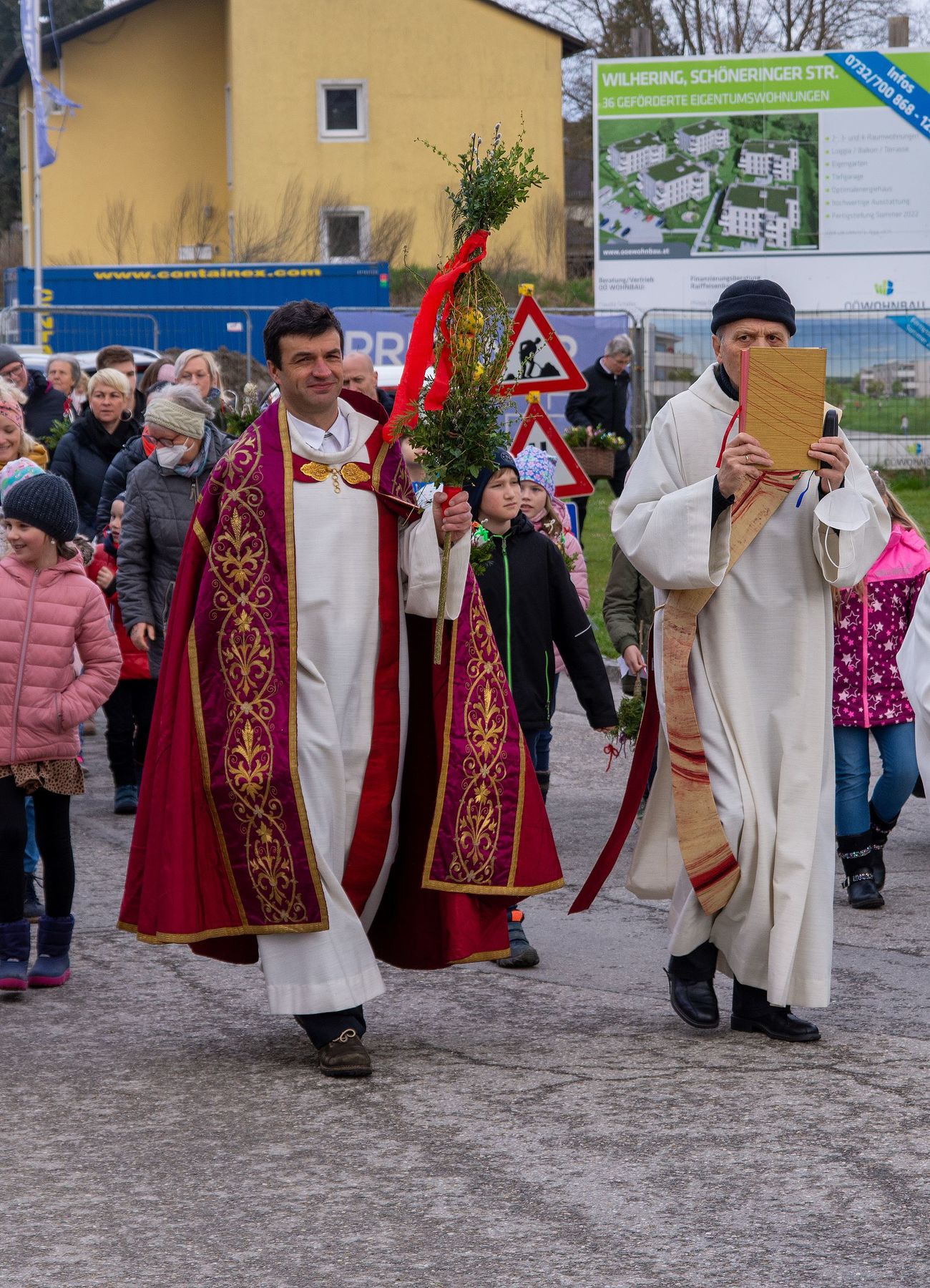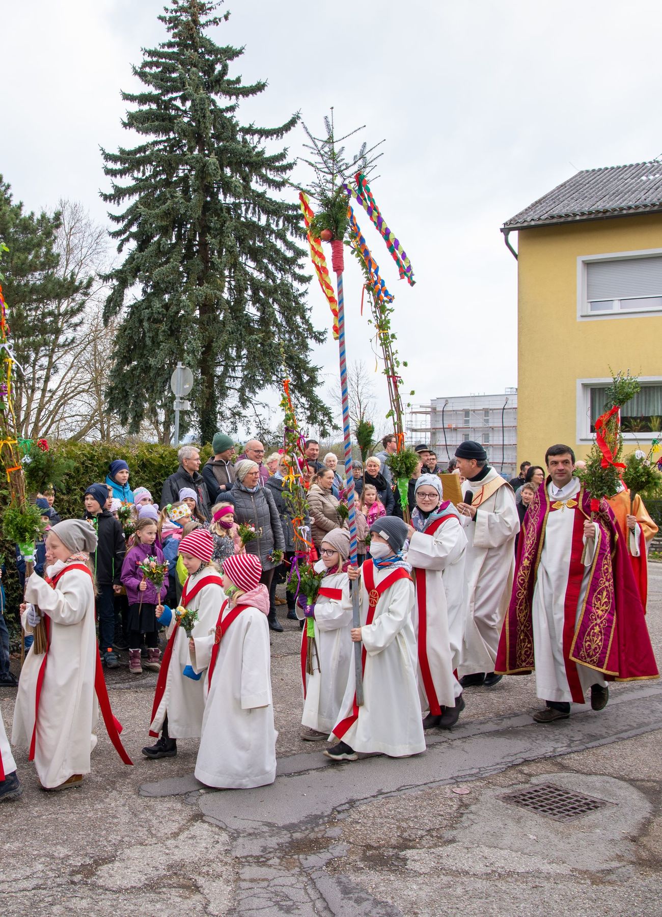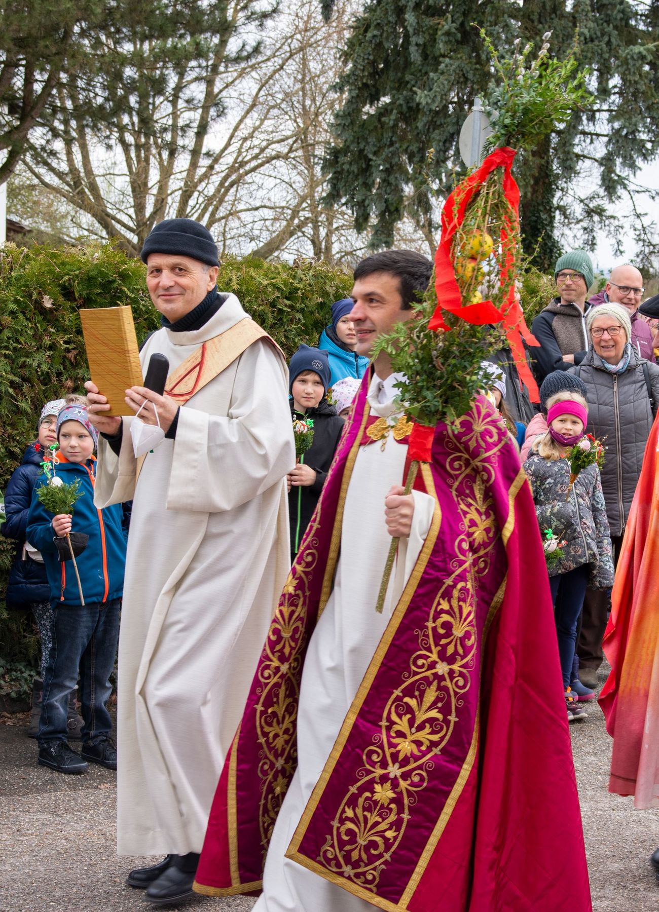 Eine Vielfalt an nach heimatlicher Tradition gebundener Palmbuschen und -stangen schmückten am 10. April 2022 die schöne Feier des Palmsonntags am Pfarrplatz und in der Pfarrkirche Schönering.