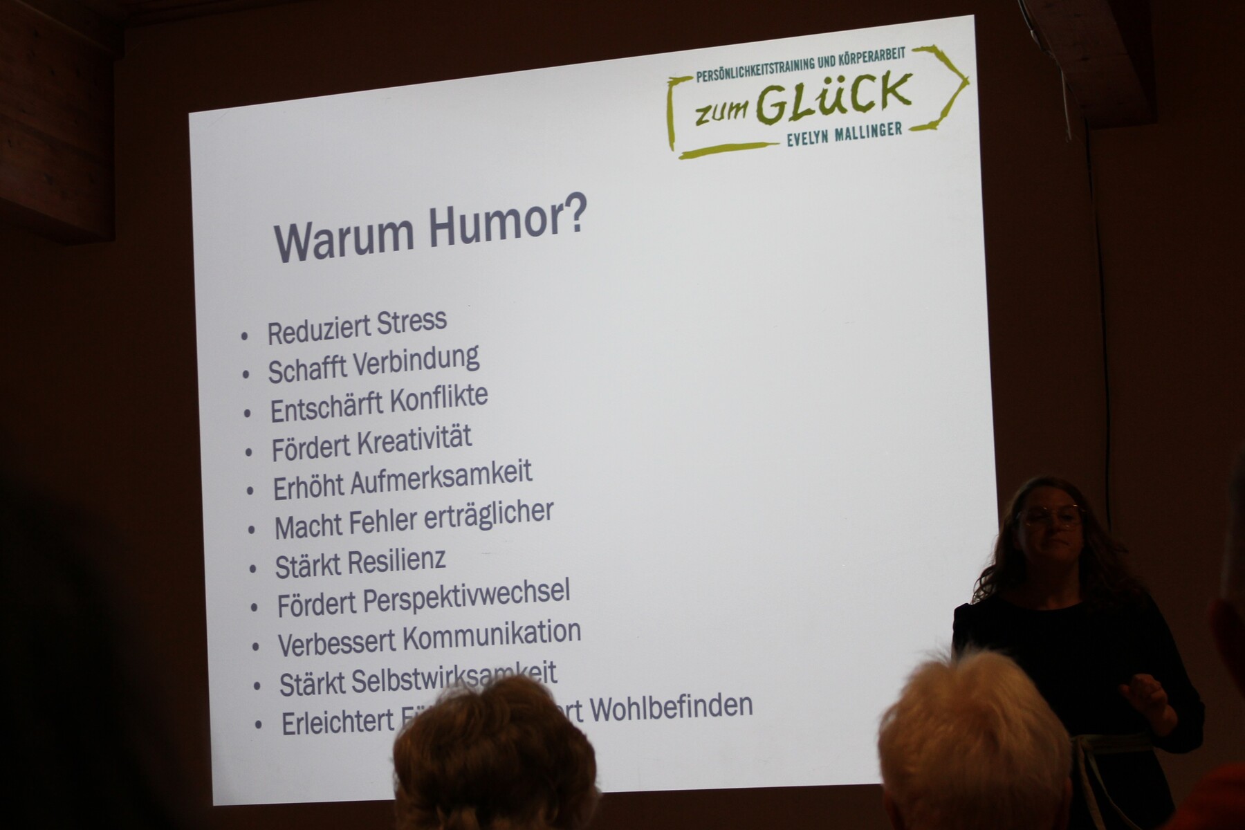Im sehr kurzweiligen und lustigen Vortrag lernte das Publikum die fünf Stufen des Humors kennen und auch Werkzeuge, wie der eigene Humor trainiert werden kann. Gespickt mit Witzen und kleinen Übungen zwischendurch wurde schnell allen klar, dass ein humorvoller Blick auf das Leben viele schwierige Situationen oft besser meistern lassen. Darüber hinaus kann Humor Konflikte entschärfen. Und nicht zuletzt ist Humor ein wirksames Mittel gegen Stress.