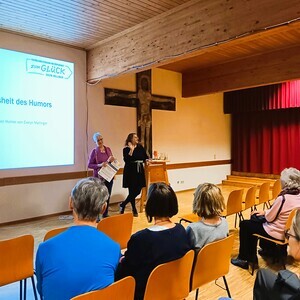 Aloisia Spitzenberger, kfb-Obfrau, stellte Evelyn Mallinger zu Beginn des humorvollen Abends vor, die - neben ihrer Tätigkeit als Bildungsmanagerin im Bildungshaus Sankt Magdalena in Linz - auch Resilienz-, Humor- und Achtsamkeitstrainerin sowie Kinesiologin und Cranio Sacral Therapeutin ist.